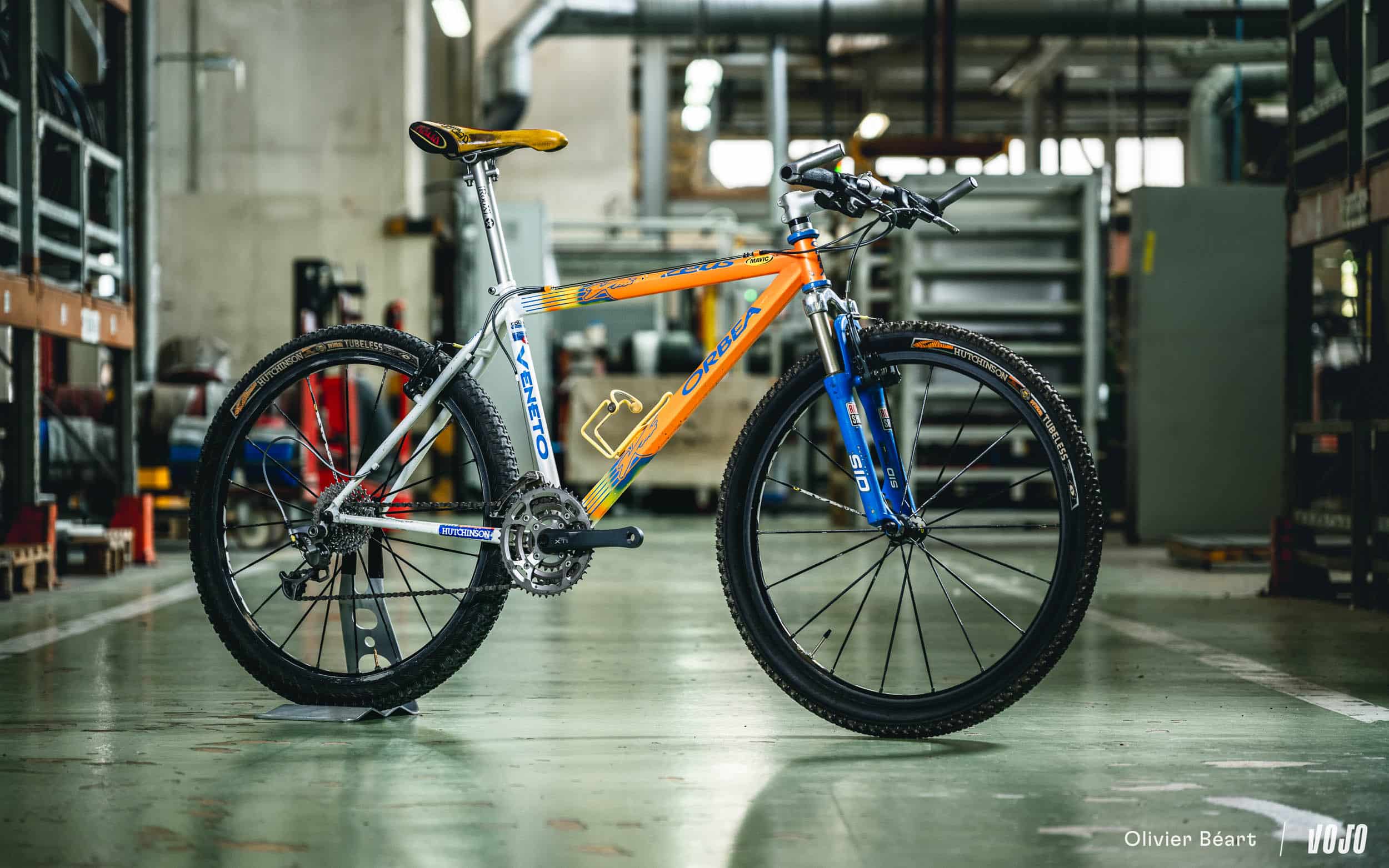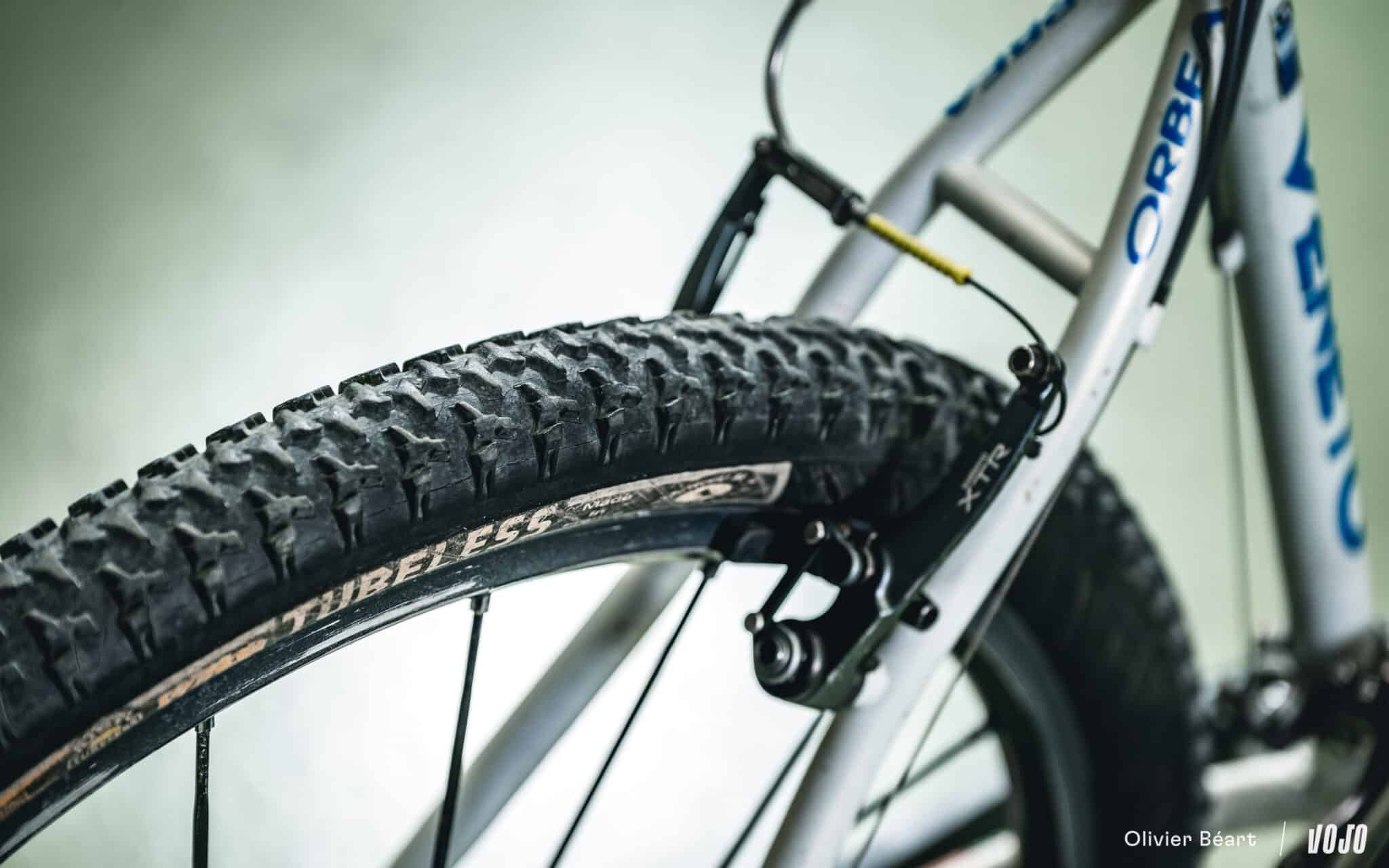 En 2000/2001, le Python est acteur d’une autre grande révolution : celle du tubeless UST. Avec Michelin, Hutchinson est l’autre grand manufacturier de pneus à se lancer dans l’aventure avec Mavic. Et le team Orbea Zeus de l’époque a été un des premiers à être équipé de cette innovation qui allait révolutionner le VTT. Vous voyez ici le vélo du Belge Patrick Trévisan, rival de Julien Absalon en catégorie Espoirs à l’époque.