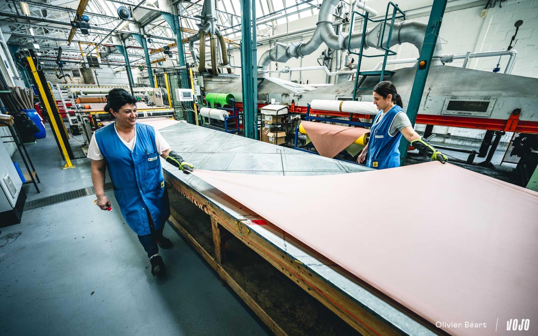 Découpe en biais de la nappe-carcasse, assemblage des différentes couches,…
