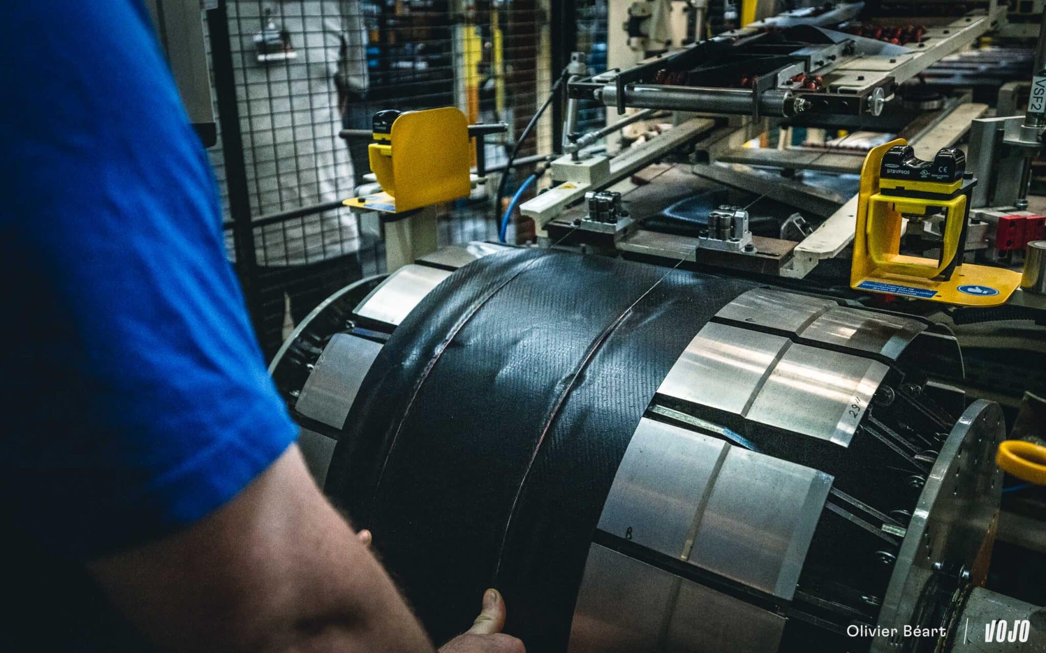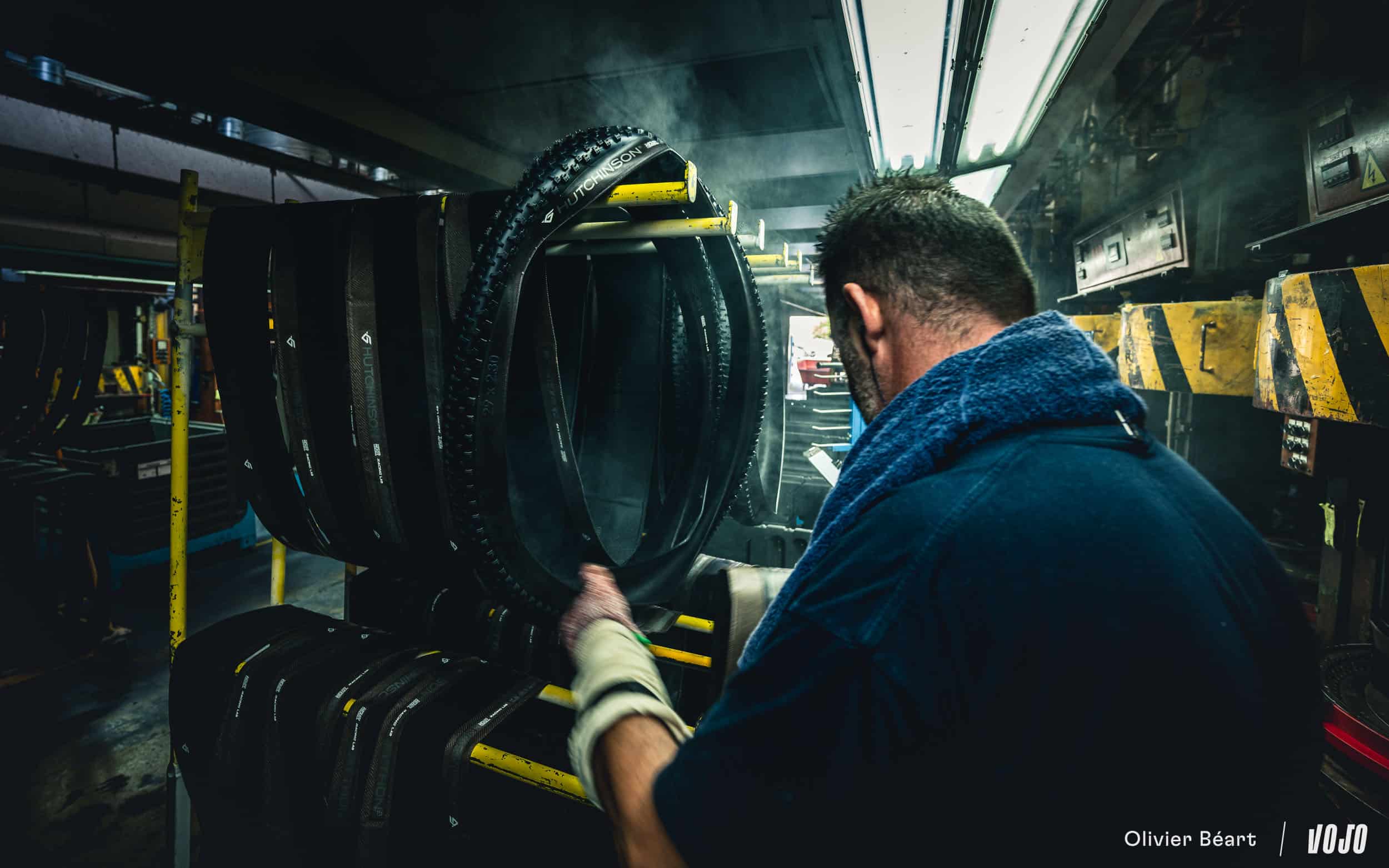 La production peut aussi compter sur des machines beaucoup plus récentes, comme pour le positionnement de la bande de roulement avant le moulage, mais on remarque que la main de l’homme (et de la femme) reste très présente à toutes les étapes de la production.