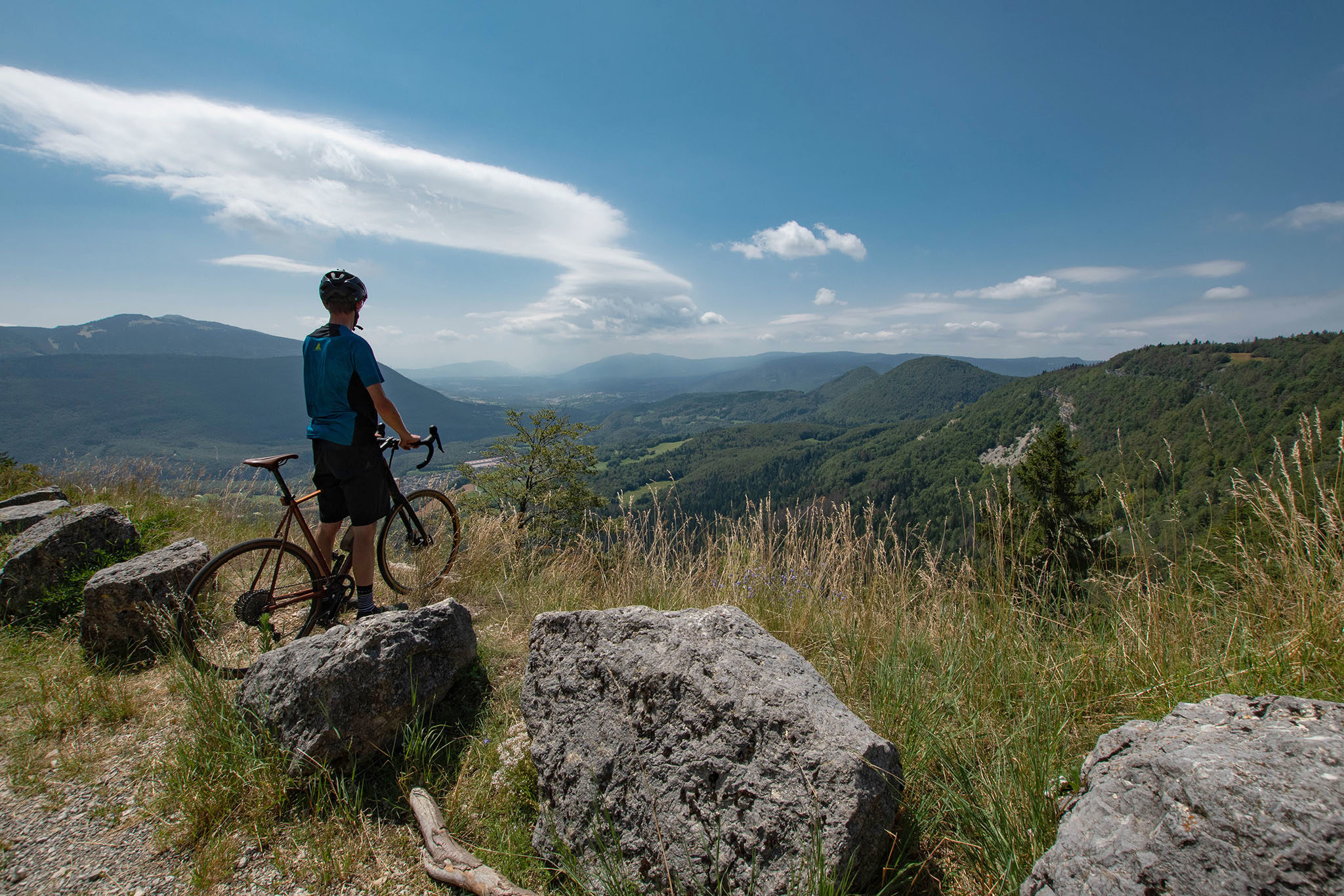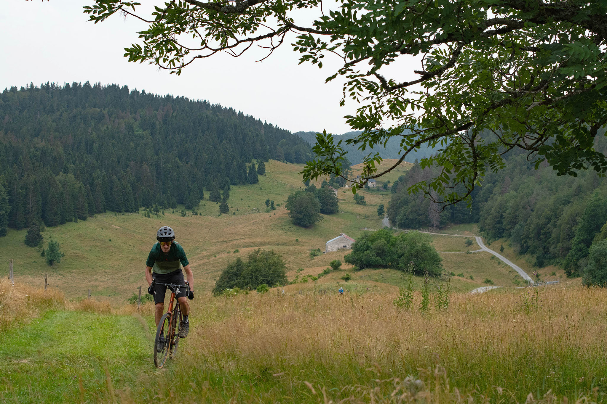 Je progresse dans ce relief caractéristique du Haut-Jura qui alterne les monts boisés et les vaux, ces cambrures synclinales. Les corniches calcaires ensoleillées se substituent vite aux buis puis au chênes pubescents : ils constituent une transition vers les prés et les combes. En traversant les « Joux Noires », ces massifs d’épicéas, je rejoins un chemin pentu recouvert de pierres de calcaire. Les blocs parsèment la trace. Elle tranche avec celle que je longe par la suite sur les hauteurs. Face à mon gravel, une nouvelle côte se présente : non sans mal on s’extirpe sur le plateau où un sentier rejoint les affleurements rocheux. Nous nous lançons à fond sur un sentier filant à travers les alpages vers la Borne au Lion.