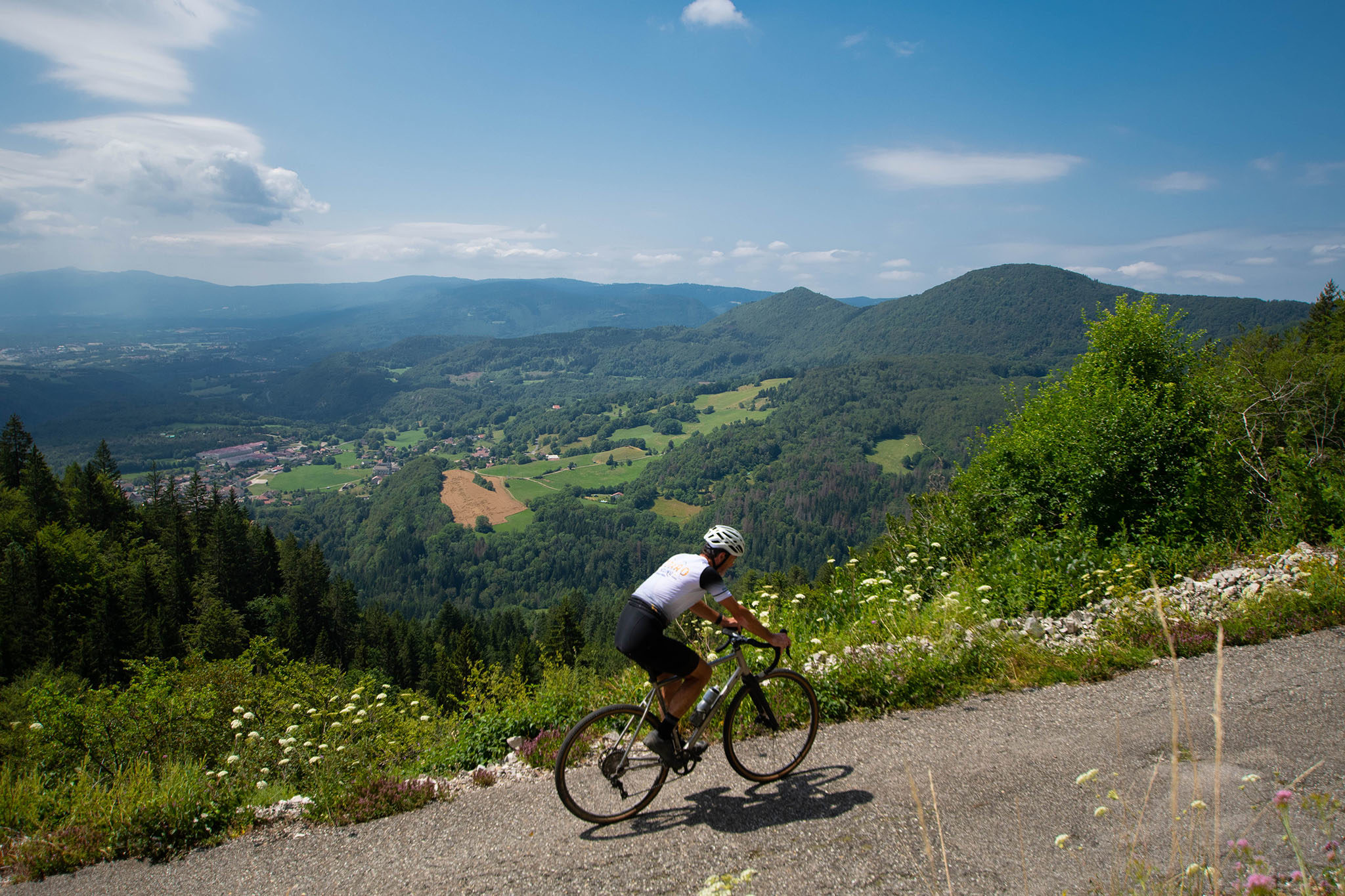 L’itinéraire qui descend vers Giron est superbe. Il me gratifie d’une jolie route à travers la forêt. Le Jura ne laisse pas le voyageur insensible face à son paysage et à sa sauvagerie. Avec mon gravel, je termine de parcourir les courbes harmonieuses des montagnes de ce pays envoûtant que la Forestière met si bien en valeur.