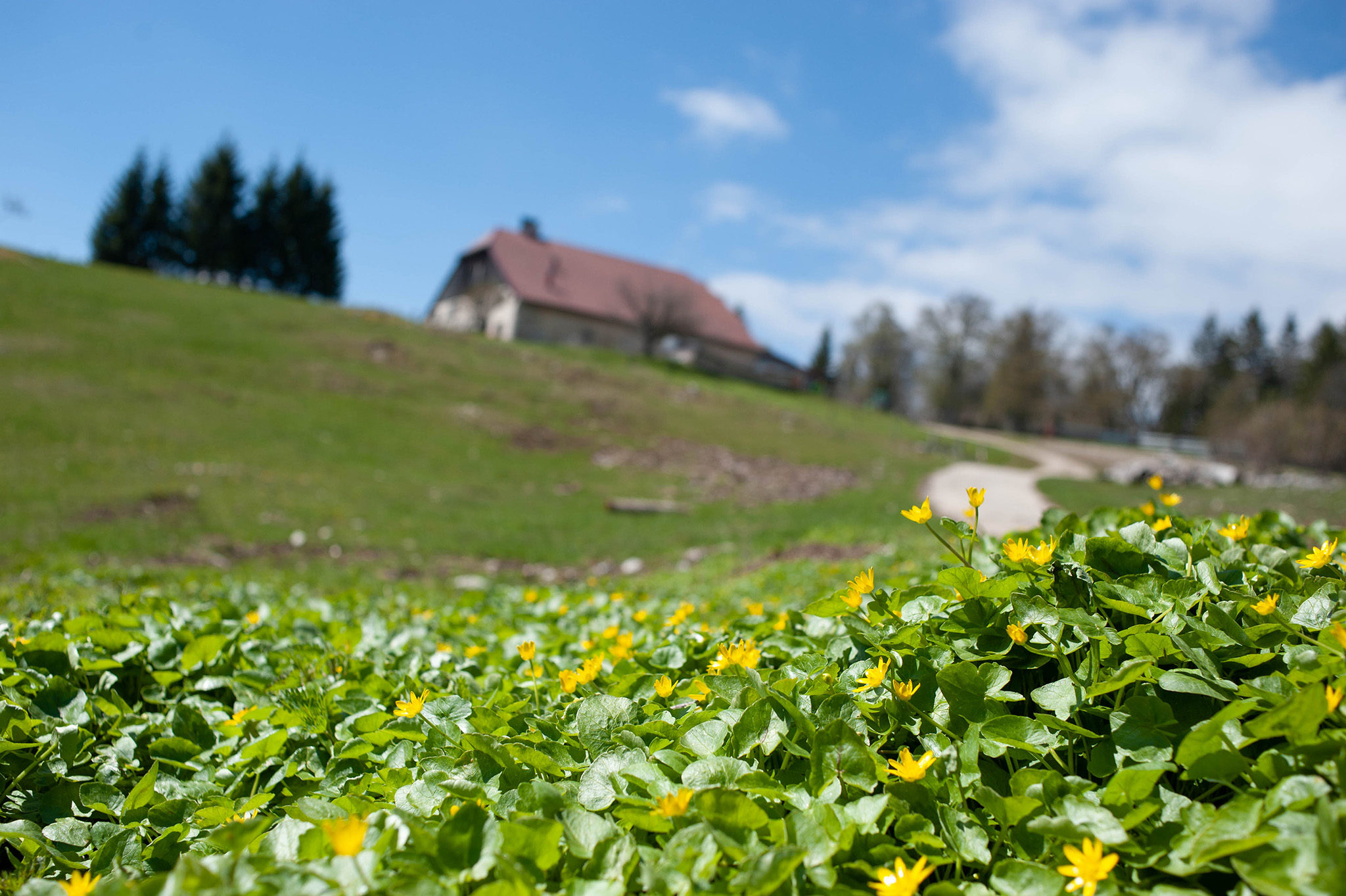 Je traverse les anciennes parcelles vidées de toute pierre. Les paysans les ont déplacées pour en libérer le pâturage et créer des murets de délimitation. Un patrimoine que nous traversons via les échaliers qui parsèment le haut plateau jurassien. Je ne roule plus, je glisse sur la prairie florée de gentianes.