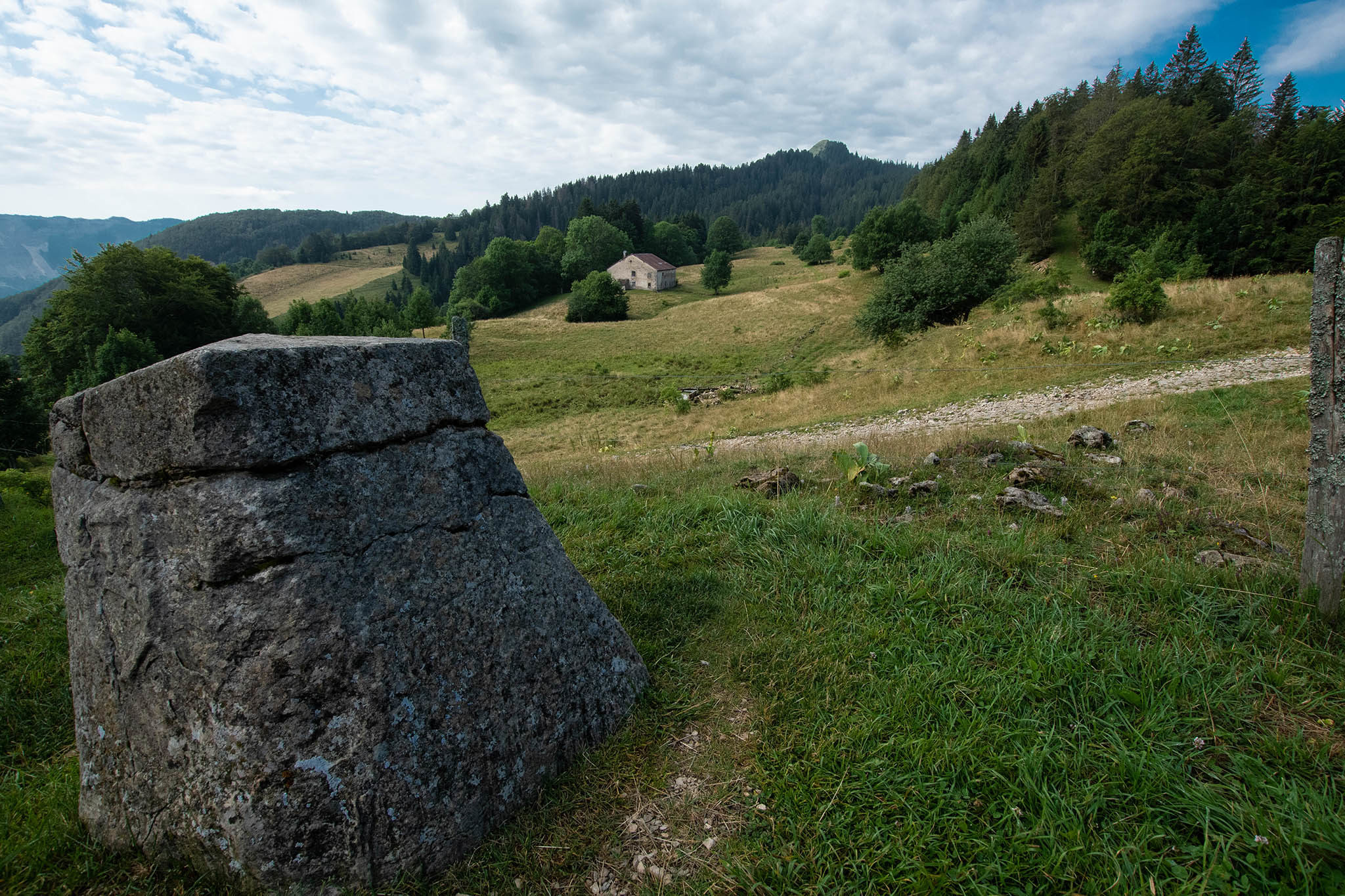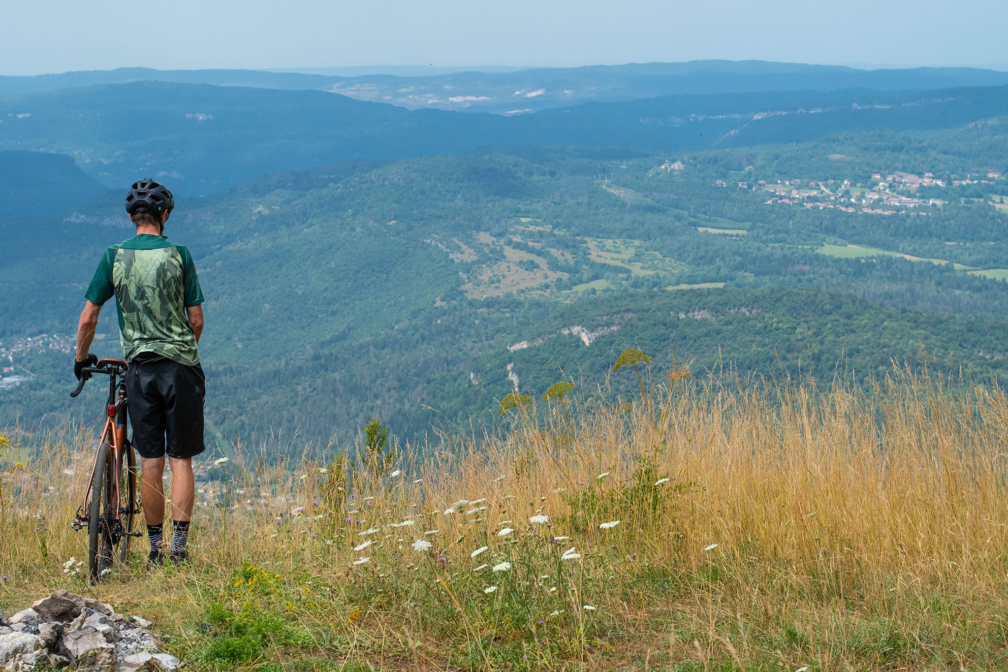 Je progresse dans ce relief caractéristique du Haut-Jura qui alterne les monts boisés et les vaux, ces cambrures synclinales. Les corniches calcaires ensoleillées se substituent vite aux buis puis au chênes pubescents : ils constituent une transition vers les prés et les combes. En traversant les « Joux Noires », ces massifs d’épicéas, je rejoins un chemin pentu recouvert de pierres de calcaire. Les blocs parsèment la trace. Elle tranche avec celle que je longe par la suite sur les hauteurs. Face à mon gravel, une nouvelle côte se présente : non sans mal on s’extirpe sur le plateau où un sentier rejoint les affleurements rocheux. Nous nous lançons à fond sur un sentier filant à travers les alpages vers la Borne au Lion.
