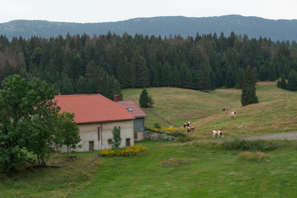 Changement de décor et d’ambiance pour la petite troupe quand nous rejoignons la vallée de Lelex. Je poursuis la trace descendante et roule sans entrave. Ici et là, des clairières aménagées par les hommes sont occupées par de grandes fermes où l’on survivait aux longs hivers.