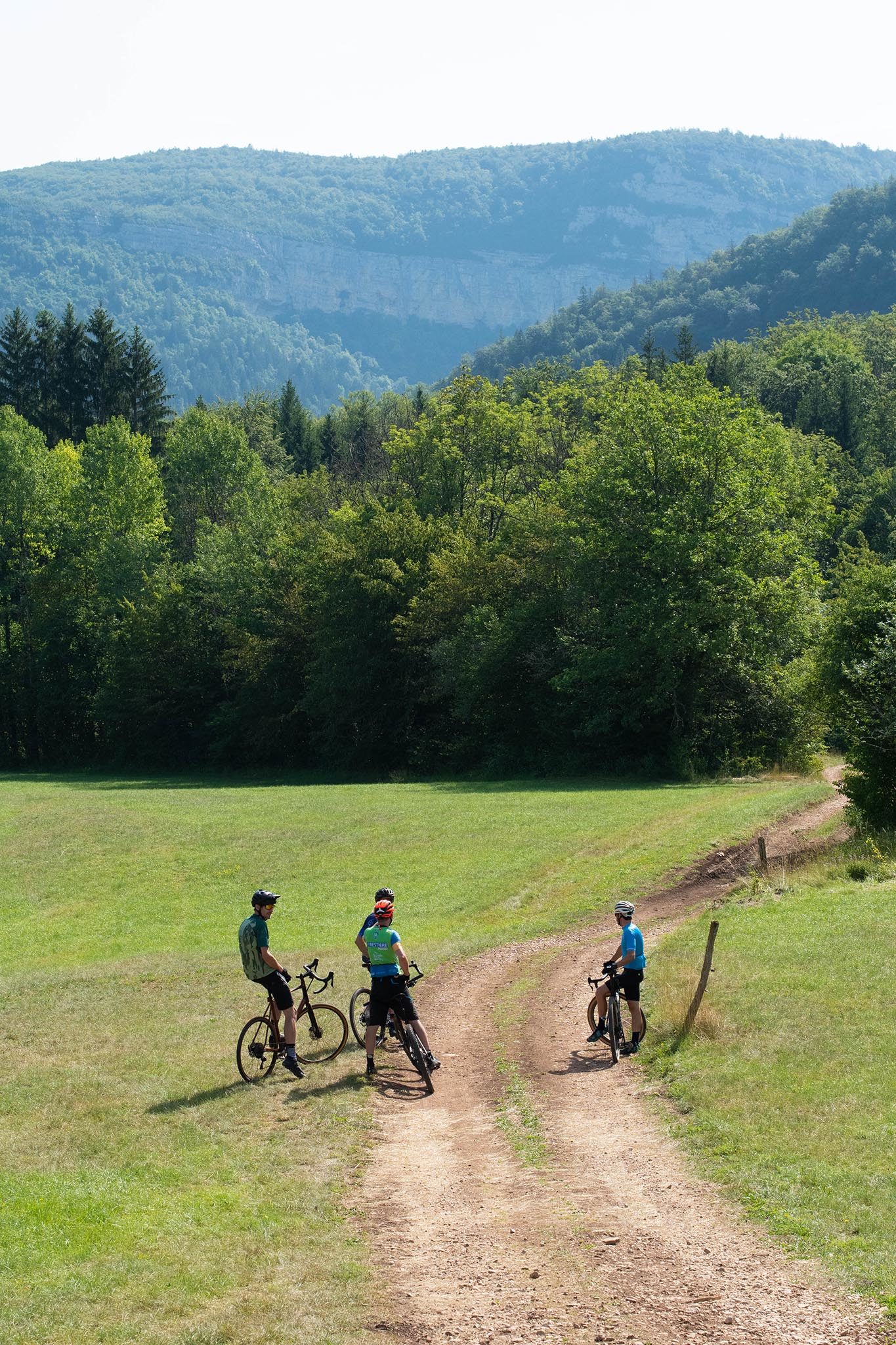 Depuis Arbent, les crêtes du Jura sont un appel d’air : la chaleur de la basse altitude nous pousse à rejoindre les températures plus fraiches, vers Sièges et Choux. La reconnaissance permet de se rendre compte de la difficulté de choisir un parcours approprié pour le gravel. Emmanuel est ainsi circonspect sur le choix de ce chemin à la sortie de Sièges qui est vraiment difficile à aborder en gravel. Le parcours devra être peaufiné, modifié par petites touches ici et là afin de proposer pour le 16 septembre le meilleur tracé possible. C’est justement l’objectif de ce genre de reconnaissance : recueillir les avis de pratiquants aguerris afin de proposer quelque chose de bien abouti dès la première édition.