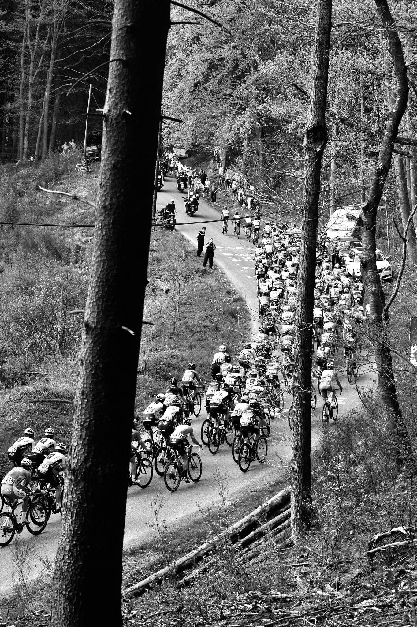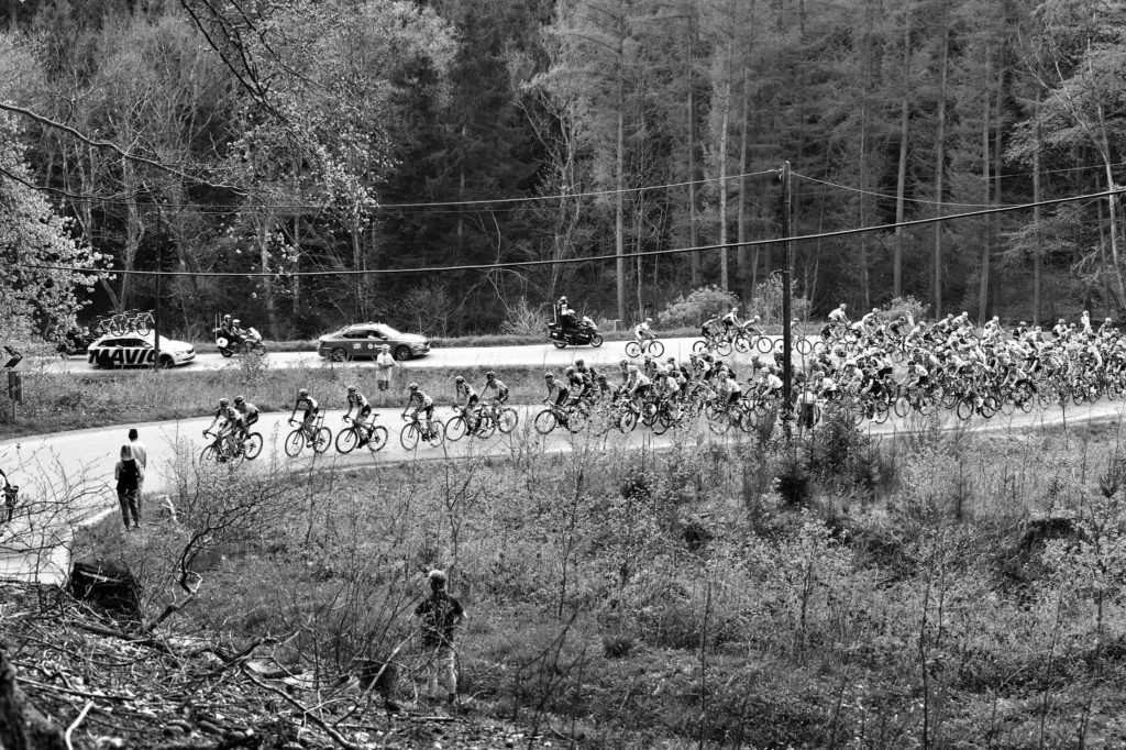 Alors que nous approchons d’Andrimont, nous entendons le bruit caractéristique de la course qui approche : coups de klaxons, odeur de barbecue, c’est un peu la kermesse du jour. Les gens affluent le long de la côte et vont porter leurs champions vers le sommet. Le moment est court mais quand le peloton arrive, le sifflement des pneus et le cliquetis des dérailleurs ne sont que murmure dans la forêt. Les coureurs s’observent et le temps semble suspendu. Il annonce le combat de titans qui se produira 50 km plus loin, du côté de la Roche aux Faucons quand le Luxembourgeois Bob Jungels filera vers son premier grand sacre.