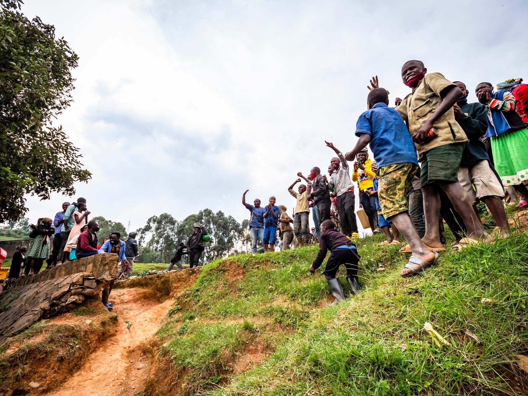 Devant moi, je peux entendre une autre foule bouillonnante de jeunes qui se jettent sur les autres mzungos (« étrangers ») blancs, Ludo May et Fred Horny. Un grondement d’excitation monte à chaque wheelie des mzungos. Il semble que tout le monde, qu’importe l’endroit où il se trouve, aime les clowns.
