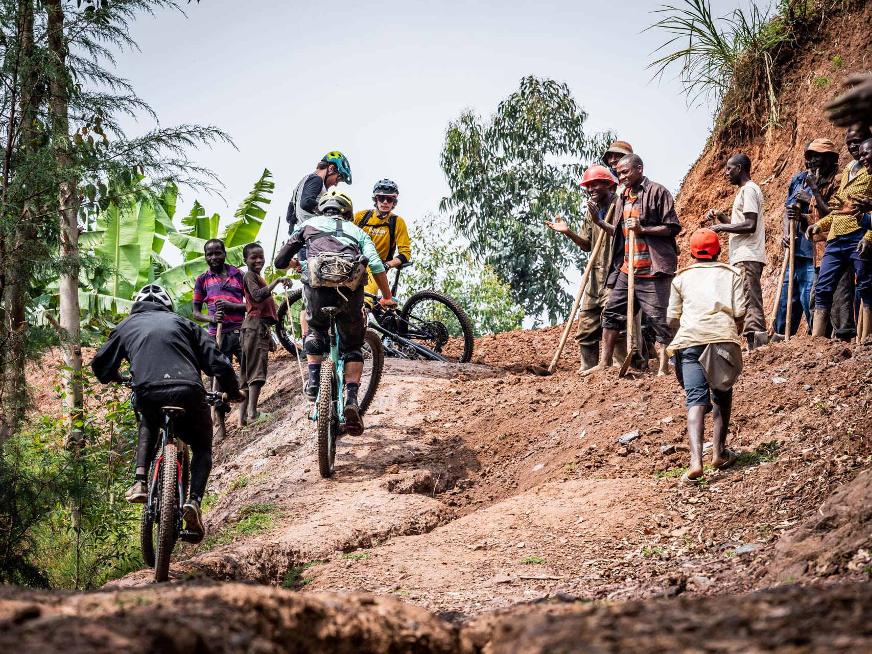 Juste après le village, une équipe d’une trentaine d’hommes manient pioches et pelles pour réparer la principale voie d’accès à leur village. Malgré les outils tranchants, beaucoup sont pieds nus. Ils lèvent les yeux et s’arrêtent lorsque nous approchons, souriant à la présence des mzungos, des vélos et des casques et à nos tentatives ambitieuses de grimper la piste raide et meuble vers eux.
