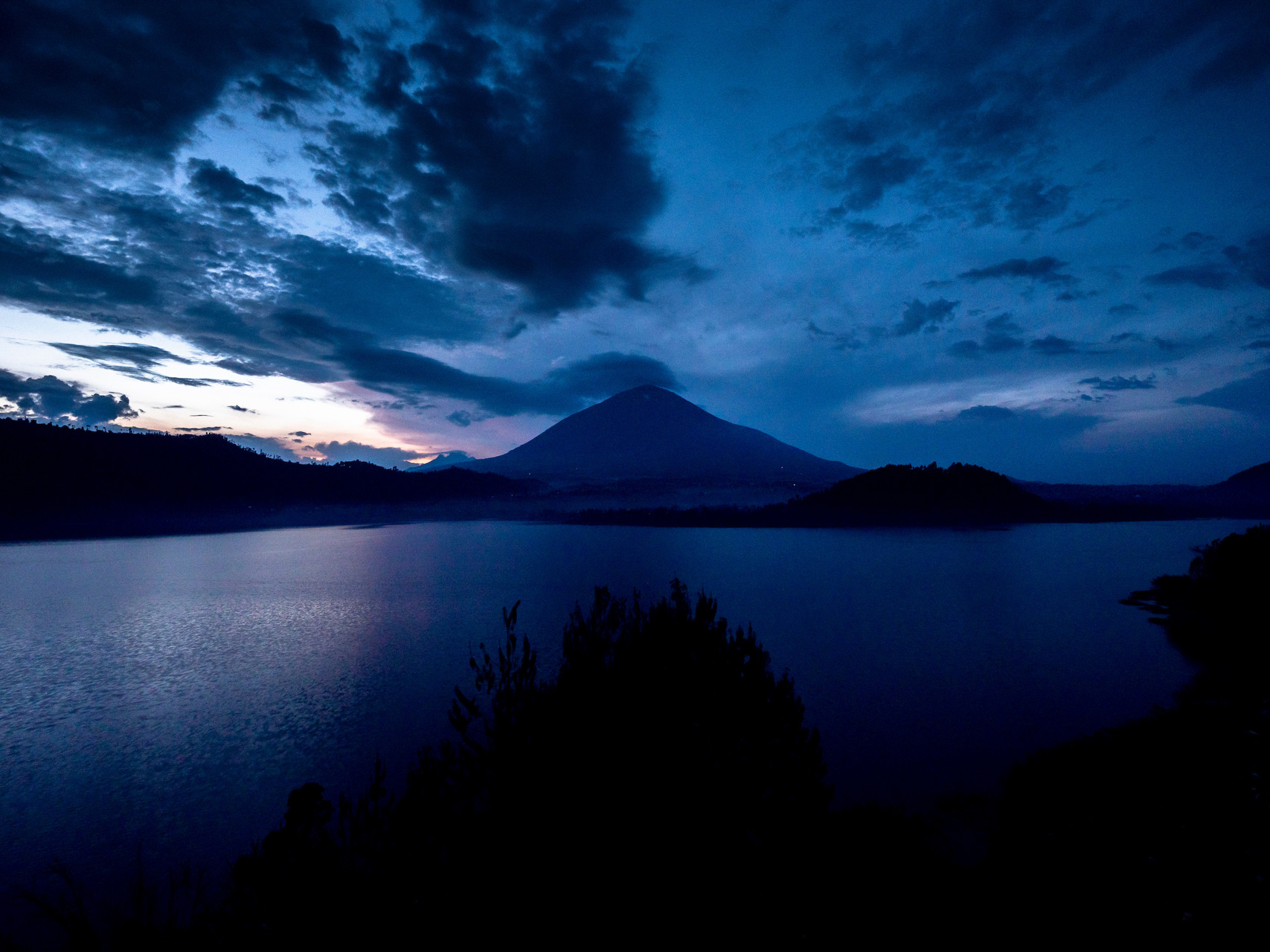 En regardant ces volcans Virunga, avec un seau me servant de douche à la main et des bières de la marque Virunga, je me tiens avec Ludo, Fred, Pelden Dorji et le guide VTT rwandais, Tyisenge Olivier, et je regarde les éclairs dessiner des formes coniques sur un ciel peint en violet.