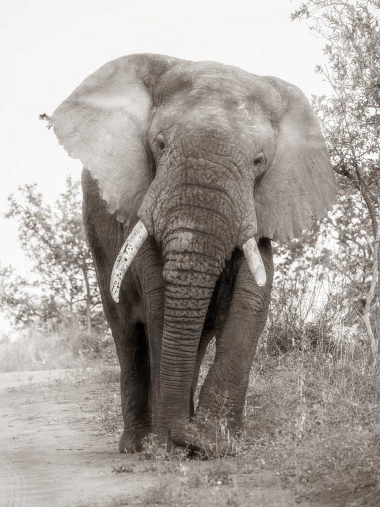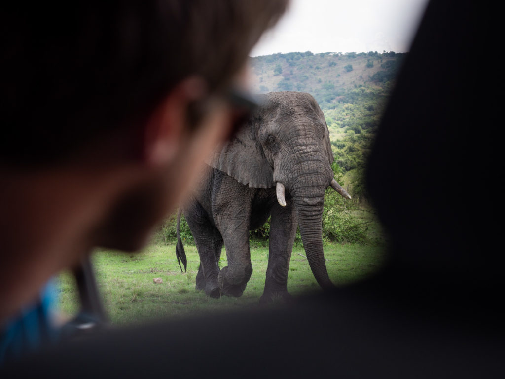 L’éléphant se rapproche de nous ; trois mille kilos de prestance, marchant à grands pas sur une piste poussiéreuse vers notre jeep. Son attitude suggère que nous cédions le passage. Alors que Pelden démarre le moteur de la voiture, je me surprends à murmurer la réplique de Jeff Goldblum dans Jurassic Park : « Je dois aller plus vite, je dois aller plus vite ! » Tout ce qui manque à ce remake de Spielberg, c’est l’autocollant avertissant que « les objets dans le miroir sont plus proches qu’ils n’y paraissent ».
