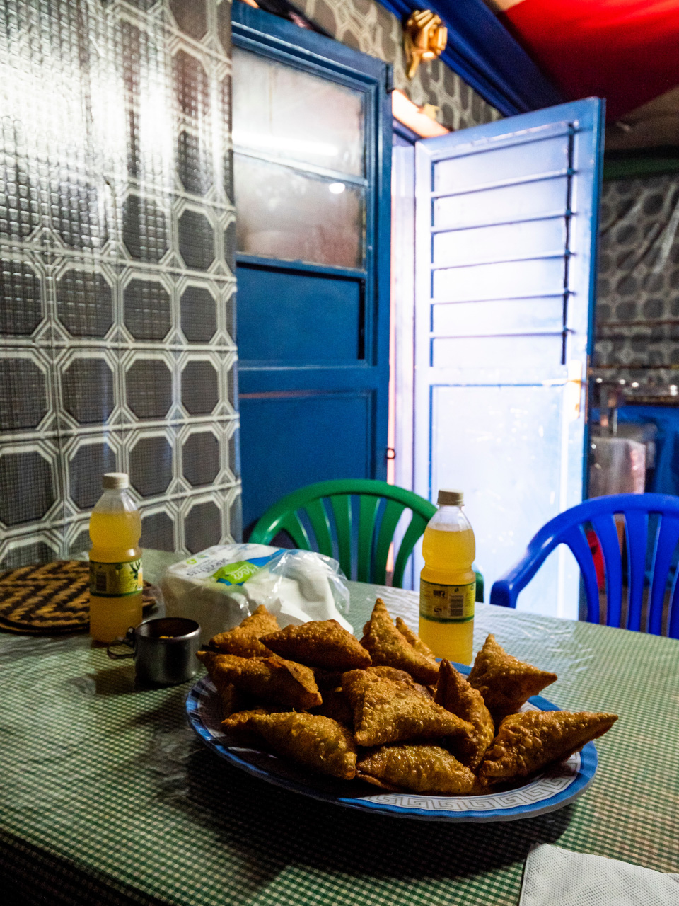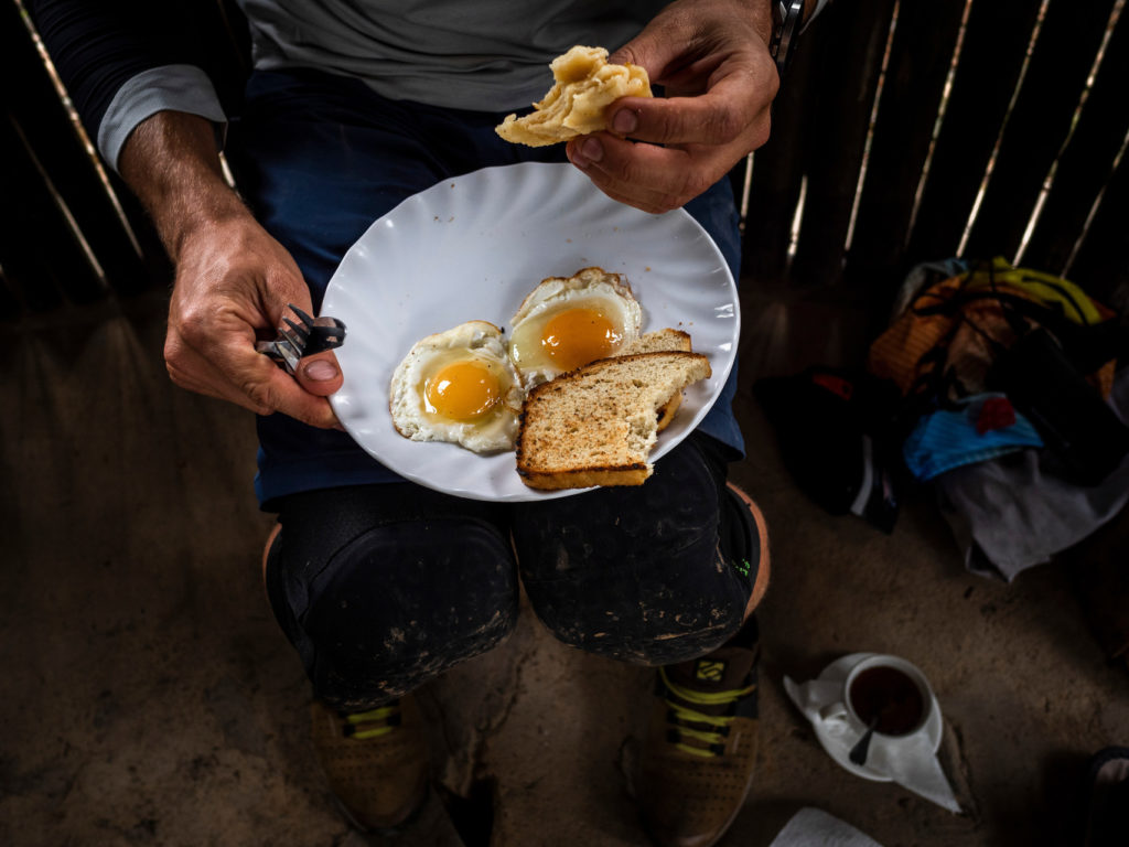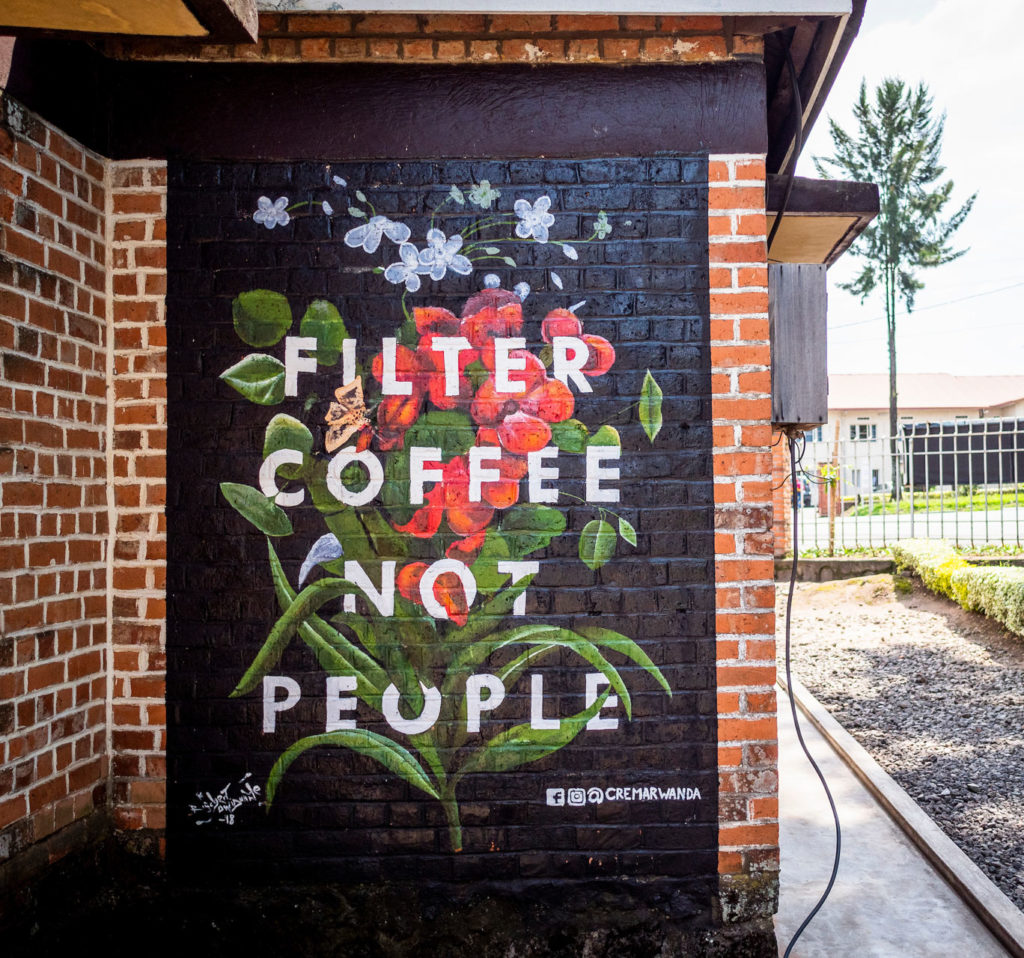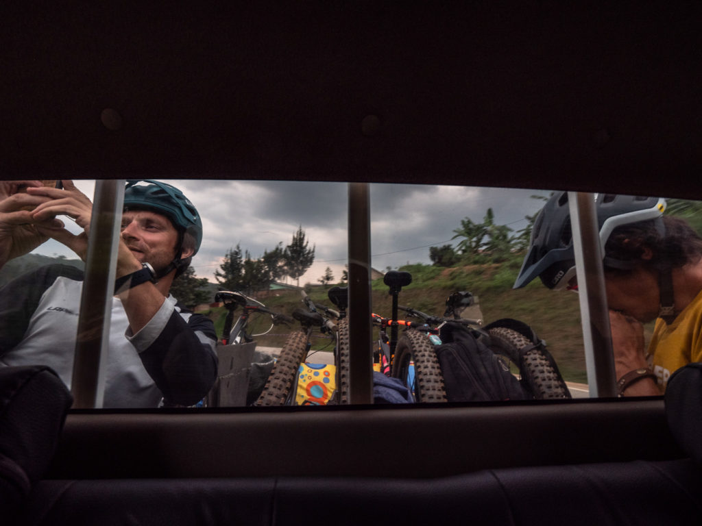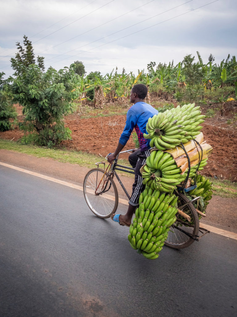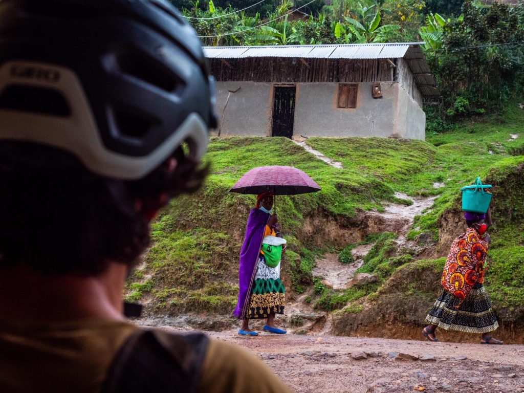 Pédaler entre les buissons de plants de café, les champs de haricots et les regards curieux nous plonge rapidement dans une autre journée trépidante d’expériences nouvelles et d’interactions animées qui sera marquée par une descente de mille mètres de dénivelé et ponctuée par un déjeuner dans un café coloré de gare routière au milieu de l’agitation de la ville frontière de Butaro. Ici, je regarde passer un camion de police qui patrouille à la recherche de waraji (alcool illégal à base de banane) importé en contrebande de l’Ouganda voisin. La scène pourrait être angoissante mais ne pourrait pas être plus absorbante.
