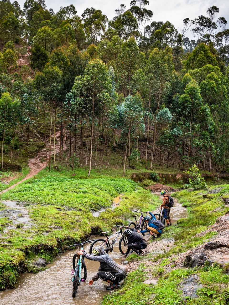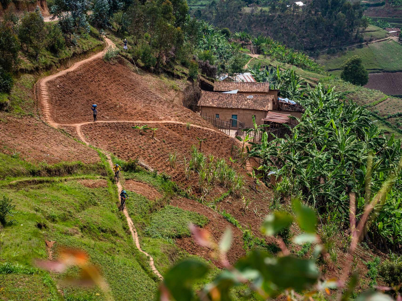 Dès notre premier coup de pédale, la petite ville de Burera s’avère être une mine d’or de singletracks. De longues descentes sinueuses se succèdent sans difficulté sur des flancs de collines en gradins. Rapide et fluide, il est facile de se laisser bercer par une fausse impression de sécurité, jusqu’à ce qu’un ruisseau d’un mètre de large apparaisse soudainement sur le chemin devant vous. Devoir lever la roue avant en urgence, et les quelques fois où l’on a dû mettre à pied à terre nous rappellent que ce n’est pas un bikepark.