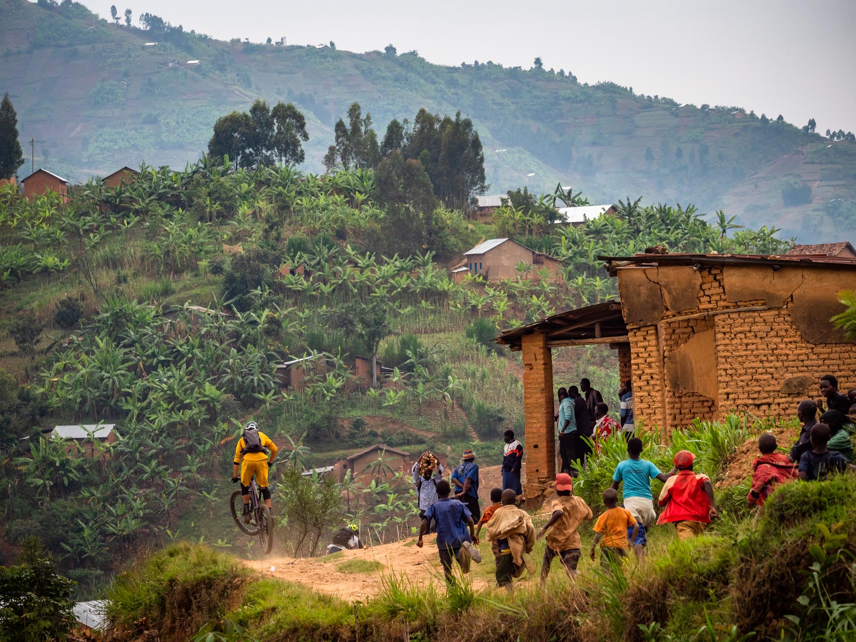 Je répète cette phrase cinq jours plus tard, lorsque je pédale sur un chemin de terre sinueux, entouré d’enfants qui courent et rigolent. Je murmure, ma voix étouffée par la chaleur ou l’épuisement – ou les deux, : « Je dois aller plus vite ». En réalité, je n’ai aucune chance d’échapper à cette foule à l’énergie débordante – et je ne devrais pas le vouloir : ils sont le Rwanda d’aujourd’hui et une grande partie de ce que nous sommes venus découvrir – c’est juste que j’aimerais avoir leur endurance. Mais je ne l’ai pas, pas aujourd’hui en tout cas. En quittant une vallée luxuriante étouffée par l’humidité, je n’ai plus d’énergie, alors je regarde ma roue avant et je me résigne.