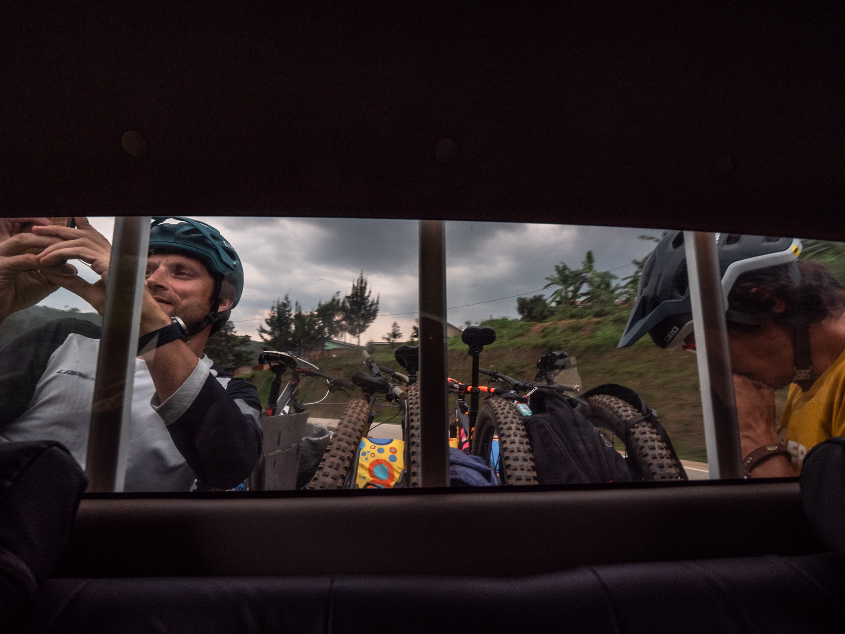 Quelques secondes après la descente, la chaleur, la sueur et l’atmosphère étouffante sont remplacées par un air rafraîchissant et le calme familier des virages – et, moins réjouissant, par un grondement de tonnerre lointain provenant d’une série de nuages couleur anthracite, signes avant-coureurs d’un orage dans l’après-midi. Comme nous l’avons déjà expérimenté, la pluie est prompte à transformer la poussière de rêve du Rwanda en pistes de toboggan glissantes et collantes pour les pneus. Nous courons pour nous abriter sous un ciel qui s’assombrit : le Rwanda n’est rien d’autre qu’un assaut sur les nerfs.