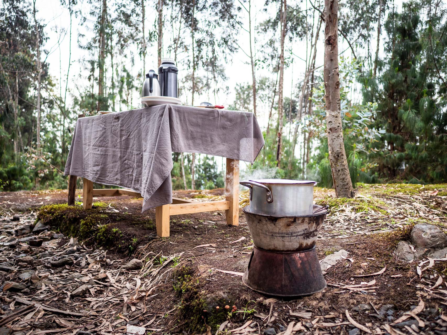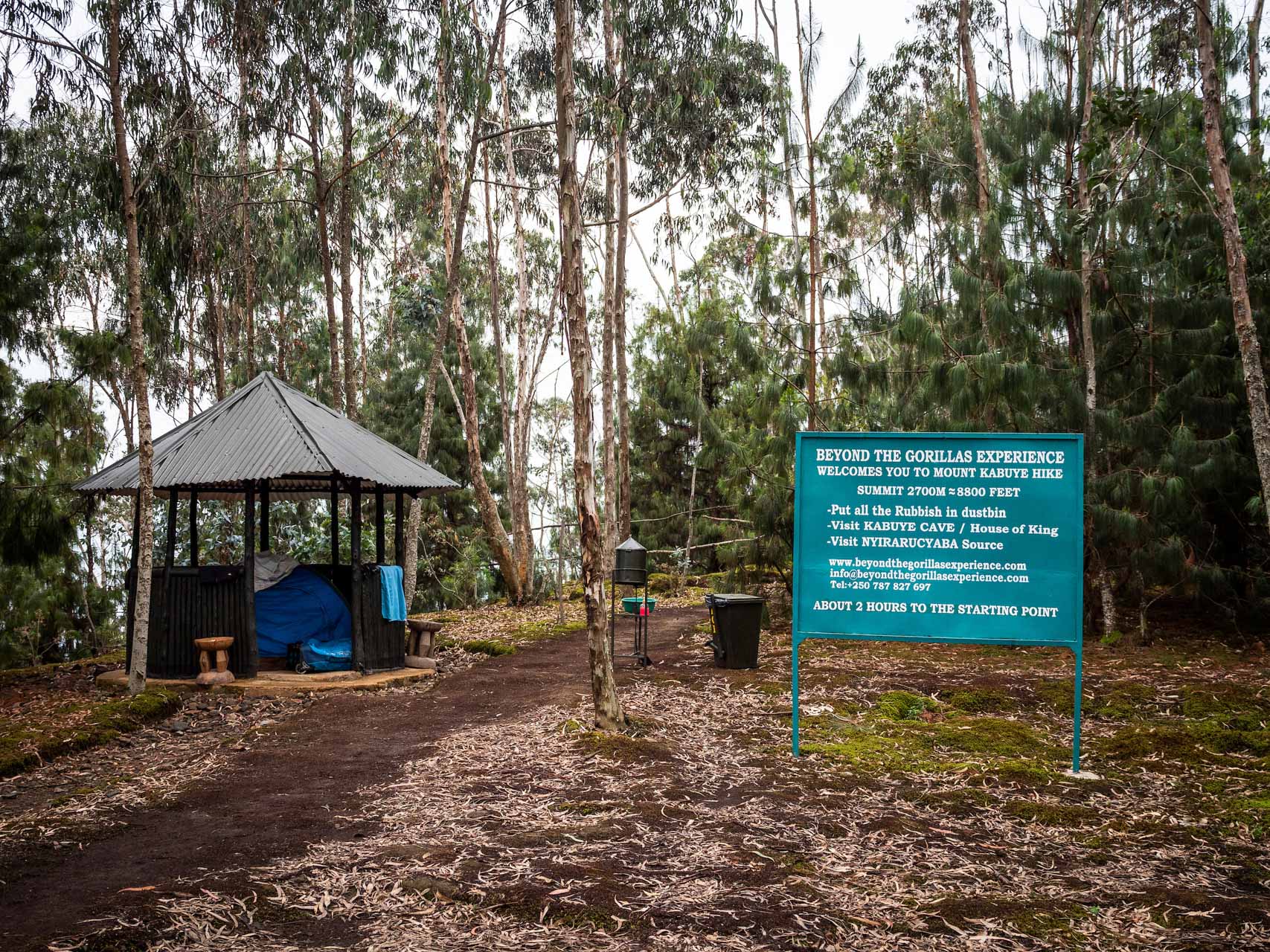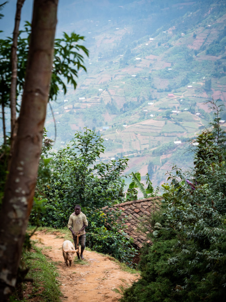En descendant du camp de trekking « Beyond-the-Gorillas-Experience« , situé au sommet du mont Kabuye (2640 m), nous descendons en lacets à travers des pierriers remplis de mousses, vers le village de Mushube, un tetris ocre de maisons en blocs de béton au milieu d’eucalyptus.