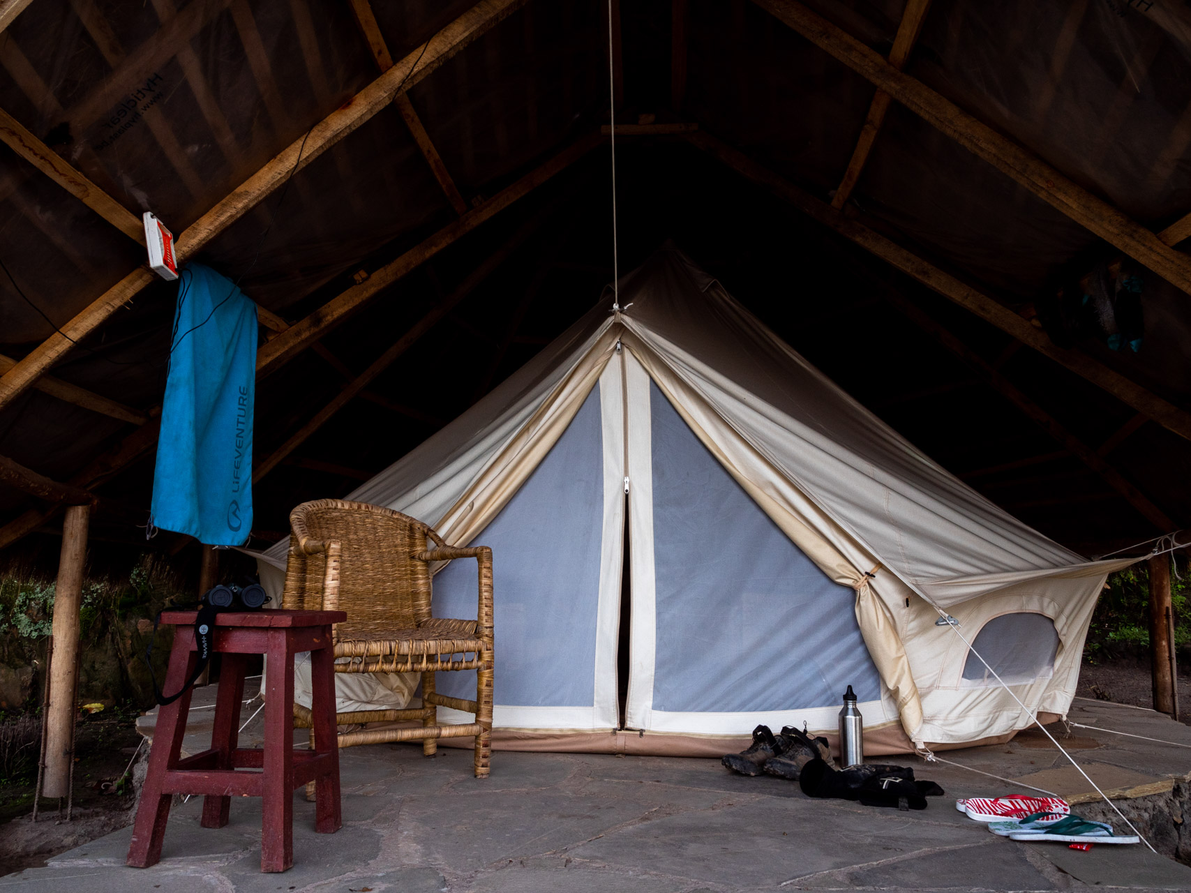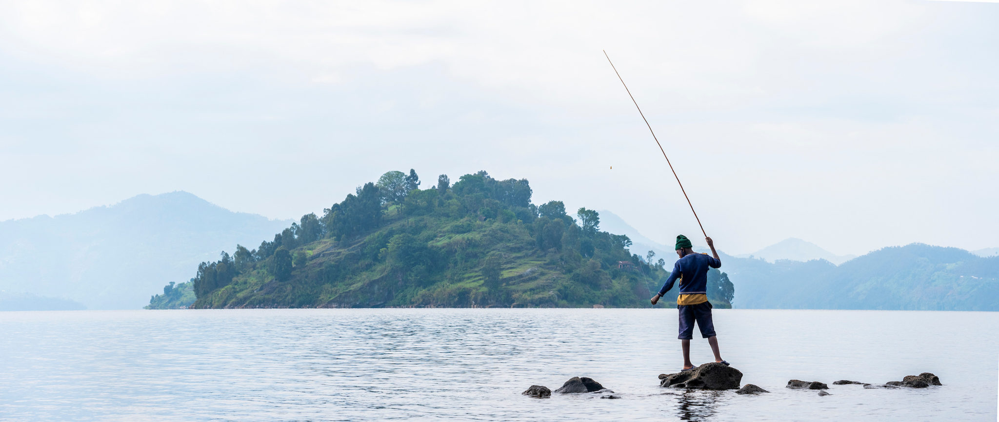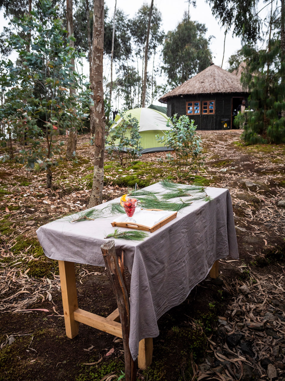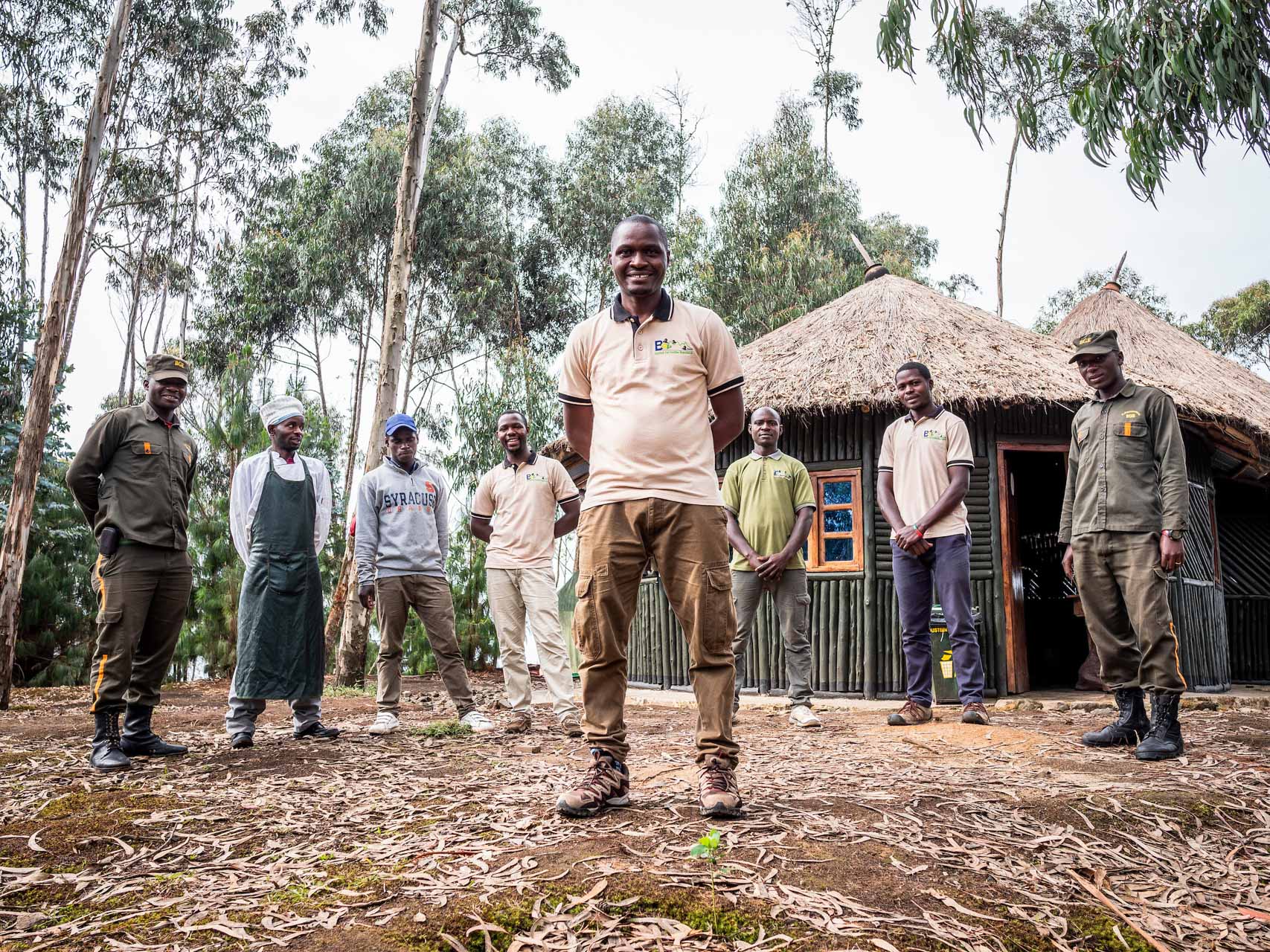 L’hébergement touristique le plus proche de ces sentiers se trouve sur la minuscule et paradisiaque île de Cyuza, située au nord du lac Burera et accessible par bateau. Nous y campons pendant quatre nuits, dormant dans de confortables tentes de safari dressées sous des toits de chaume.