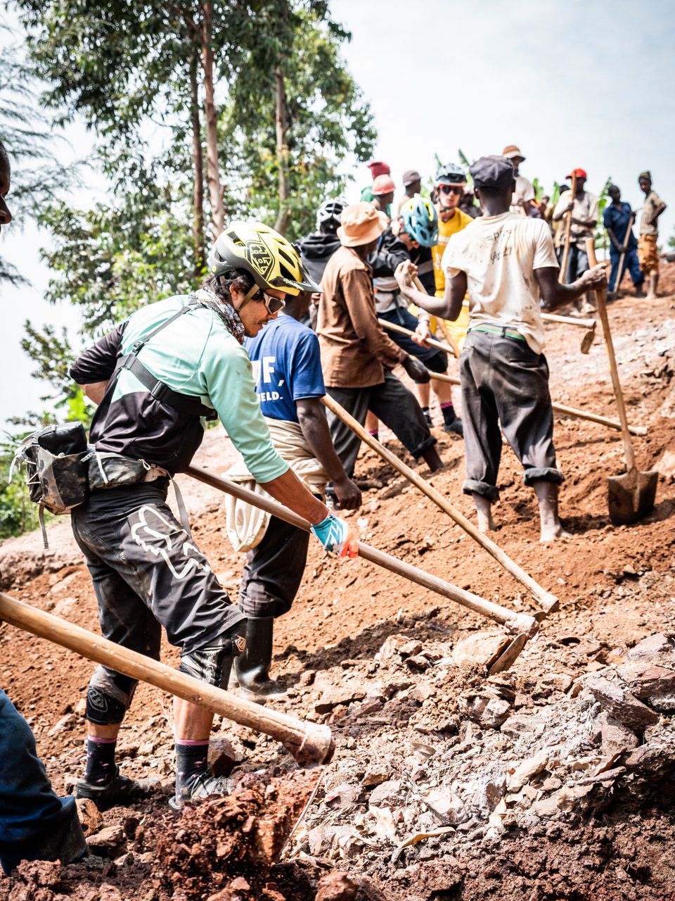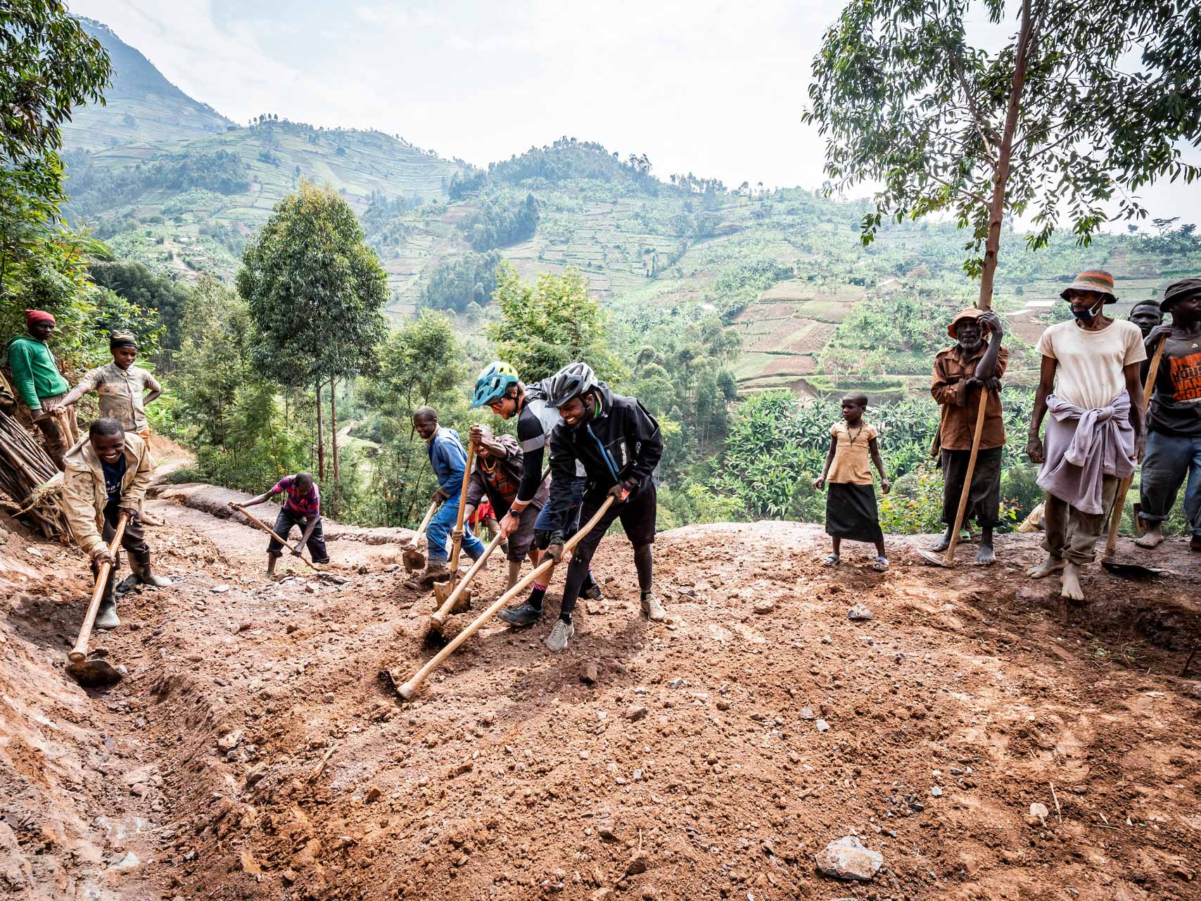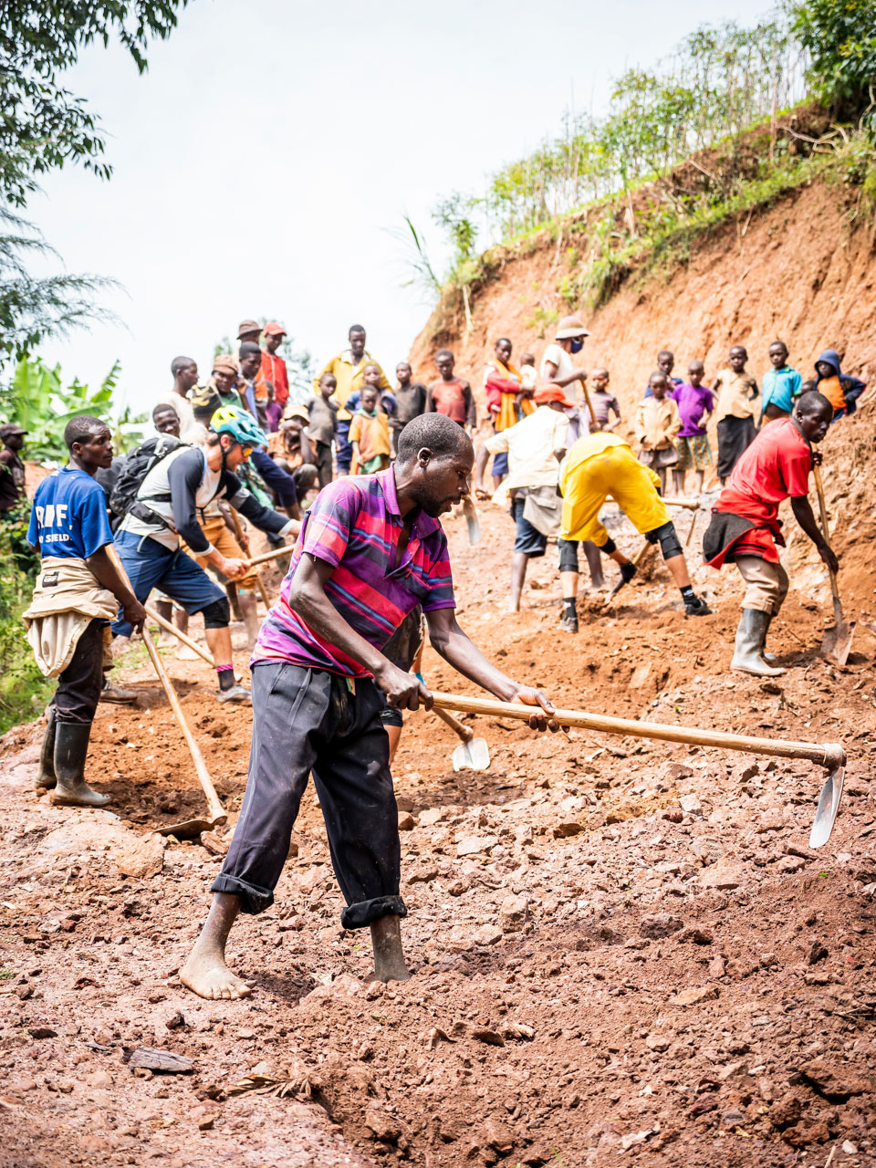 Juste après le village, une équipe d’une trentaine d’hommes manient pioches et pelles pour réparer la principale voie d’accès à leur village. Malgré les outils tranchants, beaucoup sont pieds nus. Ils lèvent les yeux et s’arrêtent lorsque nous approchons, souriant à la présence des mzungos, des vélos et des casques et à nos tentatives ambitieuses de grimper la piste raide et meuble vers eux.