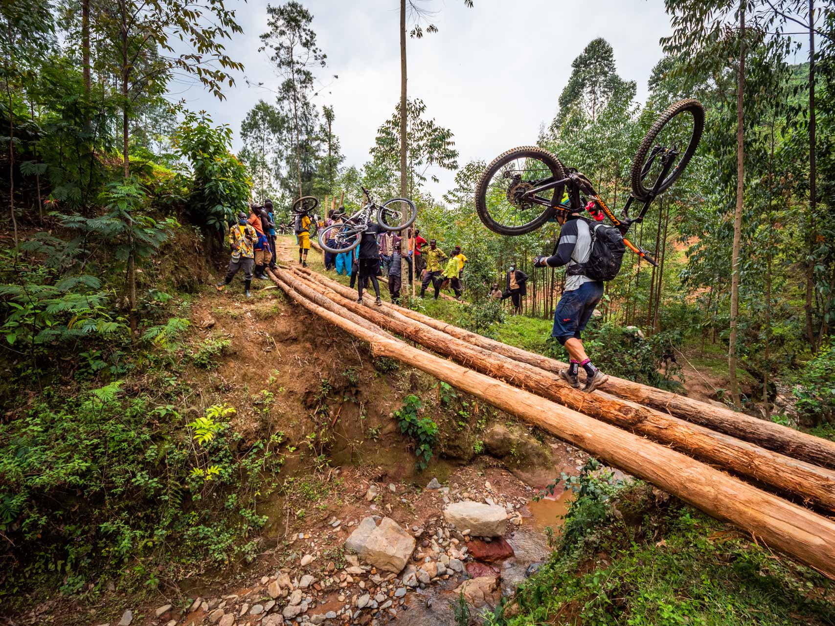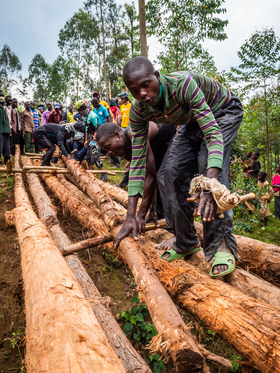 En descendant un sentier étroit, nous trouvons bientôt une autre équipe d’umuganda, qui remplace cette fois un pont emporté par les eaux de la tempête cinq mois plus tôt. De longues perches d’eucalyptus sont installées afin d’enjamber un ruisseau de cinq mètres de largeur qui a traversé le sentier. Nous traversons les troncs fraîchement placés, vélos sur les épaules, sous les acclamations des villageois tandis qu’une femme, qui s’avère être le chef du village, filme la manœuvre avec son téléphone. « Merci de nous rendre visite« , me dit-elle dans un anglais presque parfait, avec un large sourire.