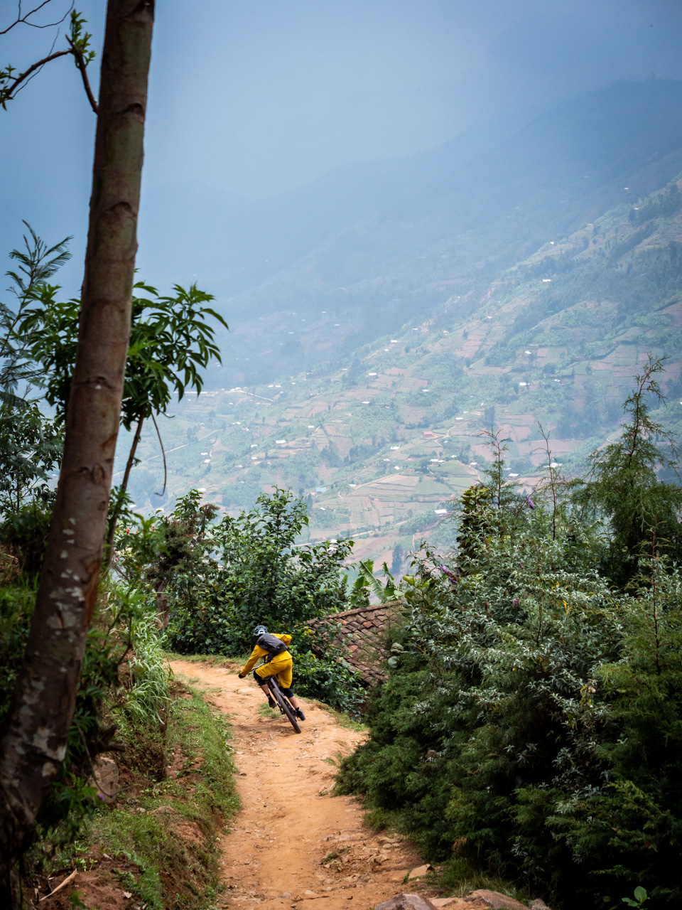 Regardez les collines en terrasses du Rwanda et vous verrez d’innombrables sentiers entretenues et/ou réparés par l’umuganda. Elles serpentent entre les habitations à flanc de colline, grimpent dans les forêts et plongent dans des vallées escarpées où tourbillonnent la brume et la fumée des feux de bois. Il y a tellement de chemins ici qu’il est difficile de savoir où commencer, du moins sans connaissance locale, et c’est là qu’Olivier intervient. Certes, l’appétit de notre guide pour les singletracks et son rôle dans la compréhension des subtilités de la vie rwandaise n’ont pas de prix, mais les derniers sentiers que nous explorons – à Burera, une région reculée qui ne voit presque pas de touristes – sont nouveaux même pour Olivier.
