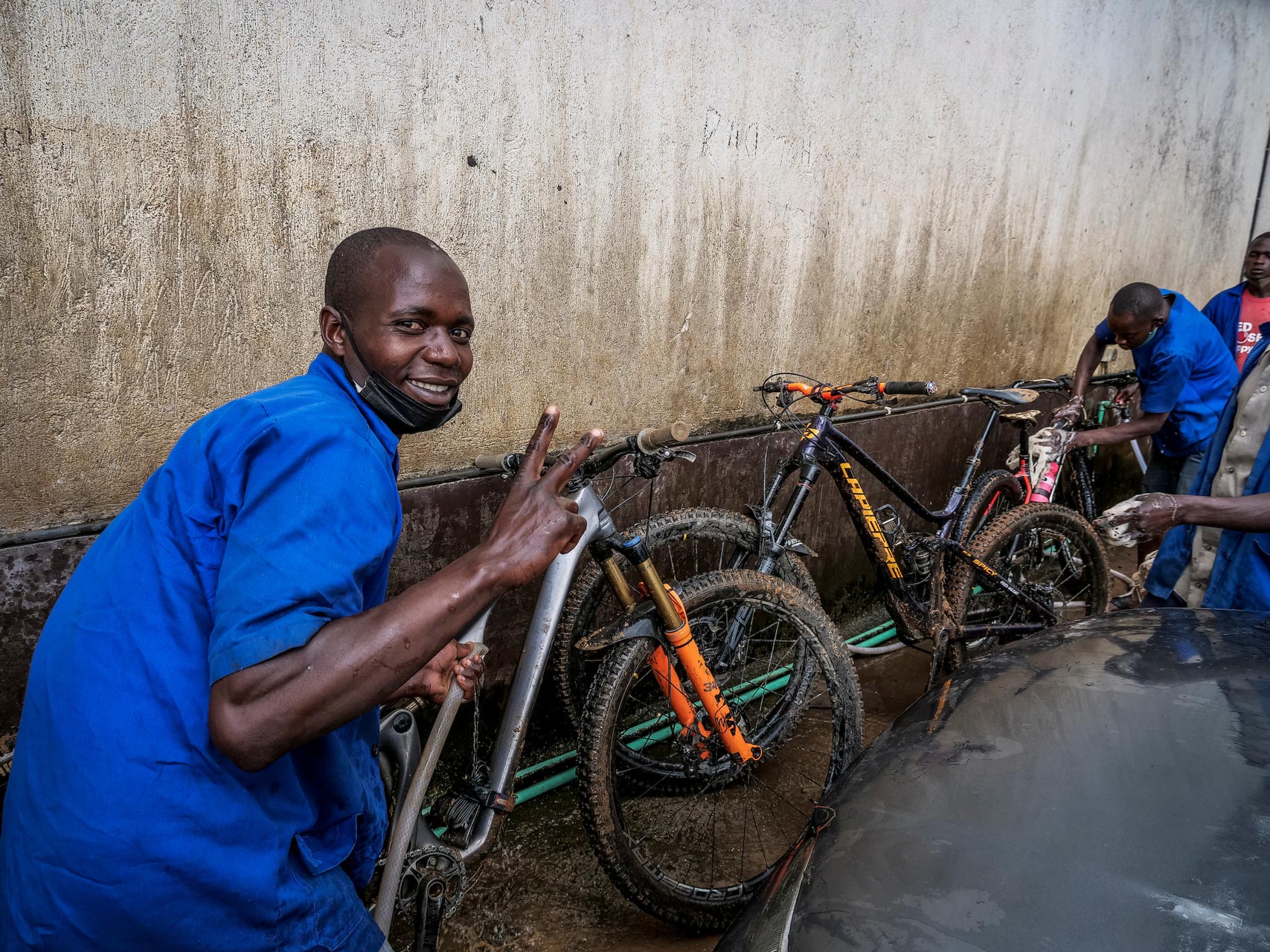 « C’est l’umuganda« , dit Olivier, expliquant le travail communautaire obligatoire dans tout le pays qui occupe le dernier samedi matin de chaque mois. Olivier prend alors une pelle et aide à creuser. En quelques secondes, les outils ont remplacé les guidons dans tout mon groupe – pas le temps d’enlever les casques – et les sourires fusent. Et puis une chanson s’élève ; un chant mélodique d’esprit d’équipe en langue kinyarwanda, accompagné seulement du bruit de percussion des pelles contre les pierres.