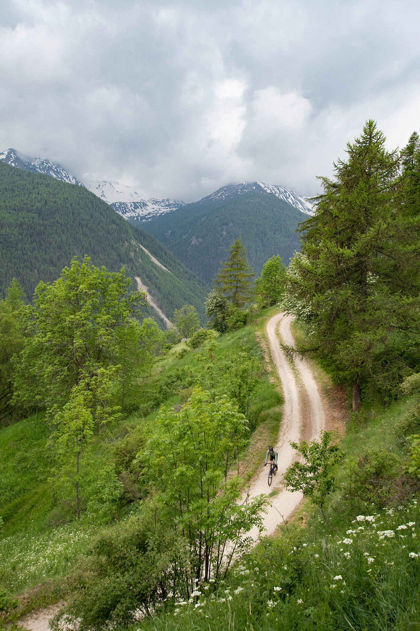 Grâce au gravel, nous évitons le grand axe routier du Saint-Bernard menant au tunnel éponyme. En contrebas, cachée des regards, une voie nous porte vers le haut de la vallée. En ce début du mois de juin, la floraison explose de mille tonalités. Nous longeons des prés fleuris à perte de vue. La route, secrète, passe par La Combaz, Saint-Léonard. Des hameaux vivant dans le silence, alors que là-haut, la route menant au tunnel est soumise aux vrombissements des moteurs. C’est cela la pratique du gravel : trouver des routes et des chemins peu empruntés et qui se découvrent à la lecture d’une carte.