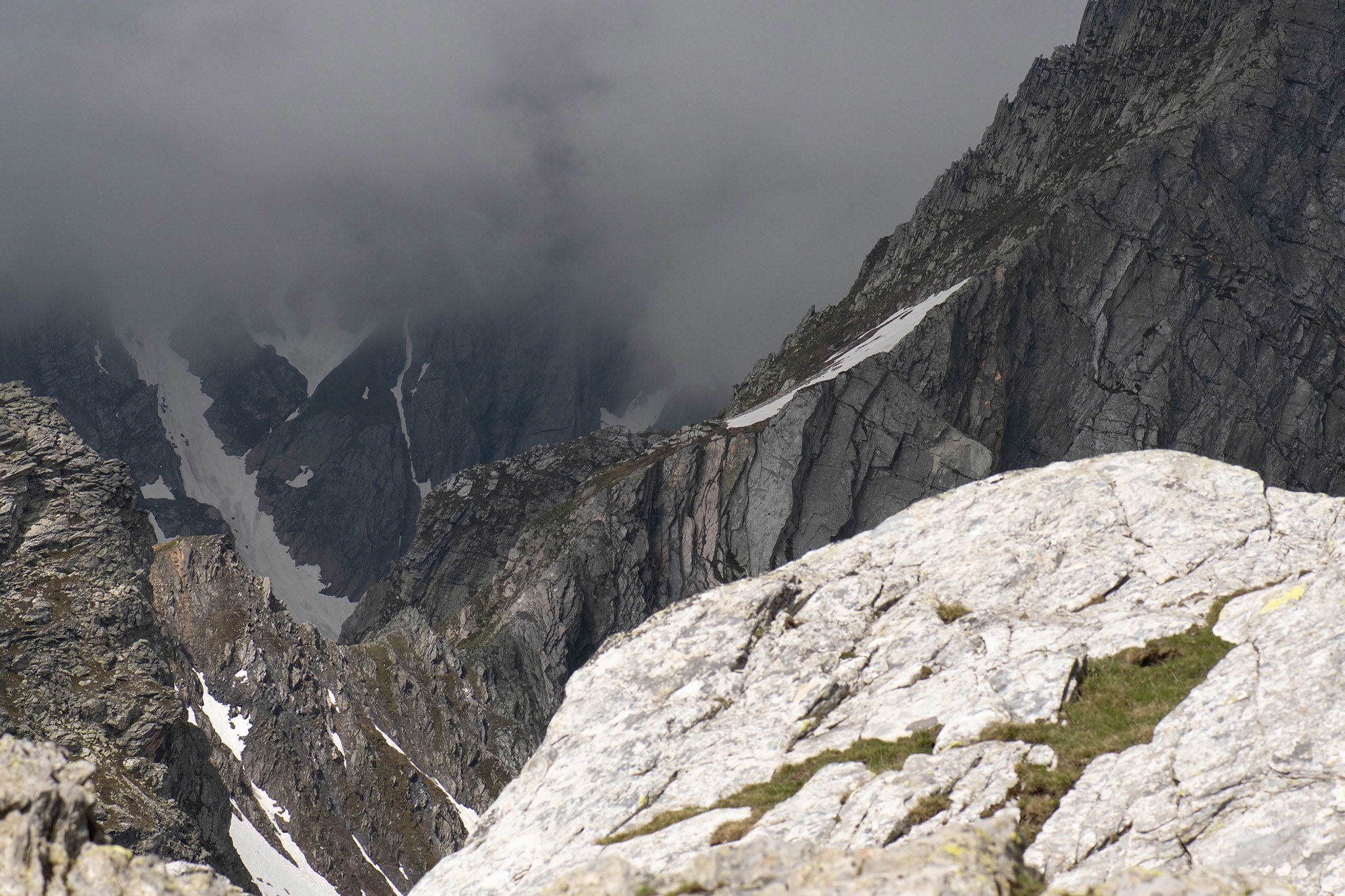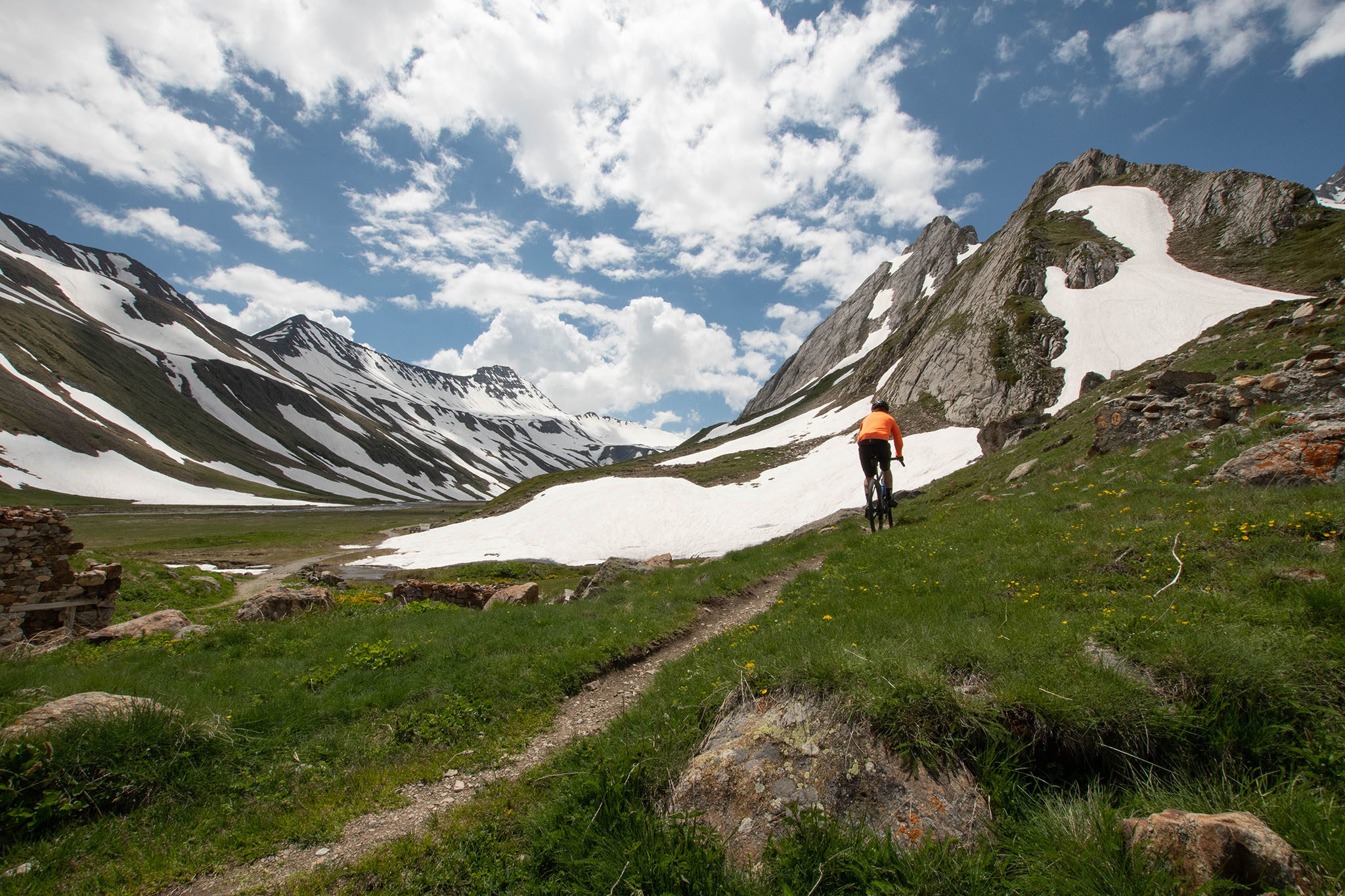 Nous sommes au bout de la vallée, au point ultime où peuvent mener nos gravel. Au-delà, le vélo n’a plus sa place. Après l’alpage, la haute altitude n’est jamais loin. De l’autre côté de la barrière rocheuse se situe le Valais. Jadis, les montagnards empruntaient les passages clés nous dominant afin de commercer. De nos jours, ils sont paradoxalement plus difficiles d’accès car la calotte glaciaire où l’on pouvait marcher et franchir la passe a maintenant disparu. Sur ces cols, il existait des cabanes servant de relais.