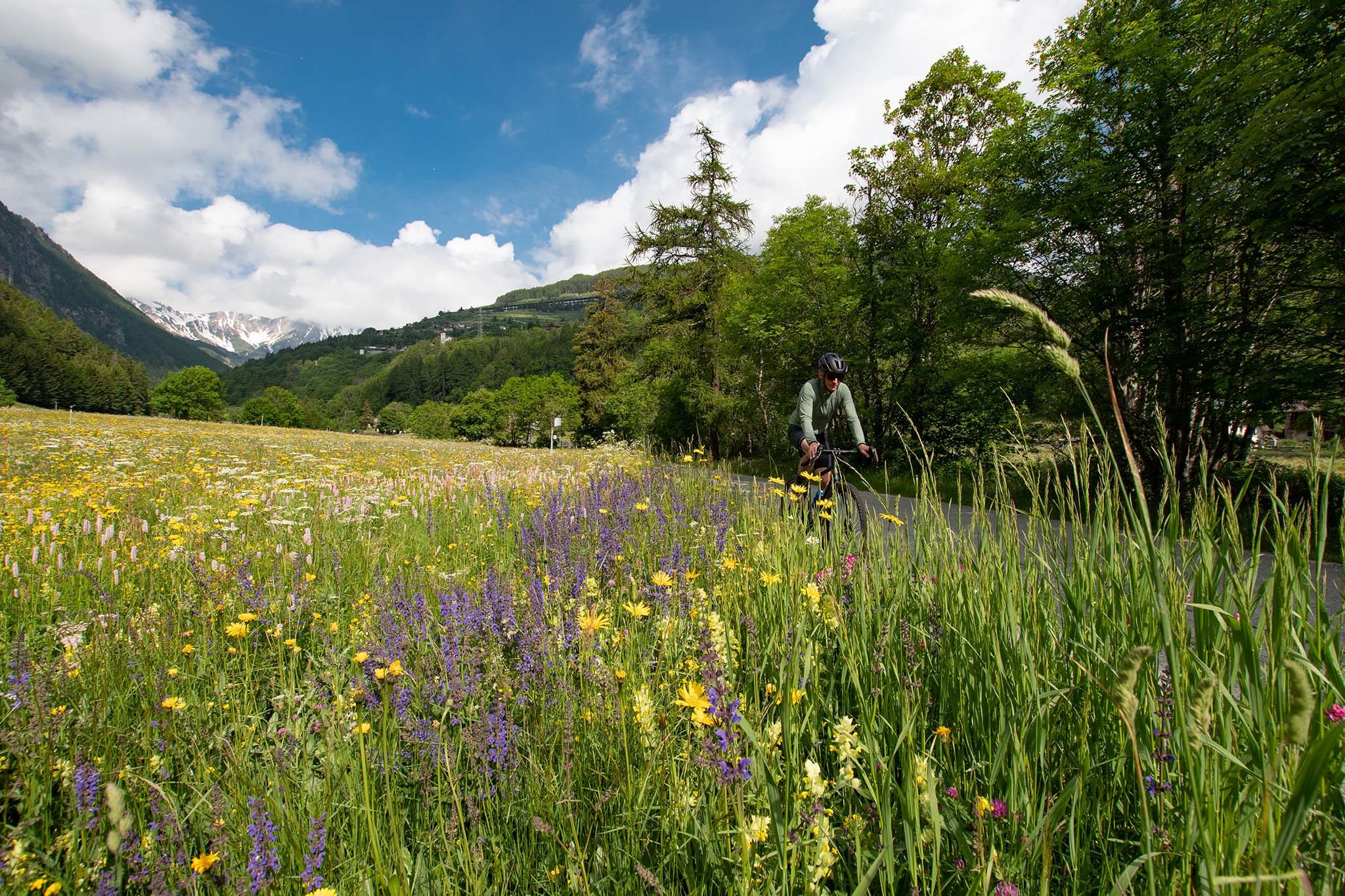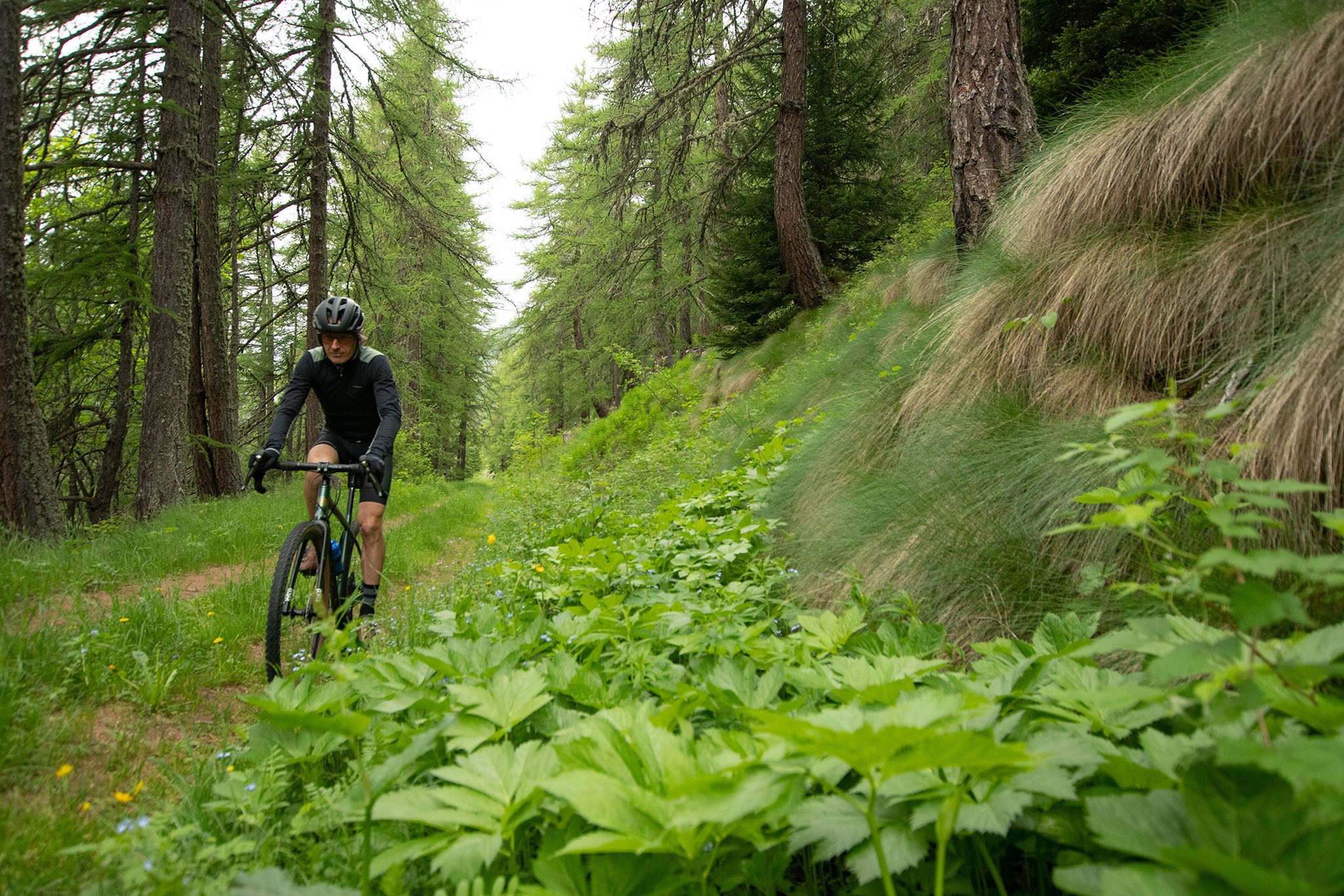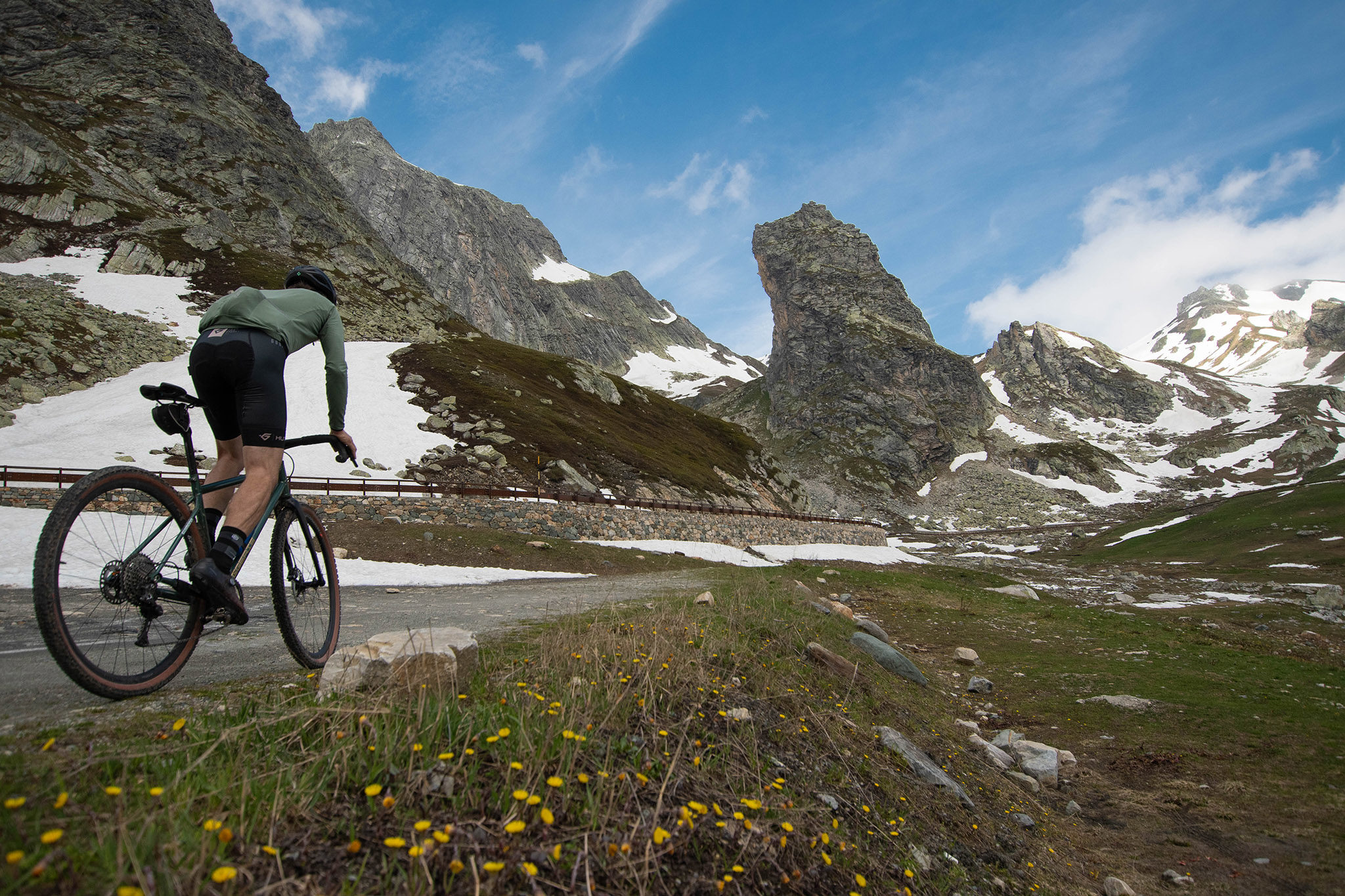 Grâce au gravel, nous évitons le grand axe routier du Saint-Bernard menant au tunnel éponyme. En contrebas, cachée des regards, une voie nous porte vers le haut de la vallée. En ce début du mois de juin, la floraison explose de mille tonalités. Nous longeons des prés fleuris à perte de vue. La route, secrète, passe par La Combaz, Saint-Léonard. Des hameaux vivant dans le silence, alors que là-haut, la route menant au tunnel est soumise aux vrombissements des moteurs. C’est cela la pratique du gravel : trouver des routes et des chemins peu empruntés et qui se découvrent à la lecture d’une carte.