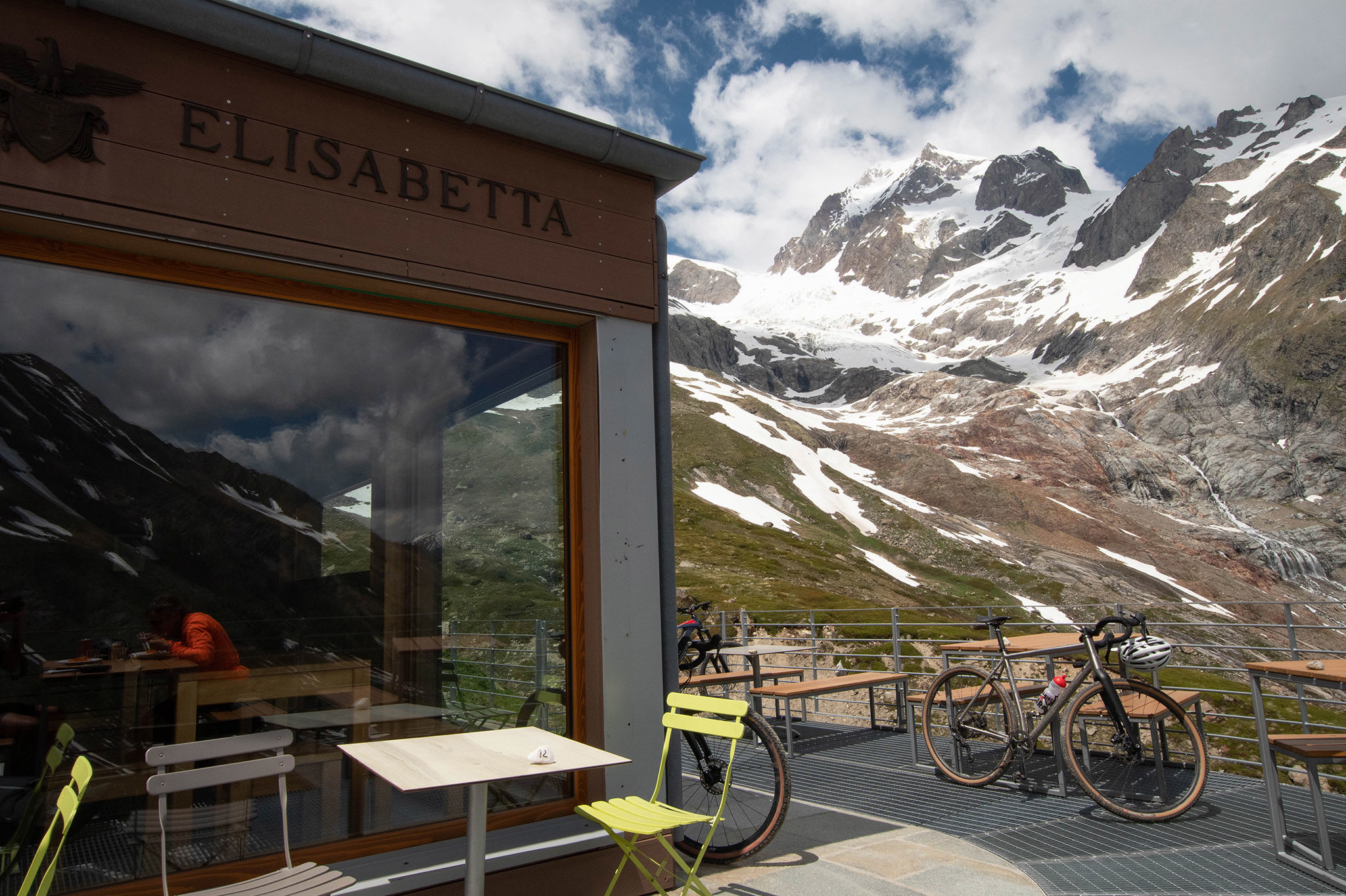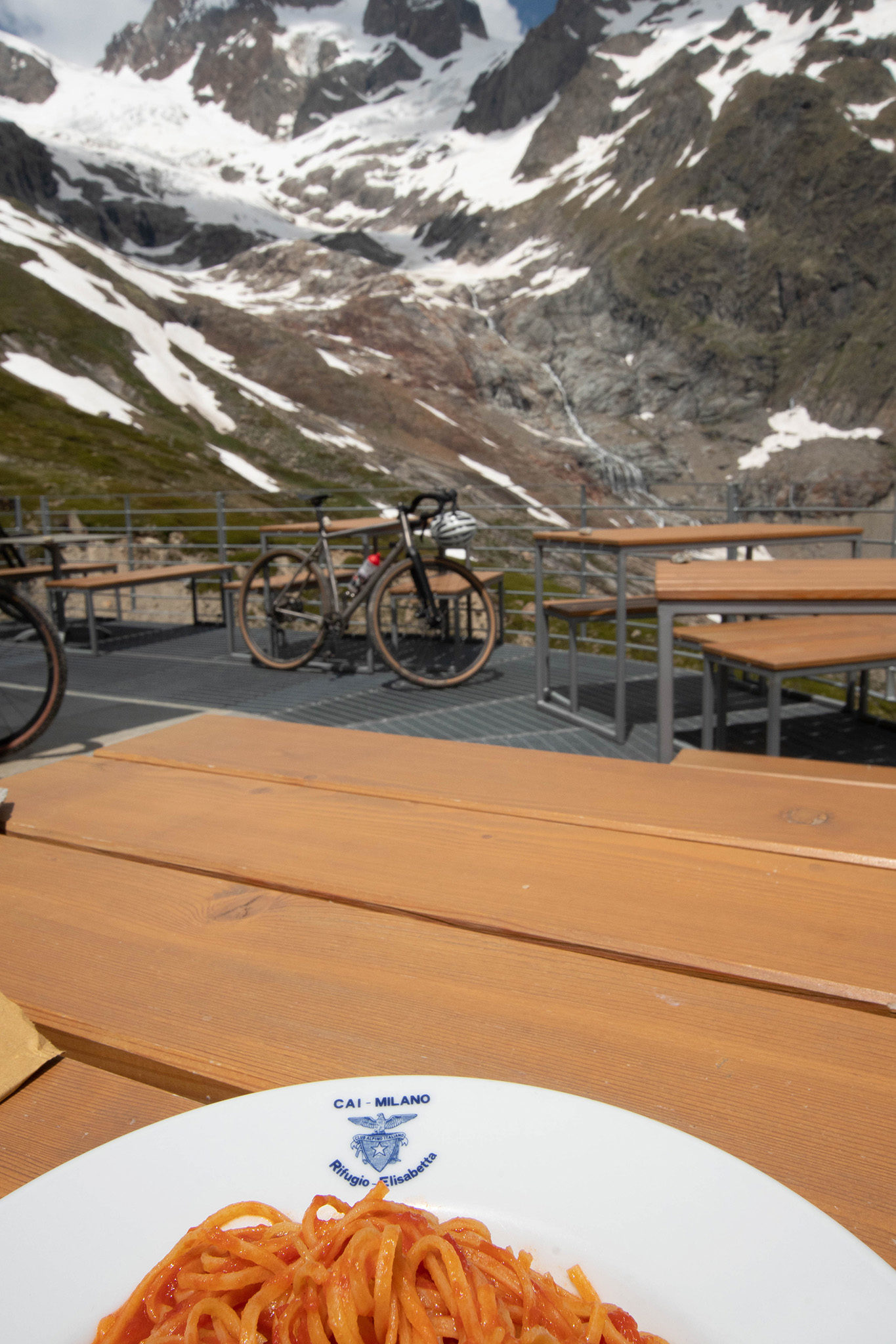 Le refuge Elisabetta, à 2.200 mètres d’altitude, est le point culminant de cette randonnée. Après un plat de pâtes bienvenu et un café bien serré, il nous faut repartir, l’orage menace. Malgré la facilité de son accès, le Val Veny demeurera toujours le royaume de la haute montagne et le côtoyer en gravel fut un moment rare.