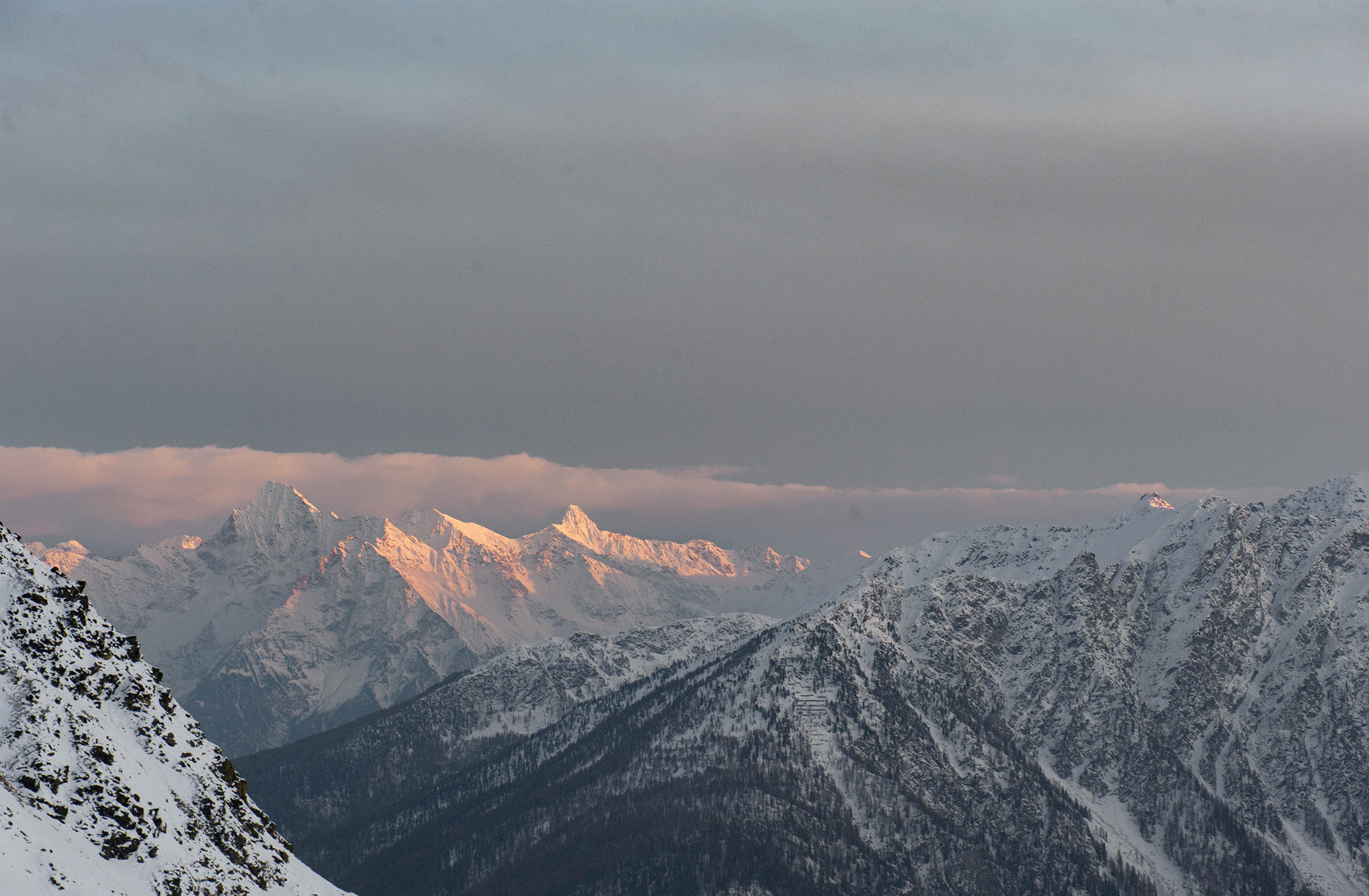 Au loin, vers le Sud, la lumière rosée annonce les prometteuses douceurs italiennes. Dans la Val d’Aoste, le contraste est saisissant.