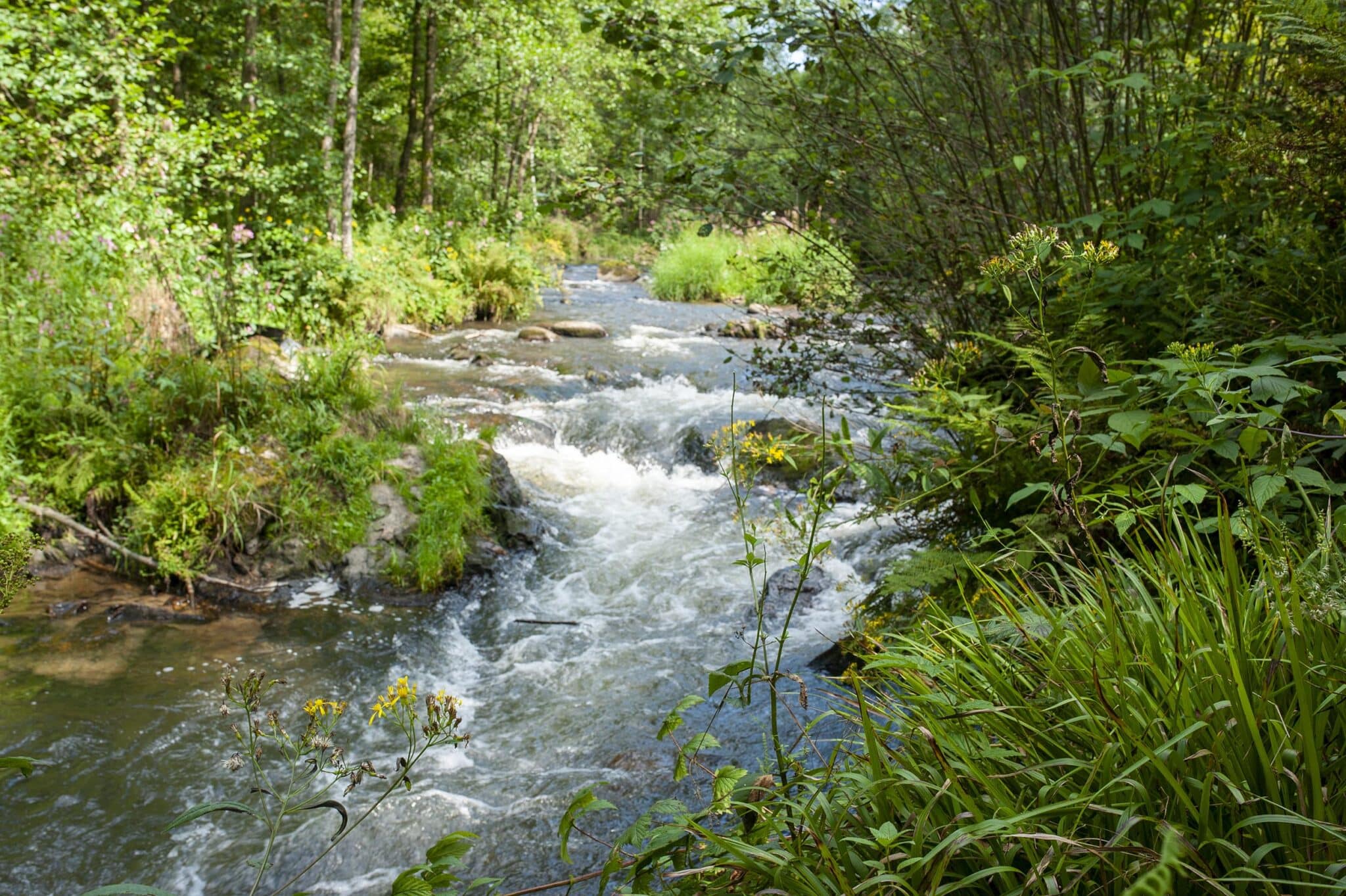 Avec la route rejetée en hauteurs, il se dégage le long de ses rives une belle sérénité. Le bruit de la rivière se fait de plus en plus pressant. Aucun son ne vient troubler ce lieu où la nature impressionne. De grosses écumes submergent les racines des aulnes, plantés en échasse. Un pont en bois et des petits caillebotis nous portent vers l’autre rive.