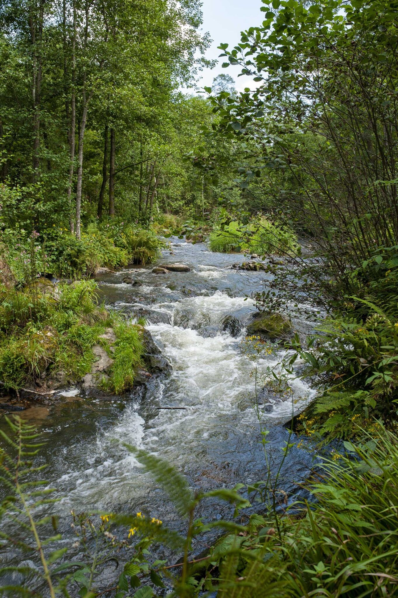 Avec la route rejetée en hauteurs, il se dégage le long de ses rives une belle sérénité. Le bruit de la rivière se fait de plus en plus pressant. Aucun son ne vient troubler ce lieu où la nature impressionne. De grosses écumes submergent les racines des aulnes, plantés en échasse. Un pont en bois et des petits caillebotis nous portent vers l’autre rive.
