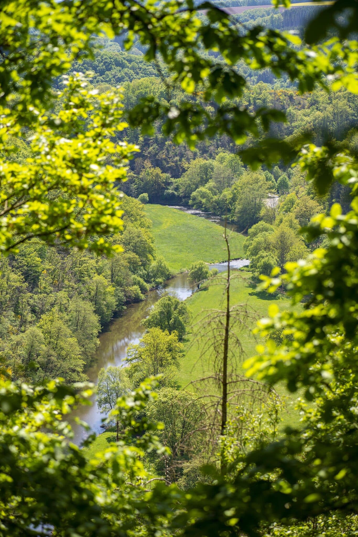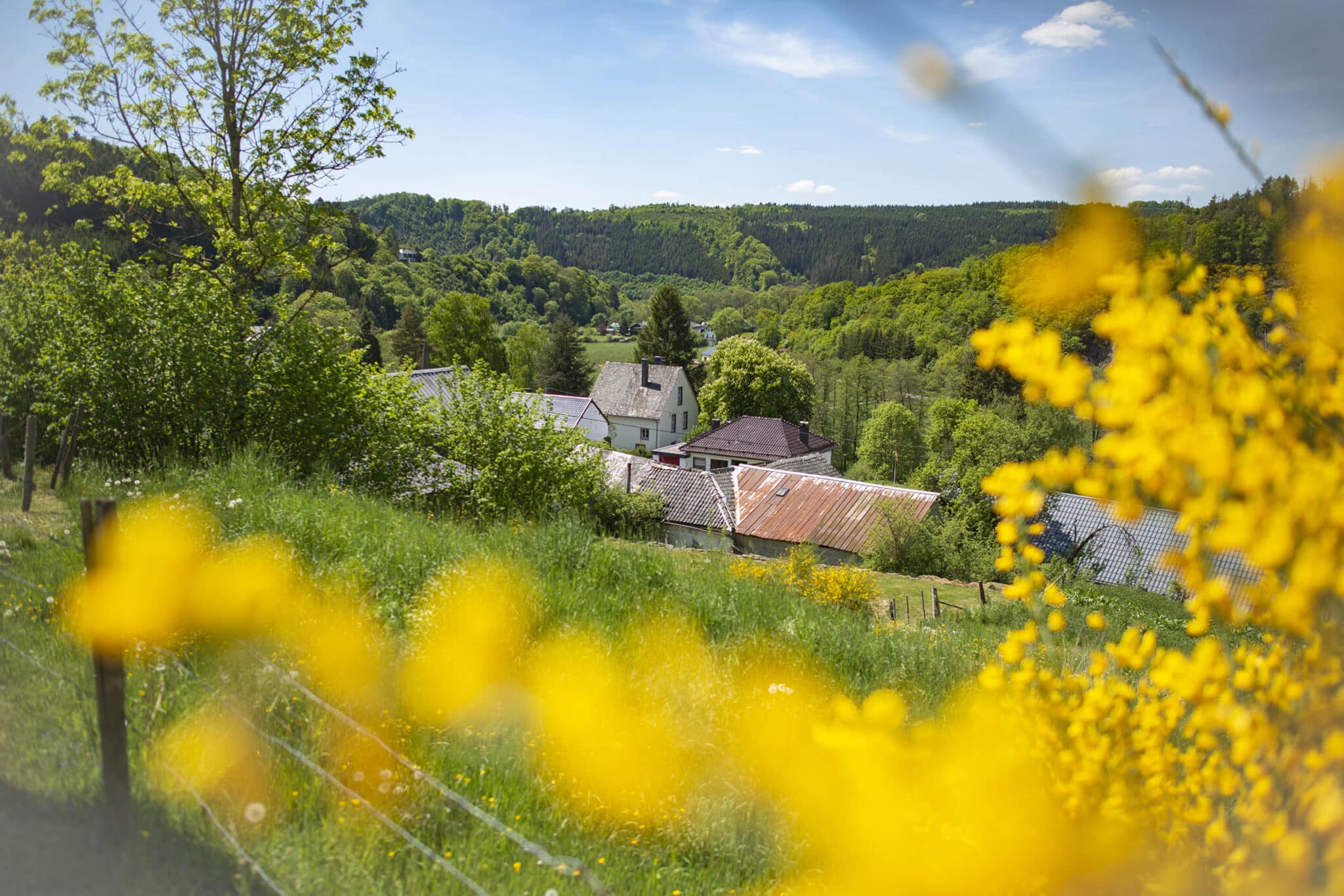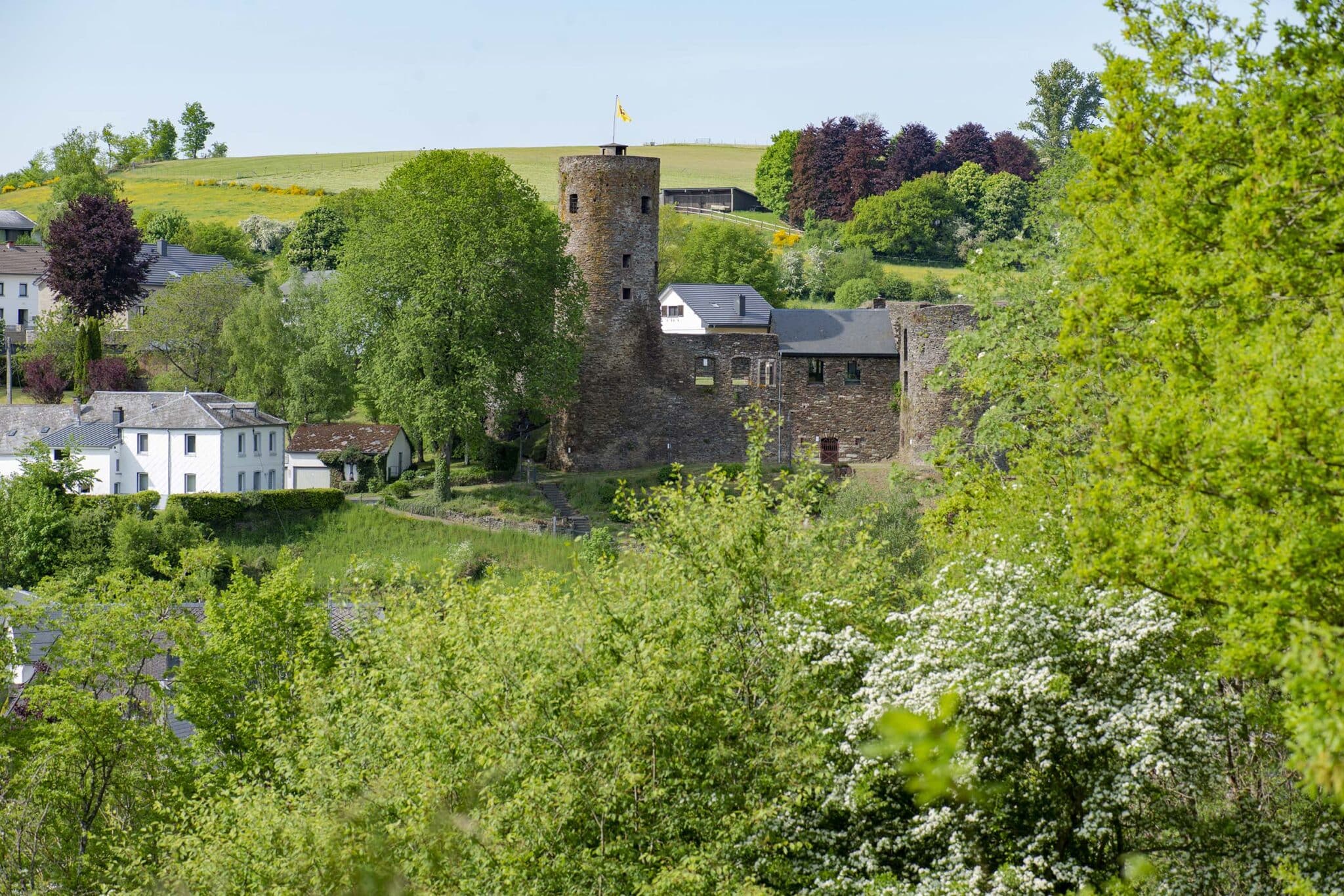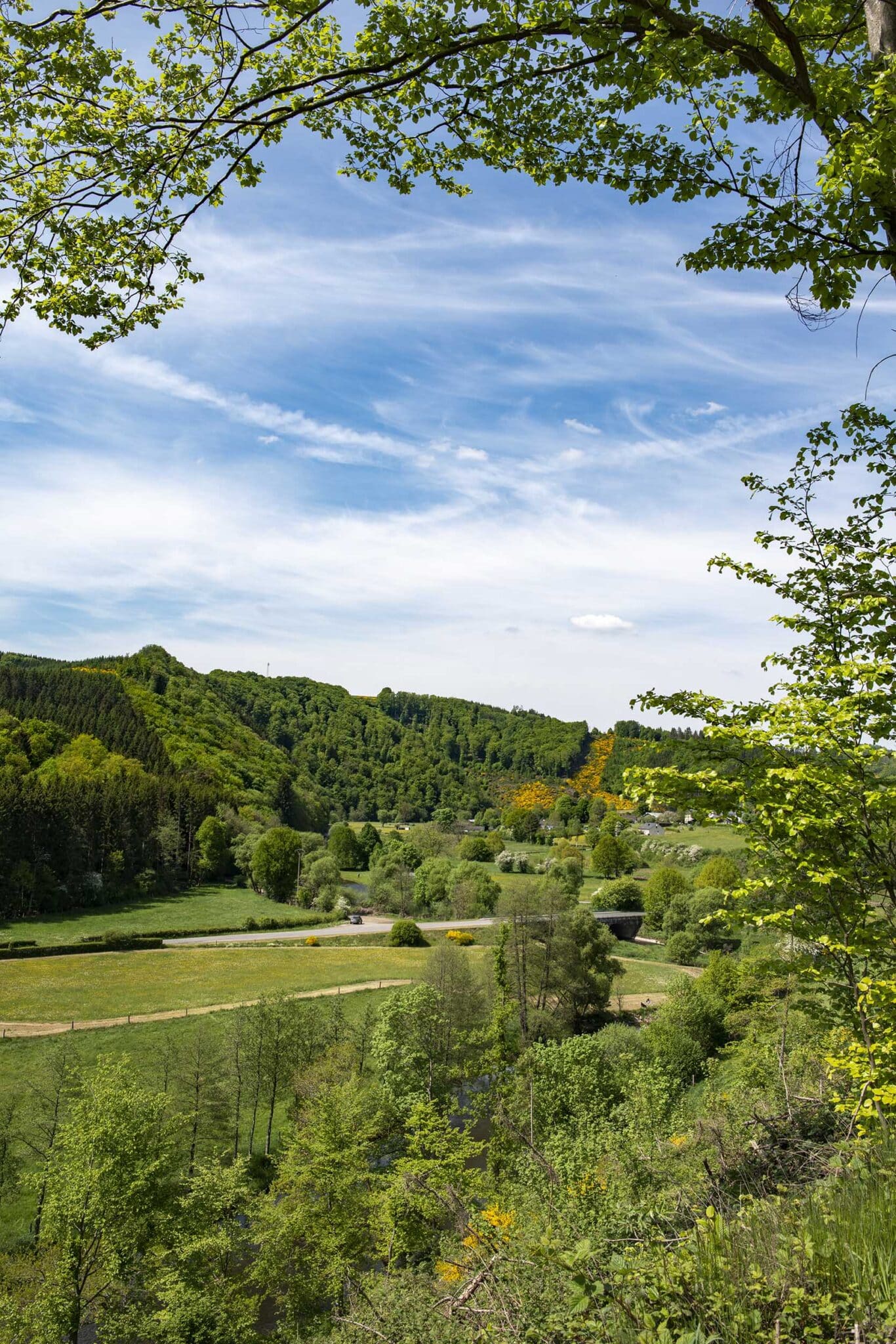 Burg-Reuland a gardé le caractère d’un village de l’Eifel avec ses maisons en colombage et son château médiéval. Dès les premiers mètres, la petite route en lacet grimpe vaillamment pour rejoindre les hauteurs du village dominé par les ruines du château-fort. L’ascension se poursuit, inexorablement vers la crête dominante. Le chemin rejoint le magnifique panorama qui se découvre à hauteur d’un abri. La vue qui s’étend au-delà de la frontière n’est qu’une succession de collines et de vallées encaissées : l’Eifel, cet autre massif forestier, prend le relais de l’Ardenne. L’itinéraire devient accidenté quand nous entrons dans la belle vallée de l’Our via un chemin très rapide.