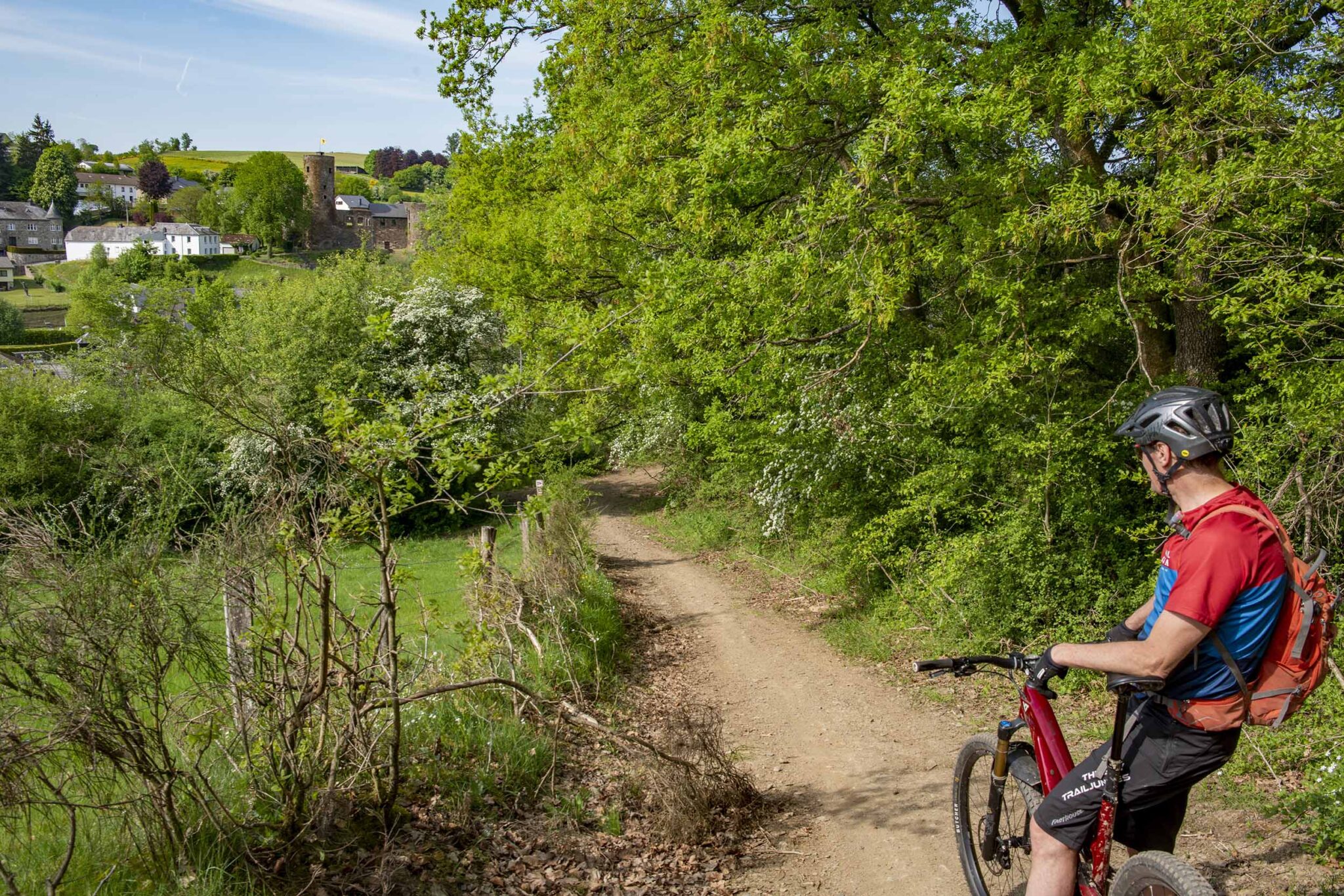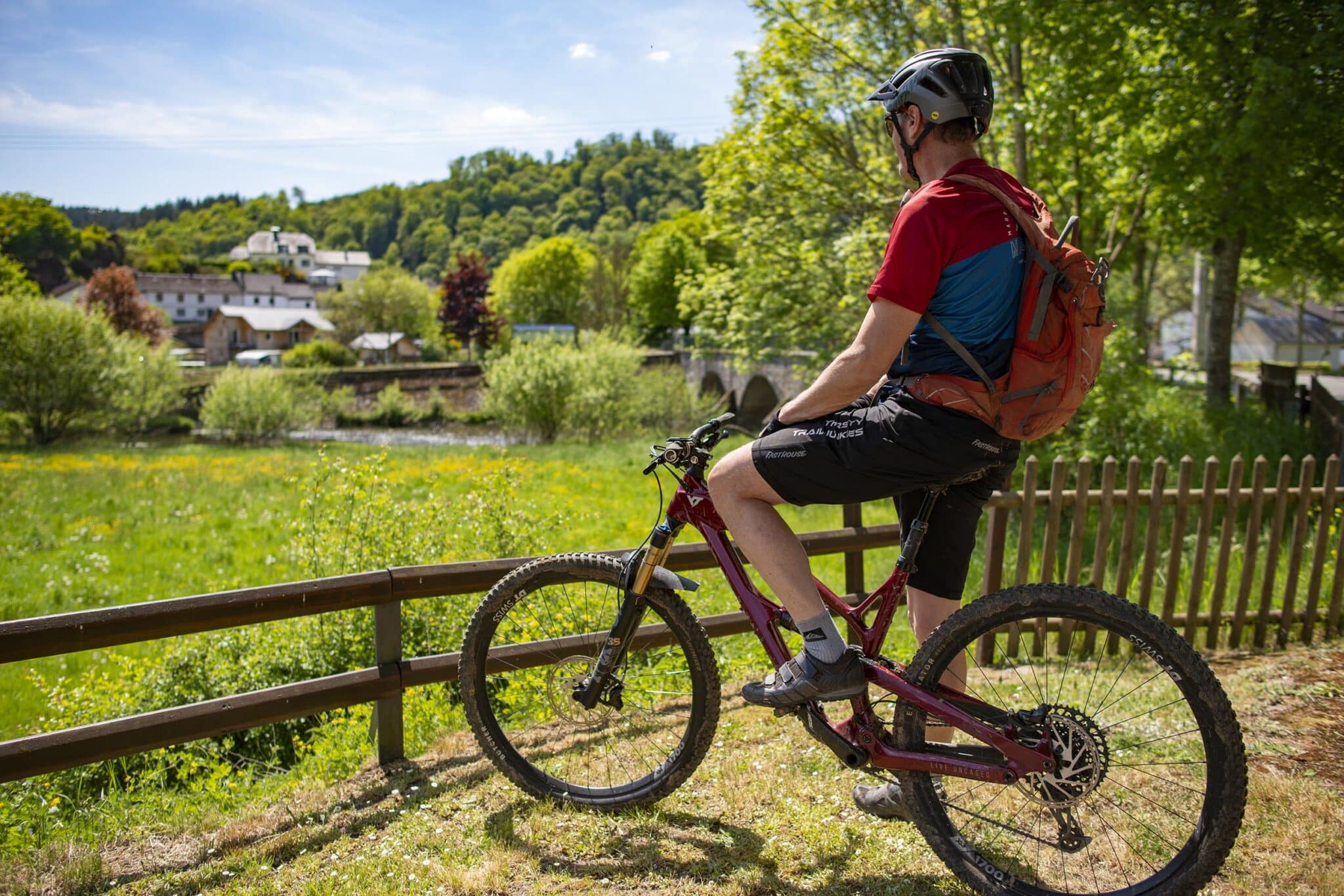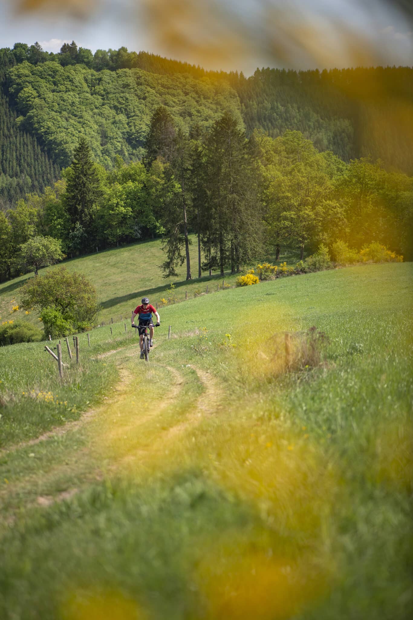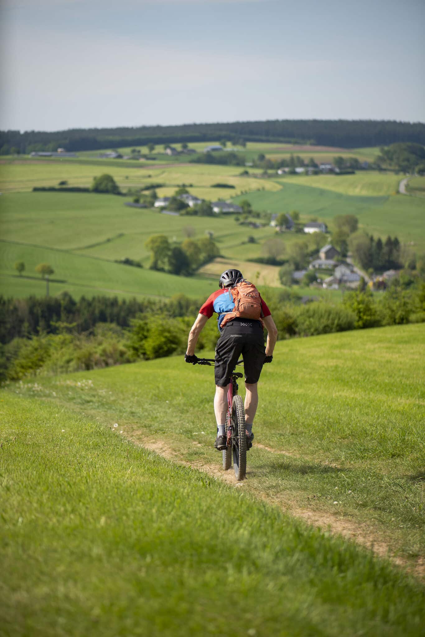 Nous voici sur une prairie non fauchée, dominant le village. Le soleil de cette fin de journée éclaire Burg-Reuland et révèle le paysage merveilleux de ce coin d’Ardenne peu connu, lieu de joie pour tous les amoureux de la randonnée à VTT.
