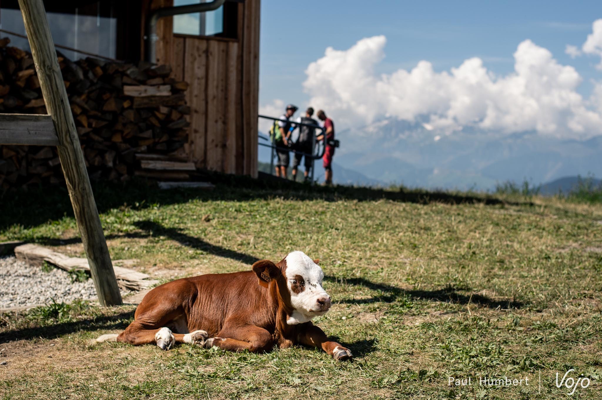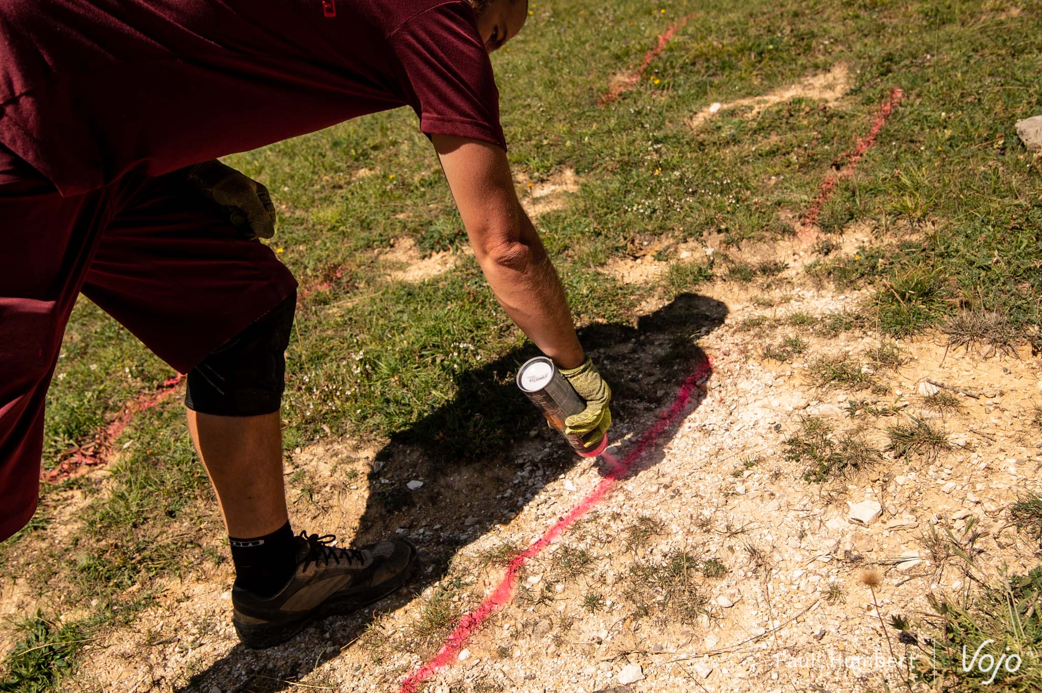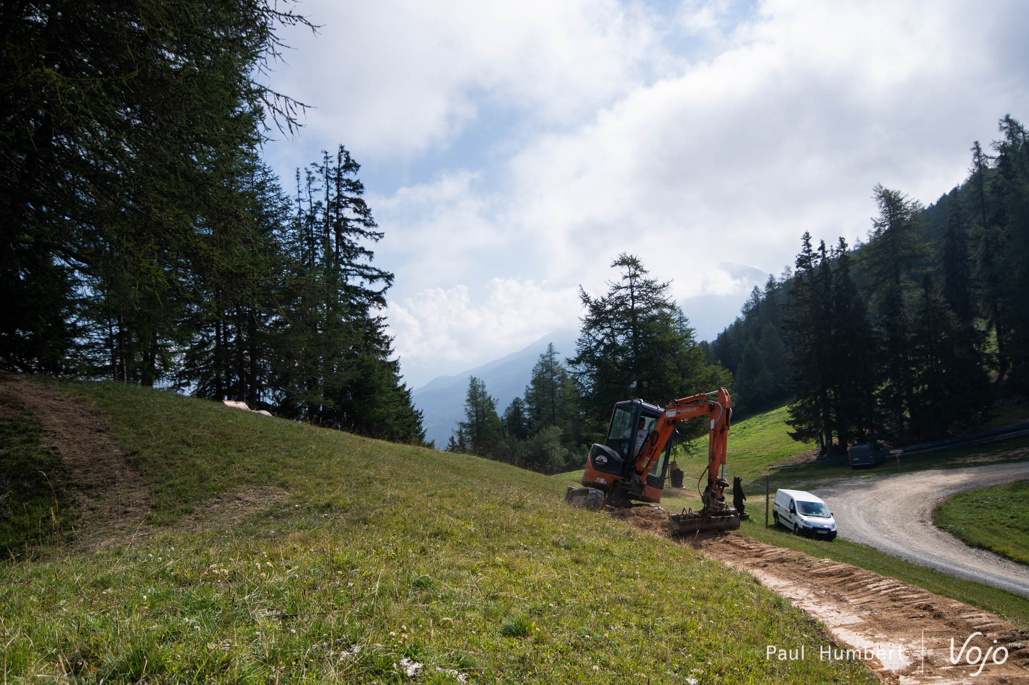Depuis le sommet du télésiège du bike-park, on rejoint le chantier du tout premier E-Spot en quelques minutes. Un balisage « électrique » est en place sur des grands chemins où les marmottes observent curieusement nos étranges machines.