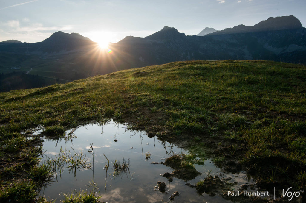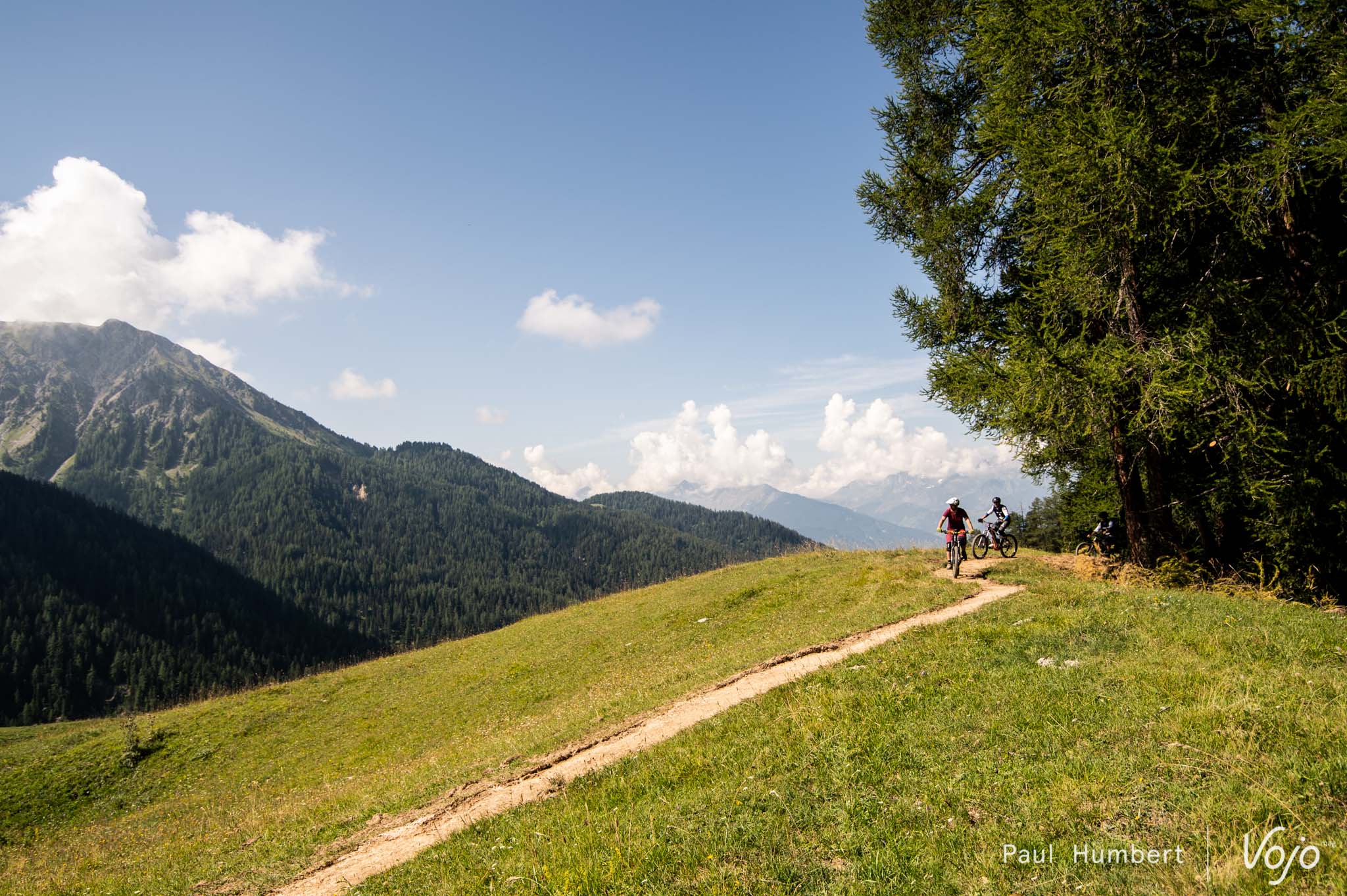 Sur les parcours faciles, on prend le temps, comme le feraient des débutants, et on grimpe tranquillement pour replonger dans la pente. En fin de boucle, on sort des bois pour retrouver les alpages et une belle vue sur les montagnes.