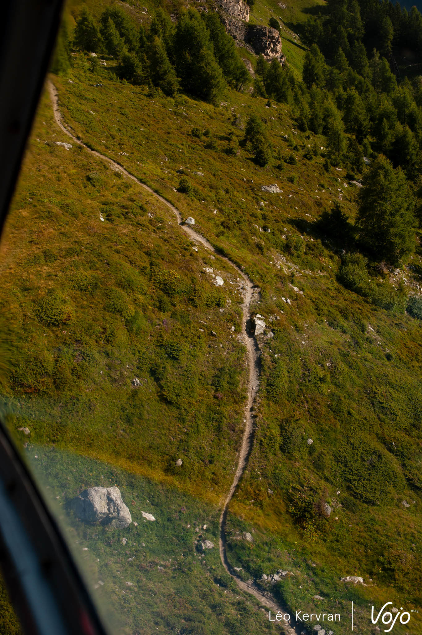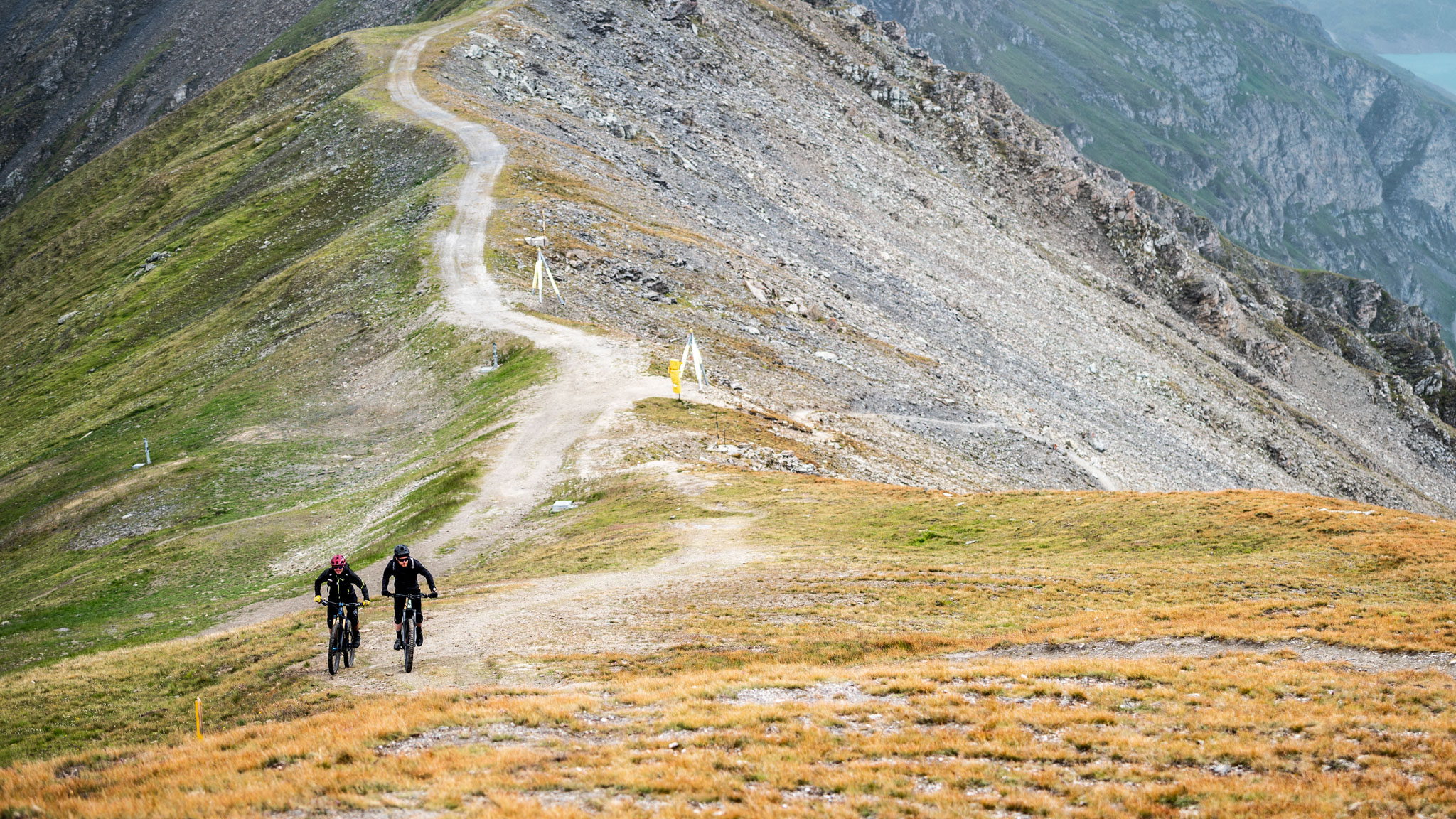Sous le barrage, on rejoint les derniers kilomètres du parcours du Grand Raid pour retourner sur Grimentz. Le chemin, tantôt singletrack parfois technique à flanc de montagne tantôt plus ouvert sur ce qui ressemble à une ancienne voie romaine, est encore très rapide. Si on s’amuse dessus avec nos gros vélos, on imagine sans peine que ça doit être un peu plus difficile pour les concurrents du Grand Raid, souvent en semi-rigide et qui arrivent sur cette section après 6 heures d’effort ininterrompu… pour les meilleurs.
