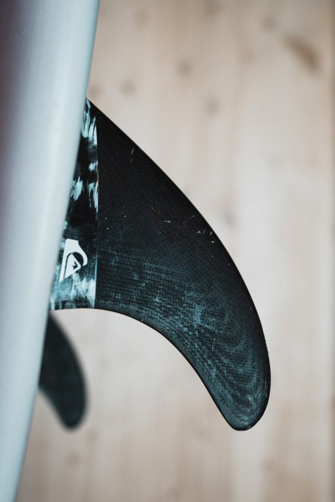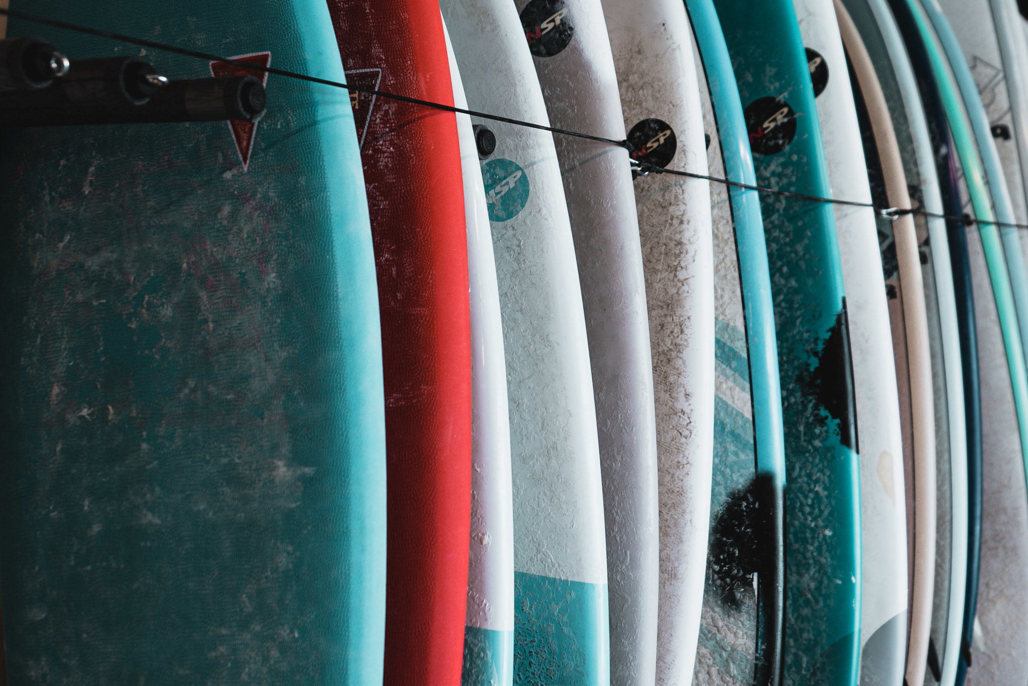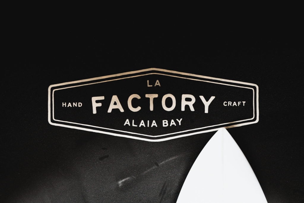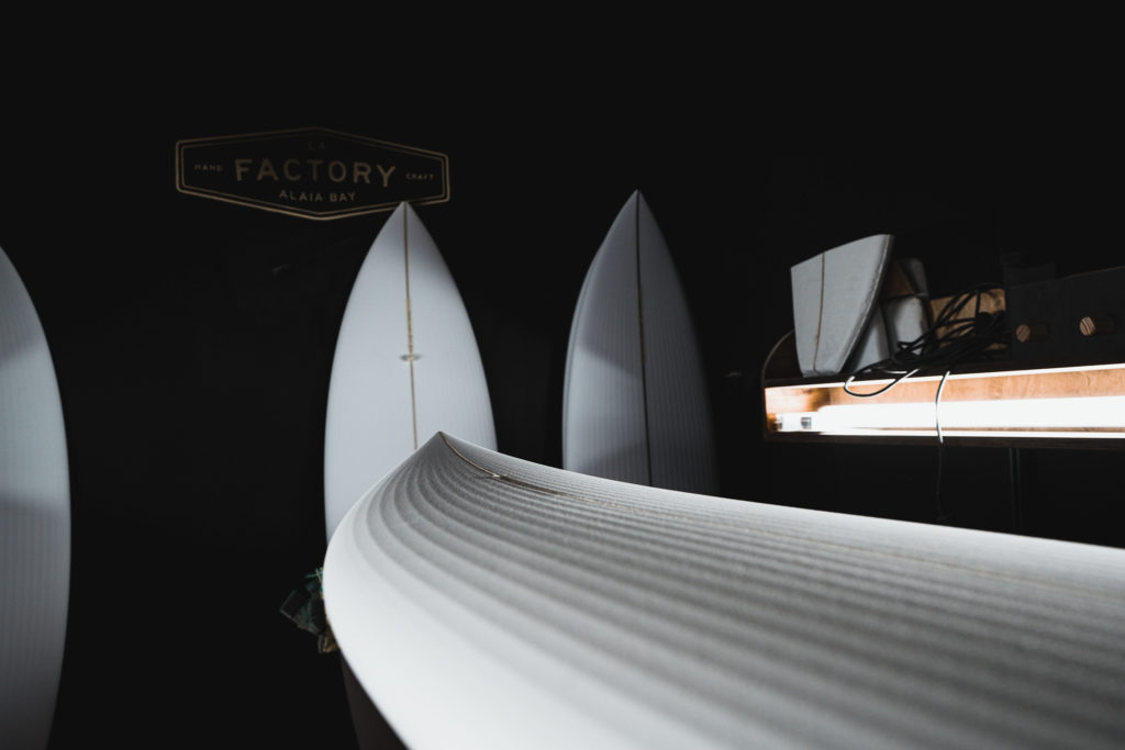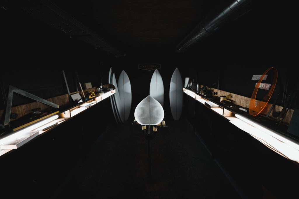 Au-delà du bassin, Alaïa Bay abrite aussi un magasin, un restaurant et surtout un atelier de fabrication/personnalisation/réparation de planche, que nous avons eu l’occasion de visiter. Situé sous le bâtiment, il faut emprunter un petit escalier étroit pour y accéder et lorsqu’on passe la dernière porte, on croirait entrer dans une salle aux trésors. Murs noirs qui contrastent avec les planches blanches, plan de travail en bois, éclairage rasant pour traquer les moindres imperfections… c’est aussi beau que fonctionnel.