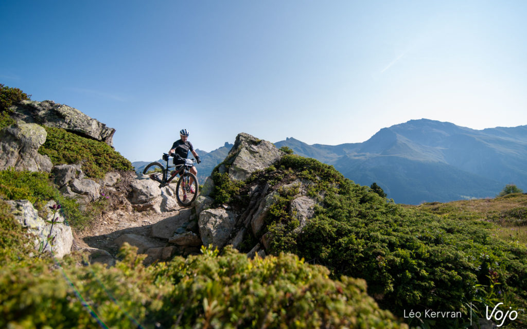 Pour le rejoindre, un sentier dévale la montagne. D’abord raide en bordure de pierrier, il se fait ensuite bien plus accessible et flow en rejoignant les pentes de l’alpage, avant de terminer par des sections un peu plus étroites et techniques juste au-dessus du barrage. C’est déjà sympa en e-bike mais qu’est-ce que ça doit être avec un petit vélo léger et joueur !