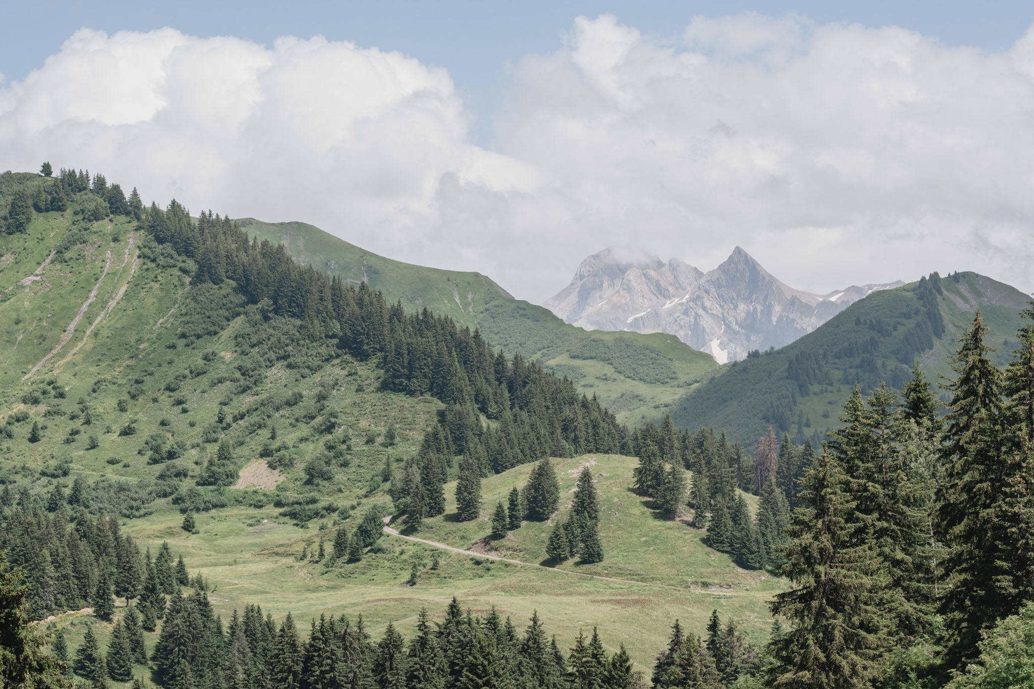 Depuis Les Gets, on y accède par une longue section de piste qui nous offre à quelques reprises de superbes panoramas sur les massifs environnants, dont certains des plus beaux sommets au-dessus de Sixt-Fer-à-Cheval : Pointe de la Golette, Grand Mont Ruan…