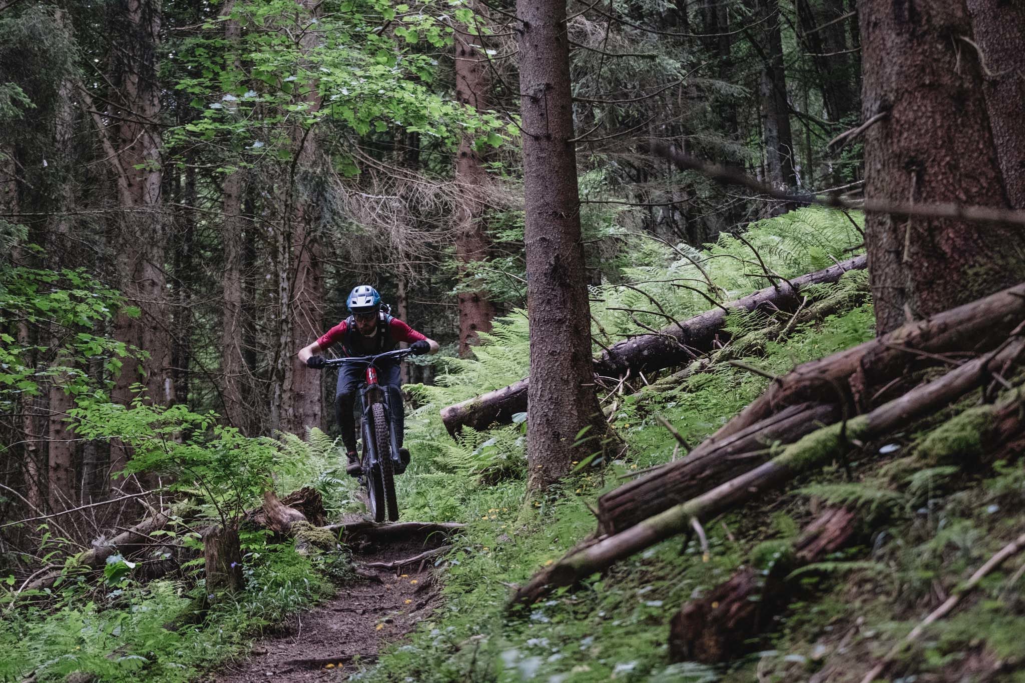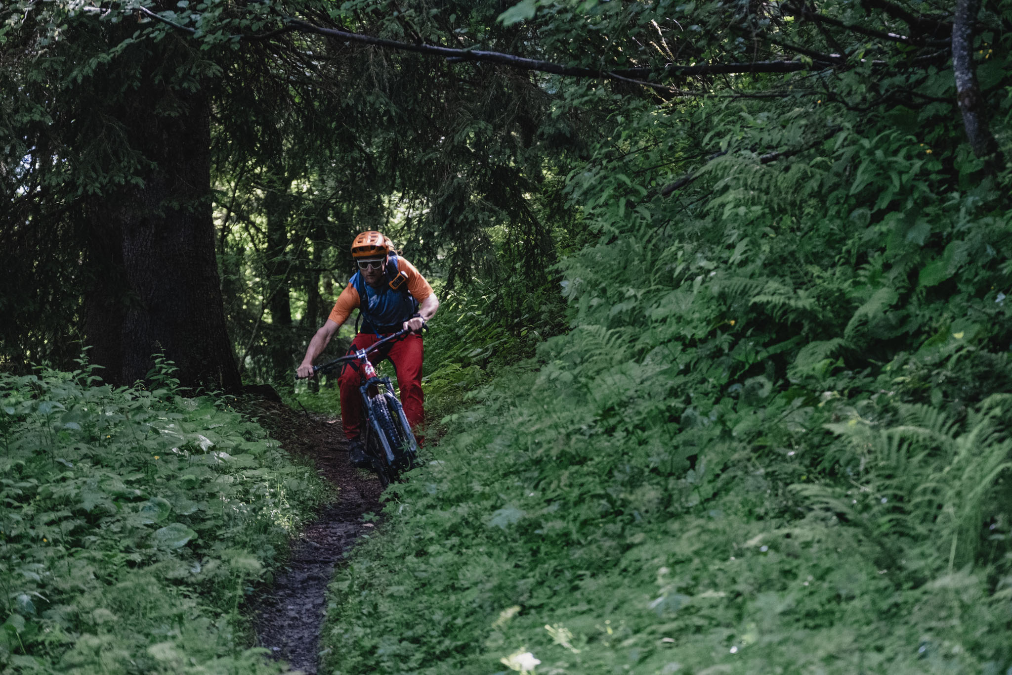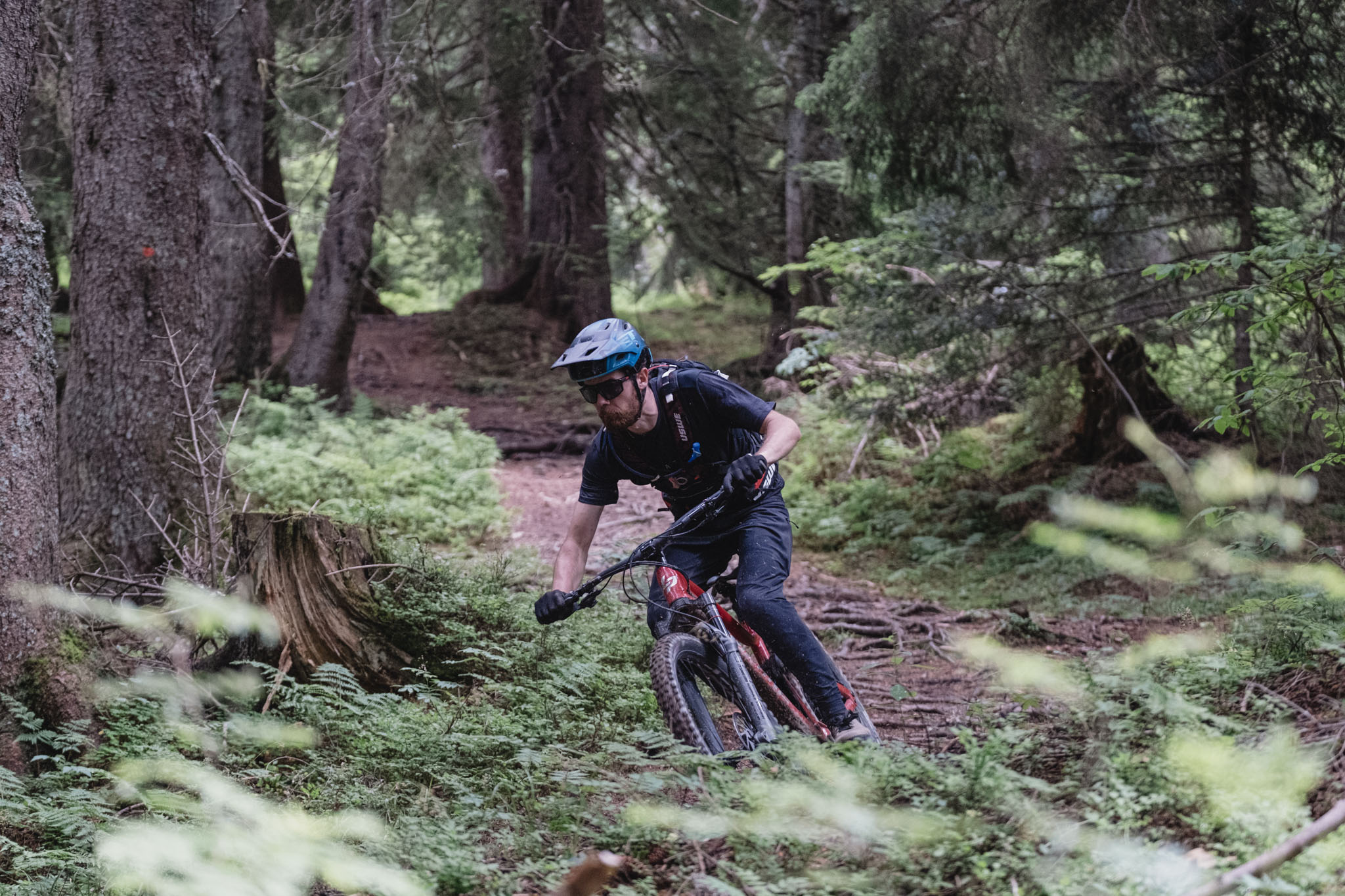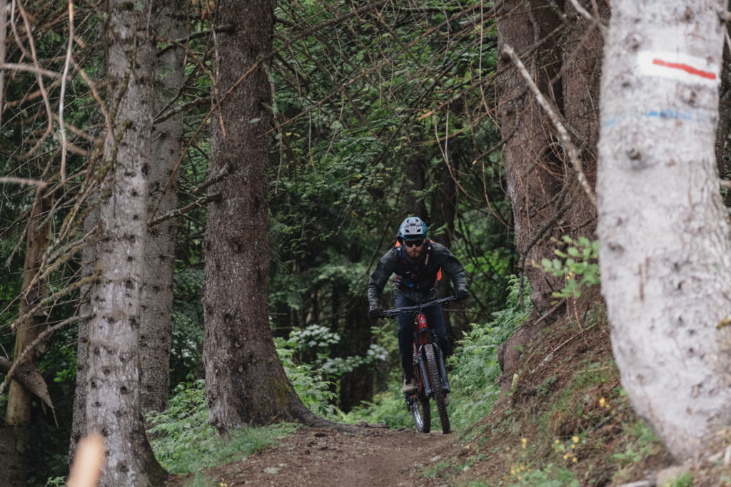 On bascule enfin dans la descente et après les pistes larges et tracées à la pelleteuse du matin, le changement de décor est radical avec ce petit singletrack. Bourré de racines, il serpente dans la forêt, d’abord technique dans sa partie haute avec quelques épingles, puis beaucoup plus joueur au fur et à mesure qu’on se rapproche des Gets.