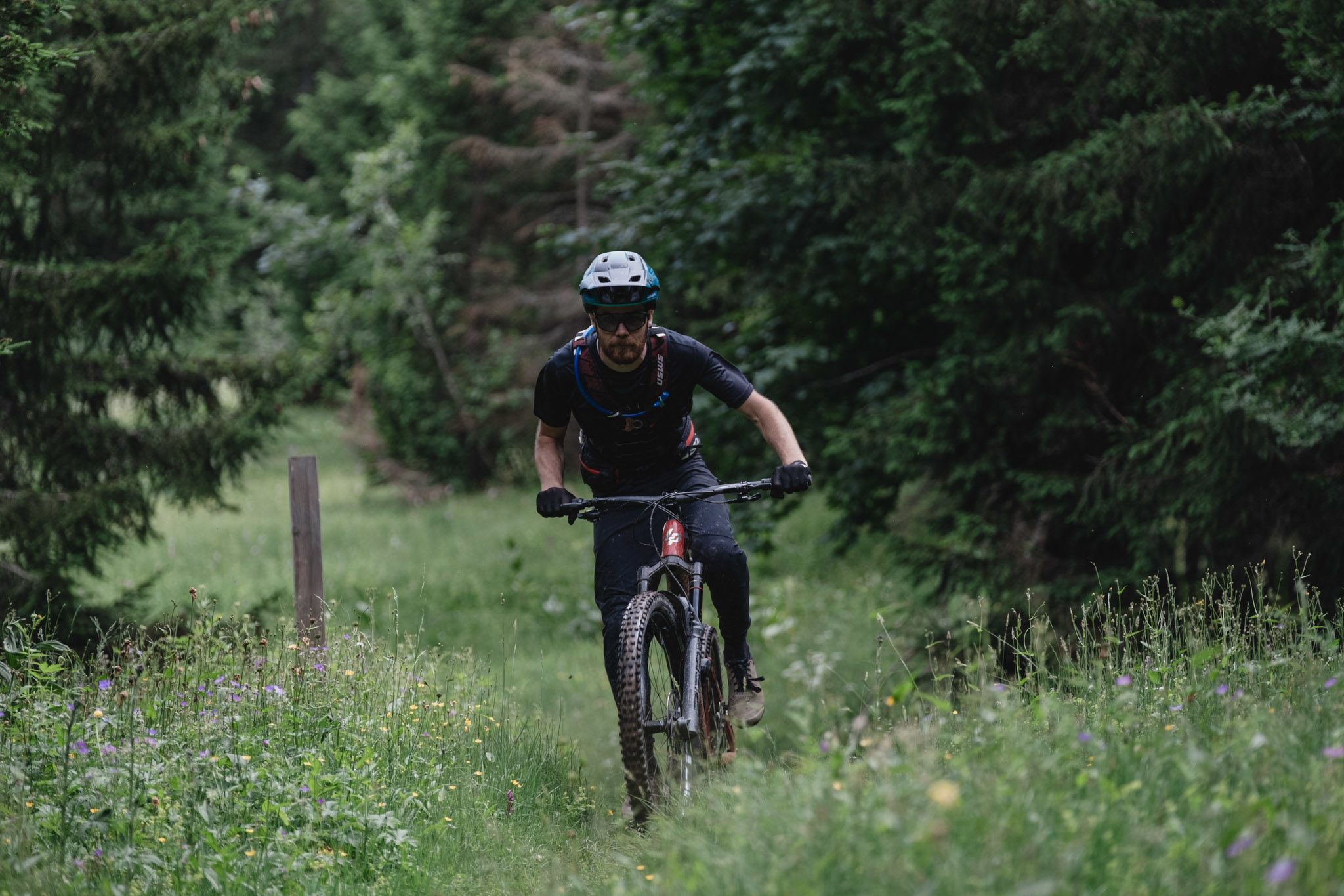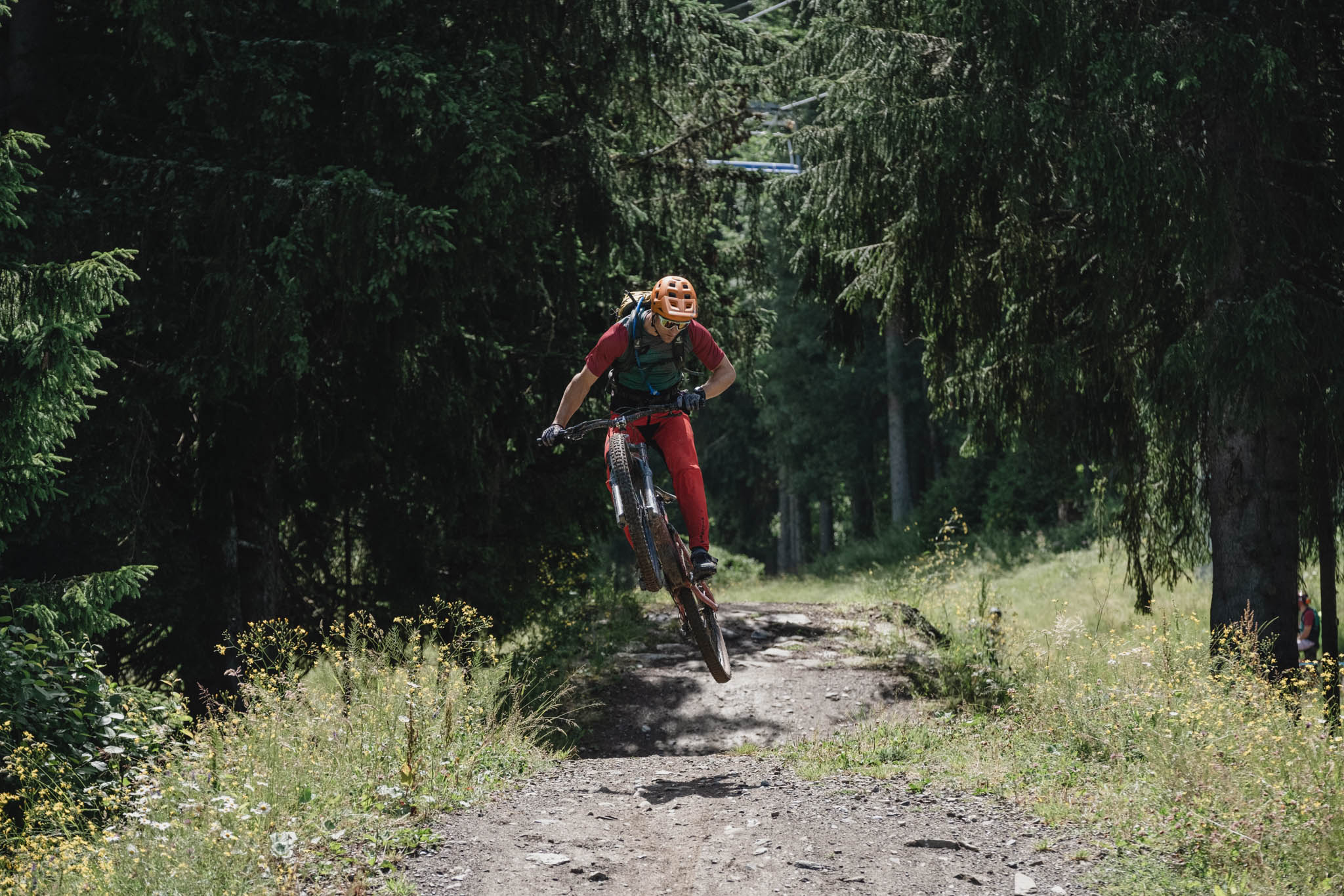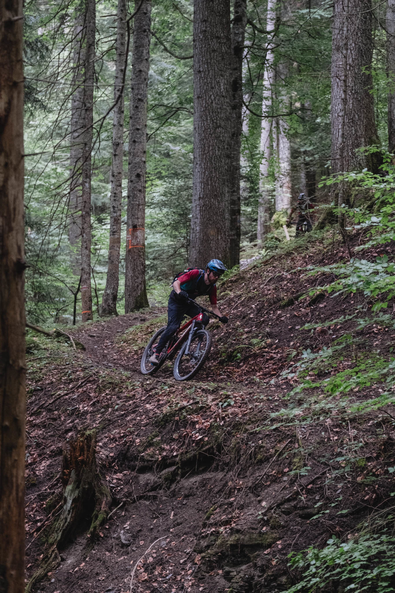On bascule enfin dans la descente et après les pistes larges et tracées à la pelleteuse du matin, le changement de décor est radical avec ce petit singletrack. Bourré de racines, il serpente dans la forêt, d’abord technique dans sa partie haute avec quelques épingles, puis beaucoup plus joueur au fur et à mesure qu’on se rapproche des Gets.