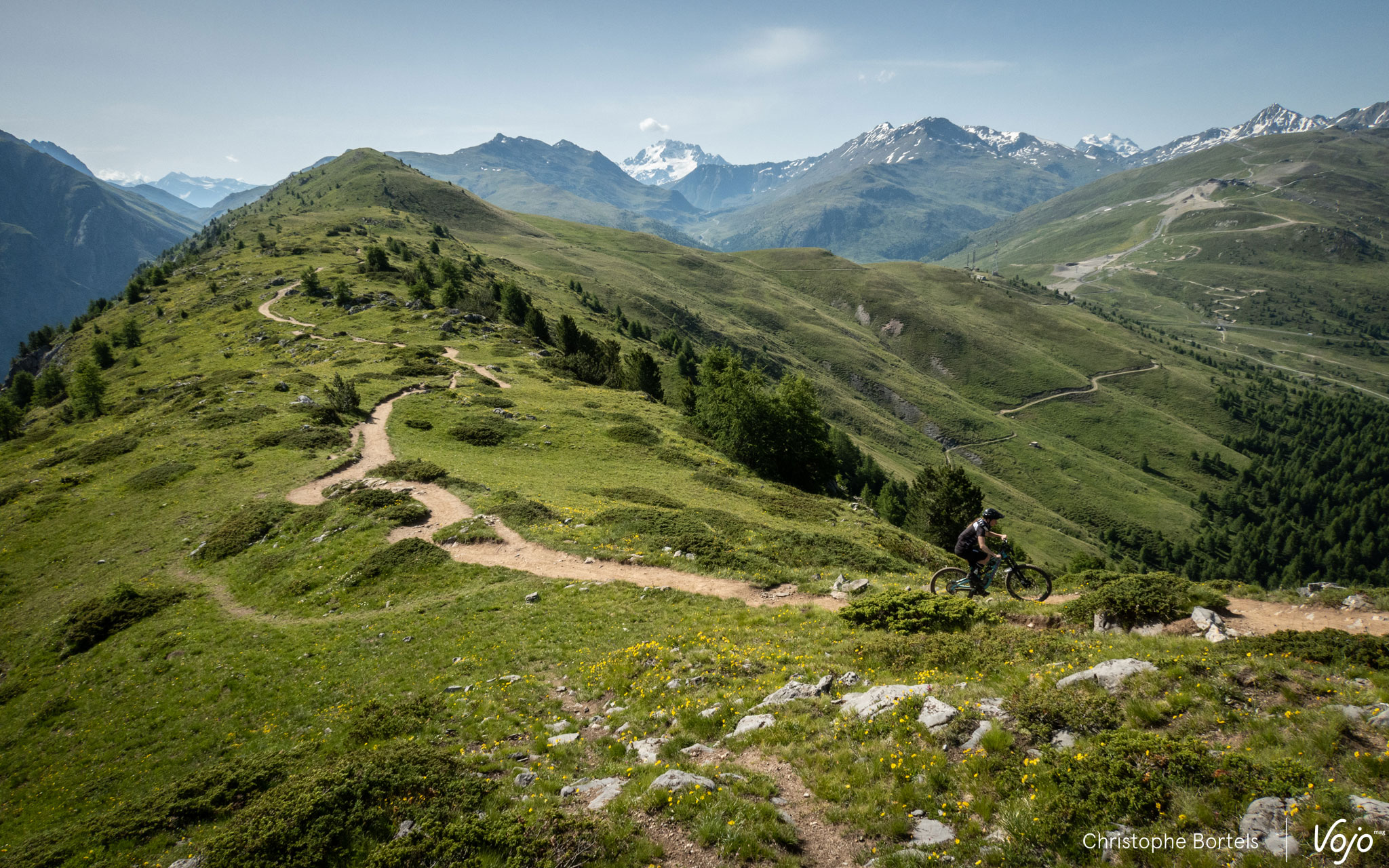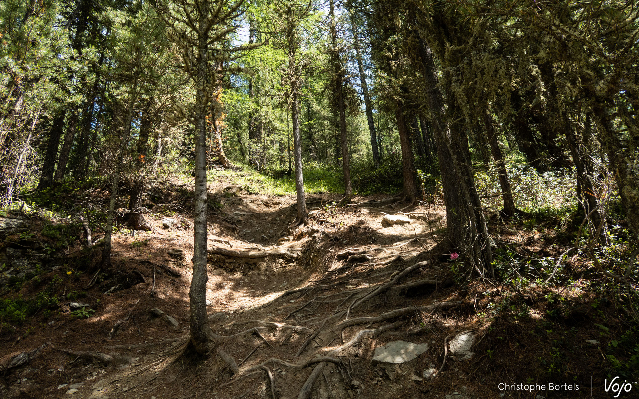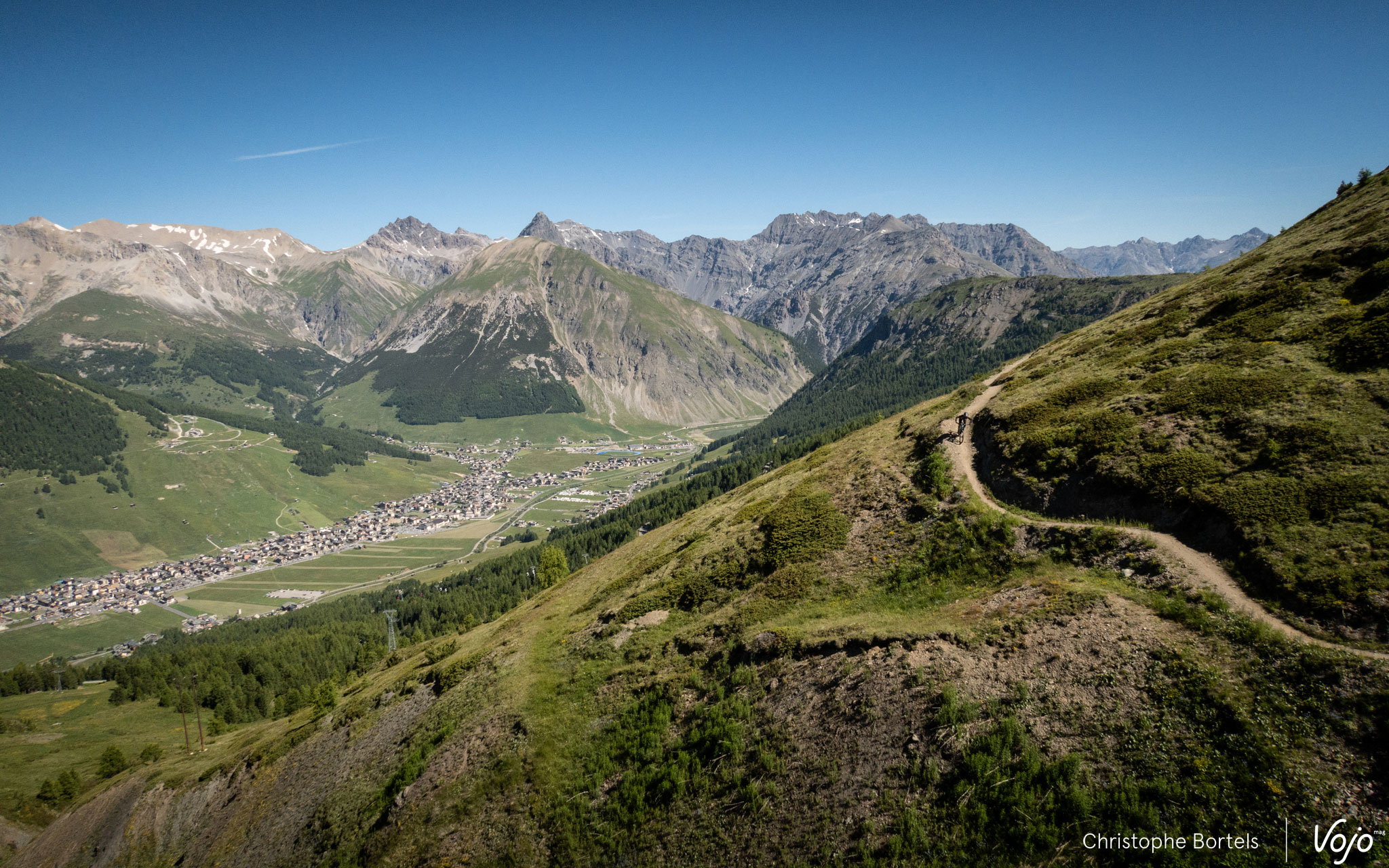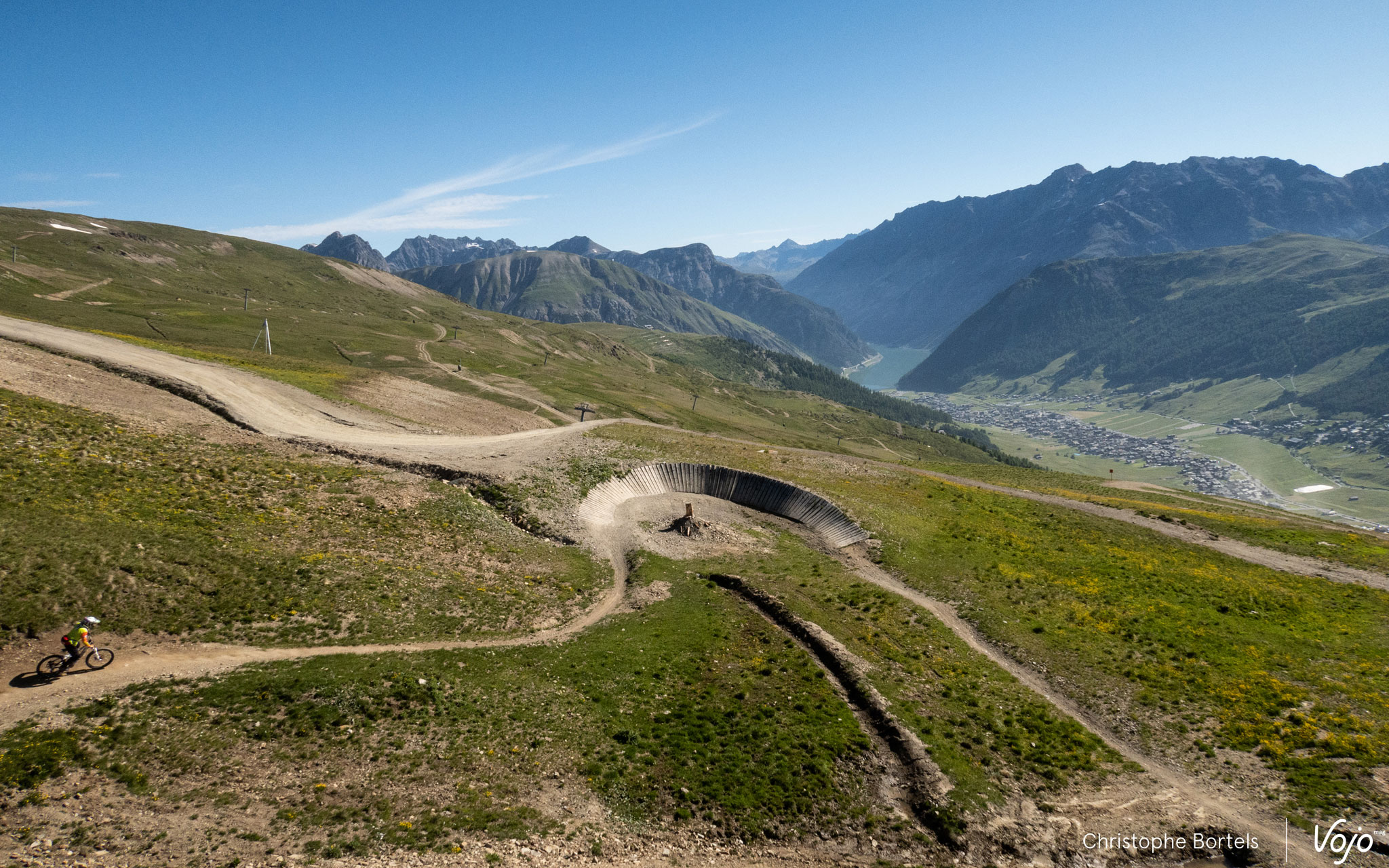 Même topo pour l’autre bleue, Enduro Natural Trail (5,6km), qui part du côté opposé, en suivant la courbe de niveau dans un premier temps. Plate et obligeant à pomper pour garder du rythme, ce n’est pas la partie la plus amusante, mais on en prend plein les yeux avec une vue imprenable sur Livigno.