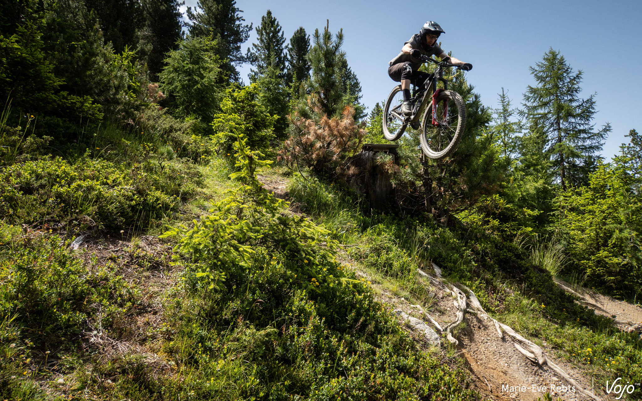 Les pistes noires, quant à elles, sont la plupart du temps des dérivations aux rouges, qui prennent plus droit dans la pente et sont généreuses en racines. On y retrouve aussi quelques options aériennes comme celle-ci, particulièrement impressionnante.