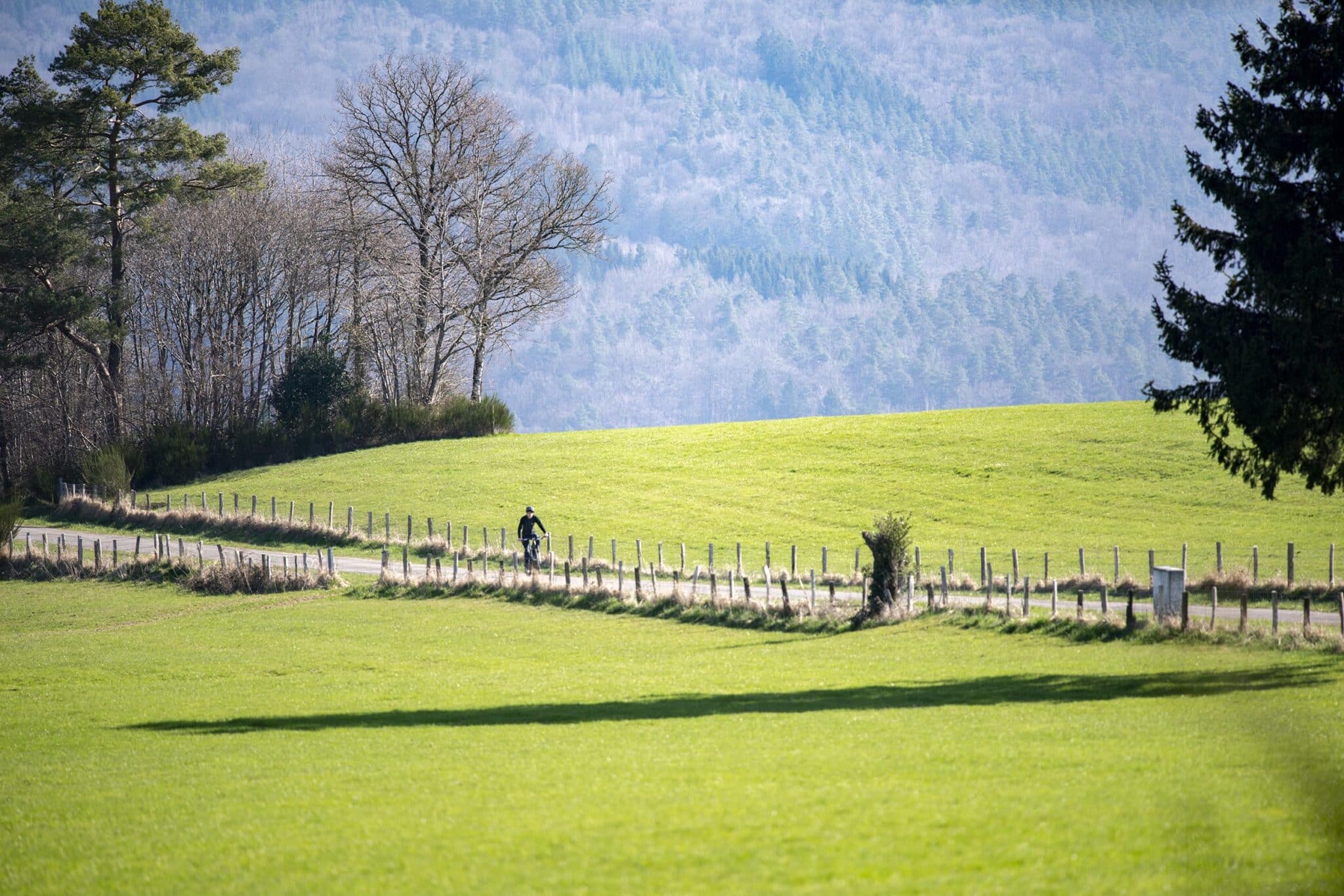 Le hameau de Grande-Hoursine, au sommet d’une butte, se donne des airs de paysages vosgiens. À Intinchera, un joli lieu-dit au cœur de la forêt, un carrefour de sentiers nous indique la route à suivre. Nous empruntons un large chemin, bien stable. Nous entrons dans un des plus grands massifs verts de la région.