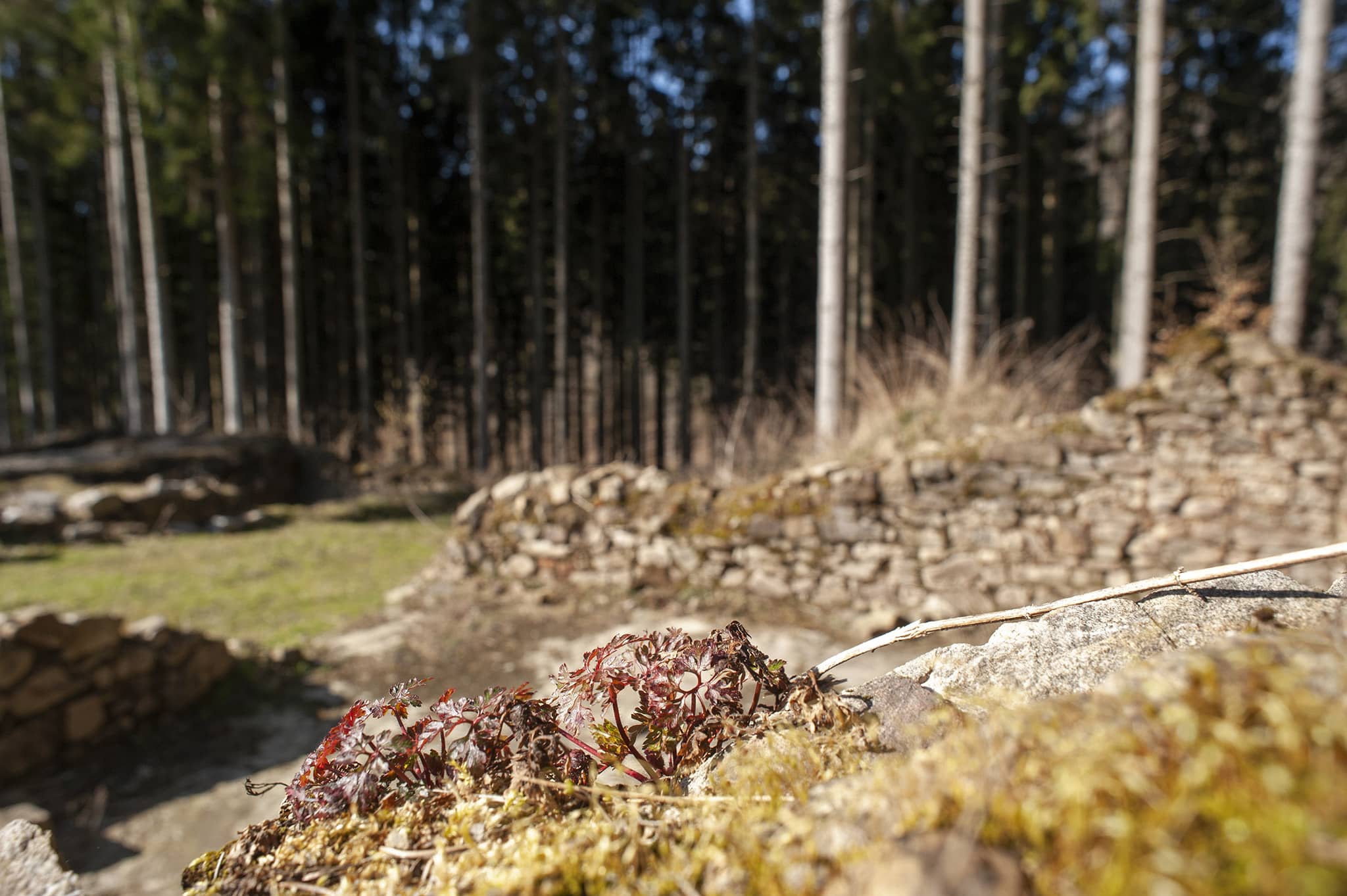 La balade s’y enfonce de plus en plus quand apparaît une maison reconstruite, incongrue dans ce paysage forestier. A nos pieds, la forêt artificielle d’épicéas a recouvert les pavés d’une ancienne rue.