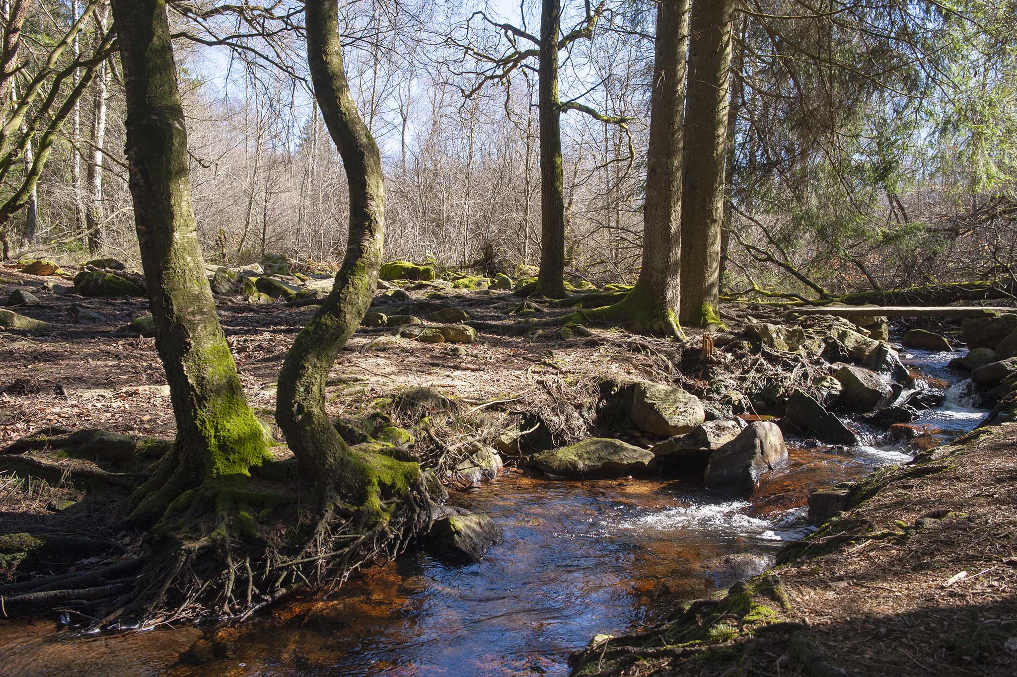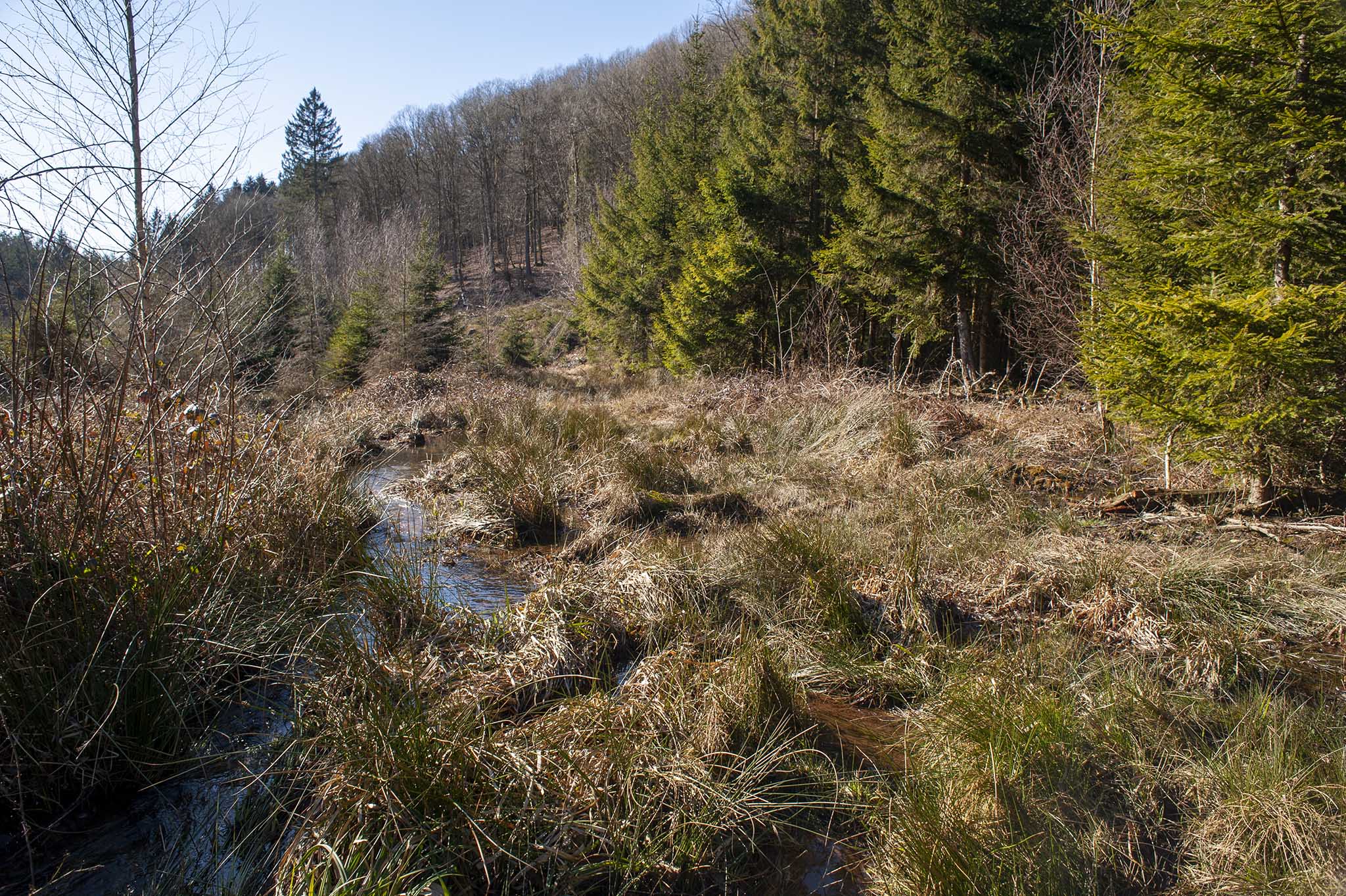 Dans le fond du vallon, le plaisir se poursuit quand nous passons le gué de l’Aisne, proche de l’ancien chemin de fer. Peu après la longue ascension, les conifères sont rejetés sur les sommets de la colline, recouvrant les anciennes landes à bruyères et les terres incultes du XIXe siècle.