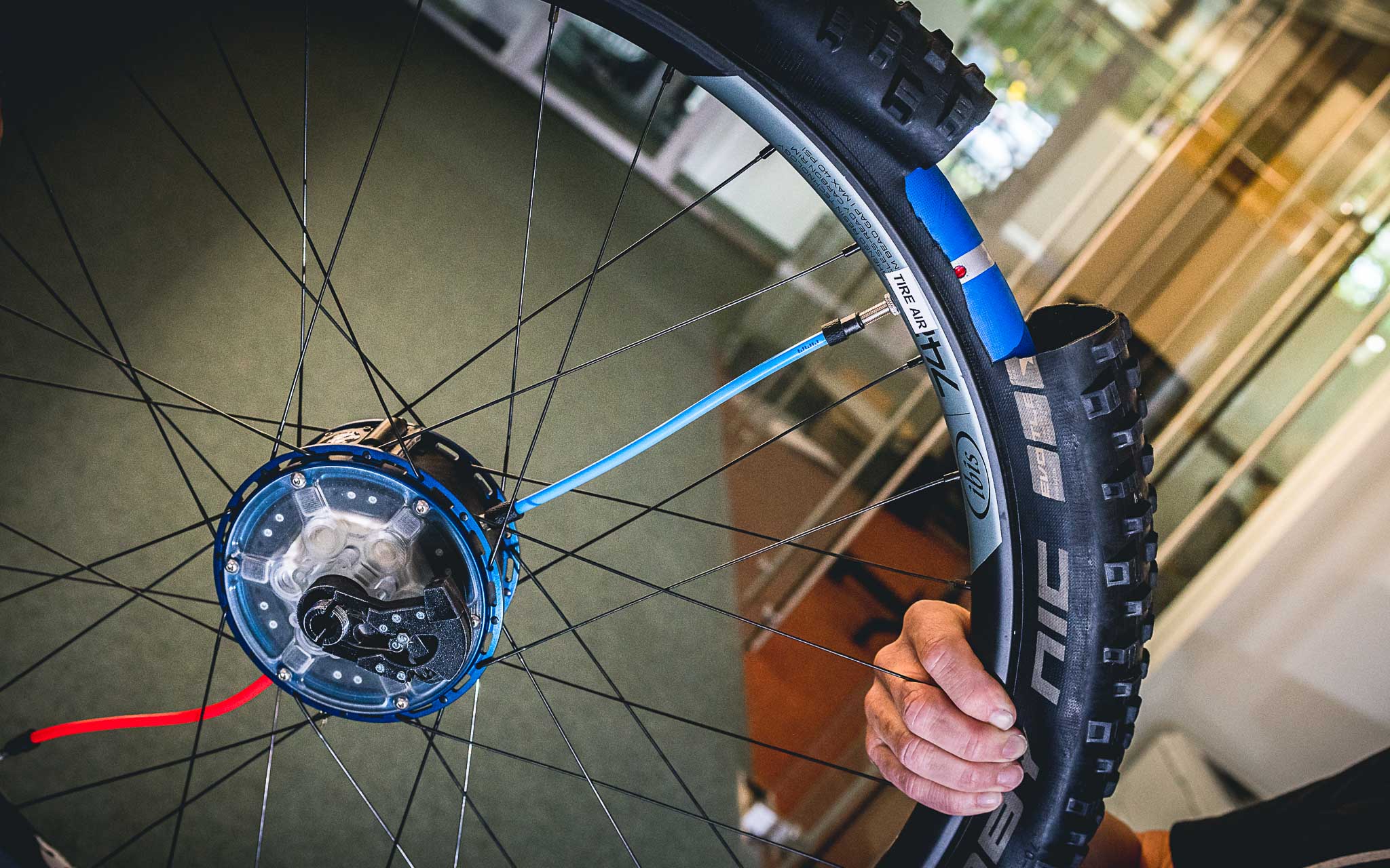Concrètement, le système est composé d’une pompe au principe unique et breveté basé sur un excentrique débrayable (de sorte qu’il n’y ait pas de frottements quand on ne s’en sert pas). Dans le pneu, un système de type Procore gonflé à 5 bars joue le rôle de réserve d’air et de protection de la jante, alors qu’une commande à deux positions située sur le guidon permet de transférer l’air du Procore au pneu ou inversement pour faire varier la pression. Le moyeu joue le rôle d’intermédiaire ainsi que de pompe et il est relié au Procore ainsi qu’au pneu par deux tuyaux indépendants.