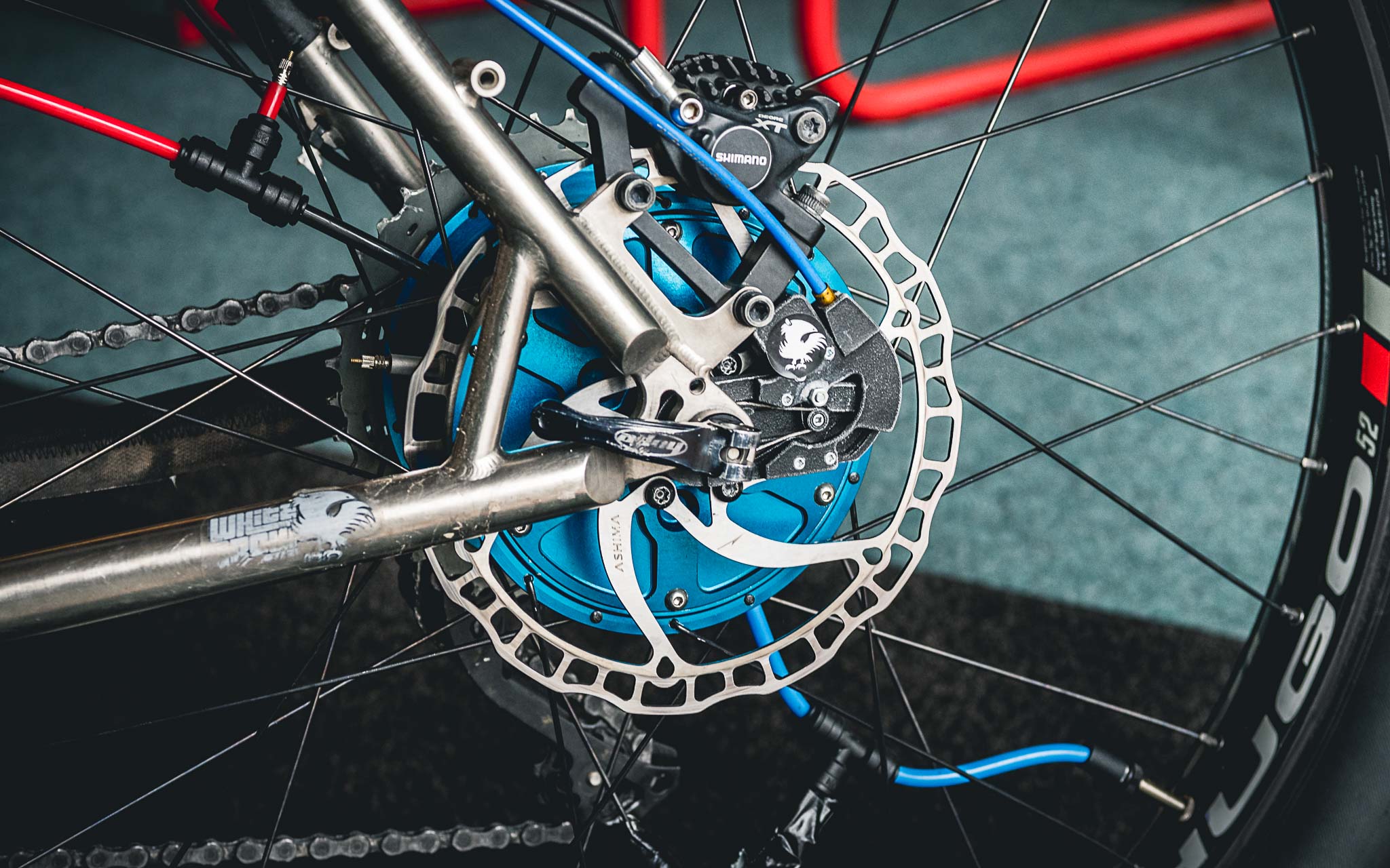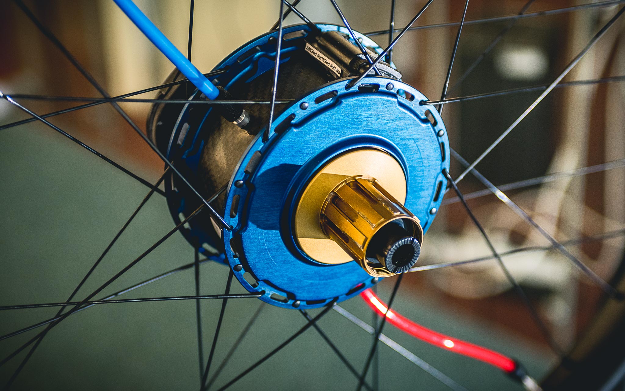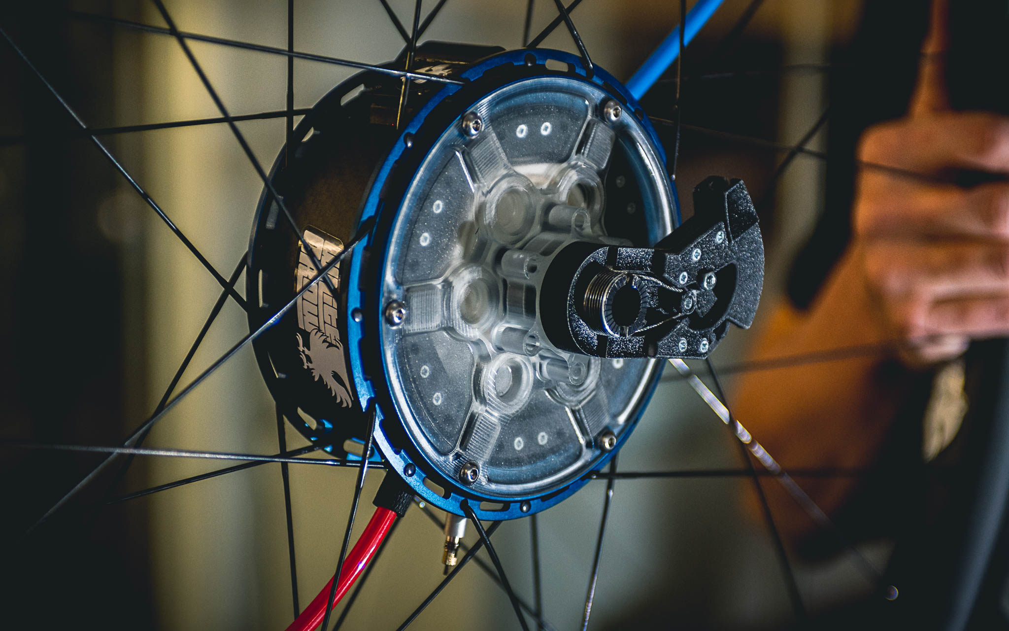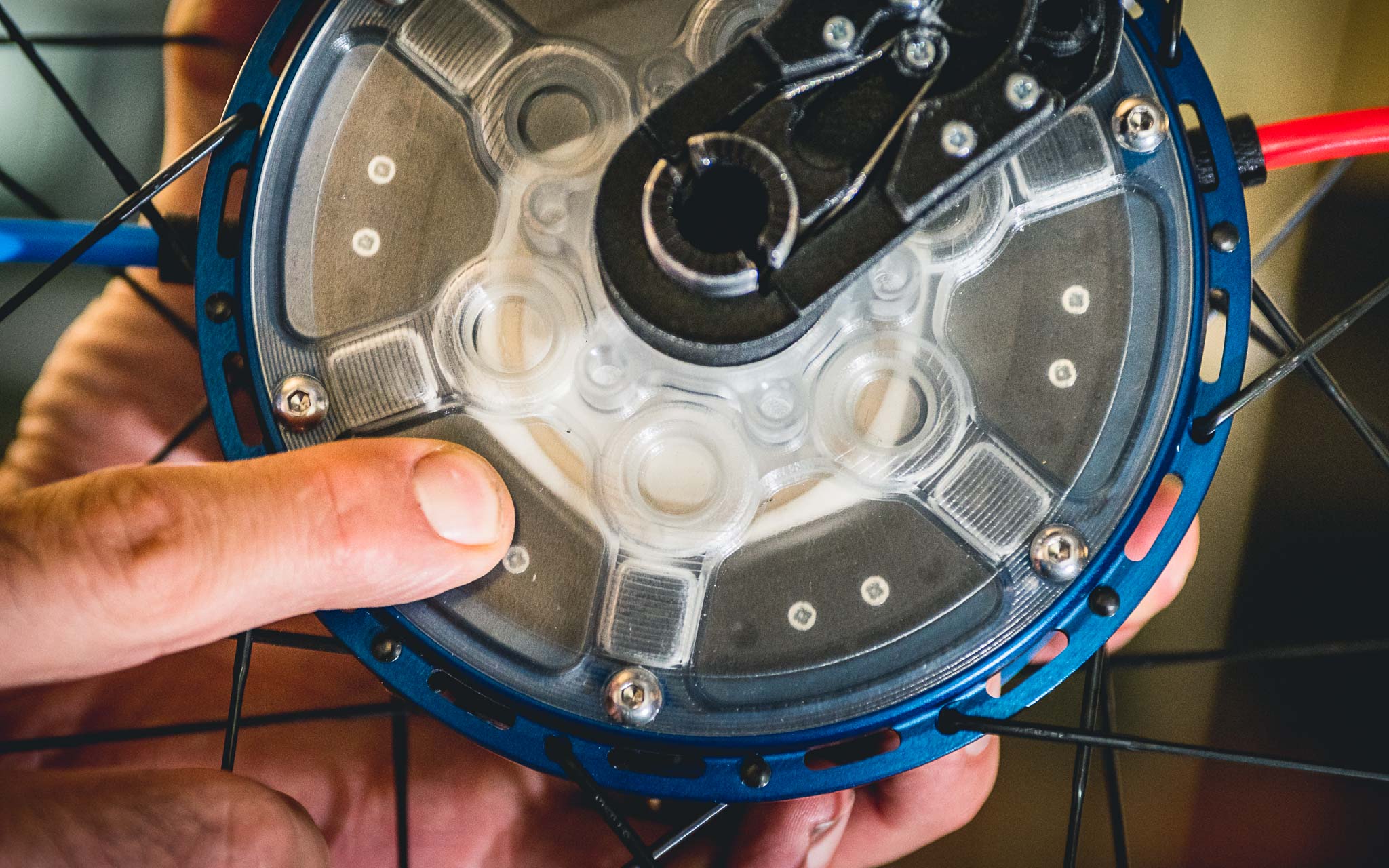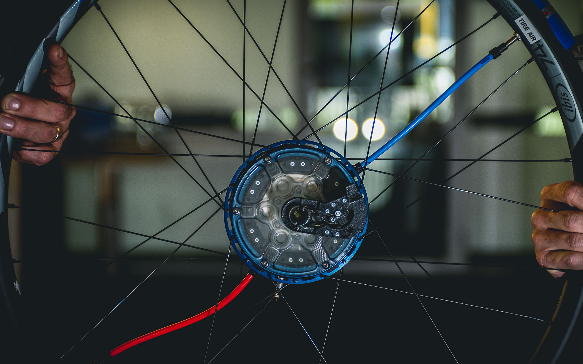 La réalisation du moyeu, en alu 7075 et carbone, est superbe et fait appel à des technologies de pointe, ainsi qu’au savoir-faire d’entreprises essentiellement belges et exclusivement européennes habituées à travailler dans les secteurs aux exigences les plus élevées (aéronautique, médical,…). « La pompe est hyper compacte mais à l’échelle d’un moyeu, elle nécessite d’utiliser le moindre millimètre disponible. Surtout dans un moyeu Boost, car nous proposons notre moyeu pour fatbike mais aussi au format 148×12. Après, cela a aussi des effets bénéfiques car comme les flasques sont hautes et le plus espacées possible, la géométrie du moyeu est optimale et cela aide à monter des roues bien rigides. »