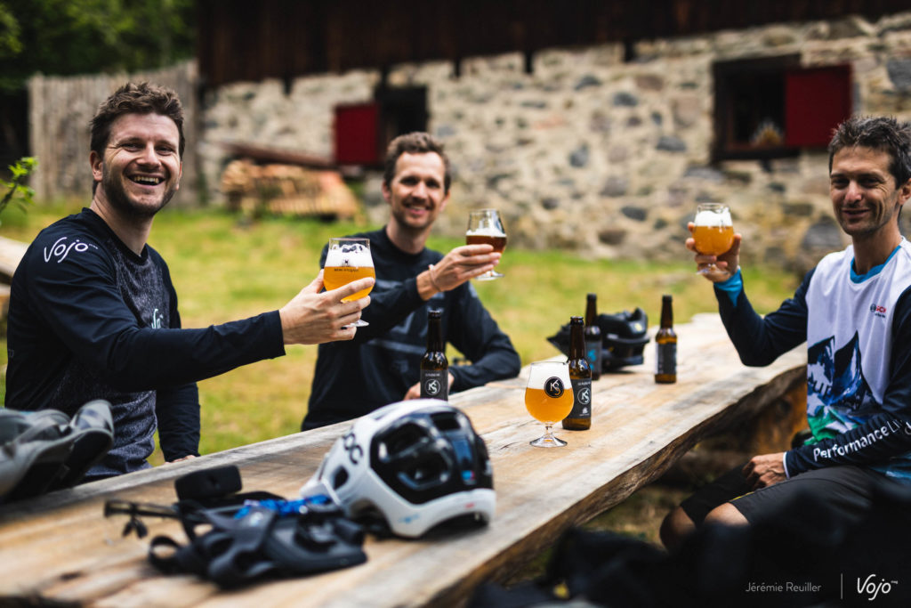Pour ceux qui en doutaient, on a quand même vachement donné au niveau physique. Avec les bras, bien sûr, mais aussi les jambes et dans tout le corps (coucou les abdos), car la région est exigeante, et on ne s’avale pas 70 bornes et 3600m de d+ (et de d- !) sans muscles ! Et du côté de la machine, on a consommé environ 1,2kWh par personne. Soit l’équivalent du fonctionnement d’un aspirateur pendant 1h, ou d’un four pendant 1/2h. Ce qui reste, vous en conviendrez, plus qu’acceptable. Enfin, n’oublions pas un point important : la convivialité. L’e-bike s’est encore une fois montré comme un magnifique outil pour gommer les différences de niveau entre membres d’un même groupe, pour prendre le temps de s’arrêter et de savourer les endroits qui en valent la peine tout en sachant qu’ensuite on va pouvoir passer plus vite les chemins larges, bouts de montée sur route et autres passages physiques mais moins intéressants à d’autres aspects.