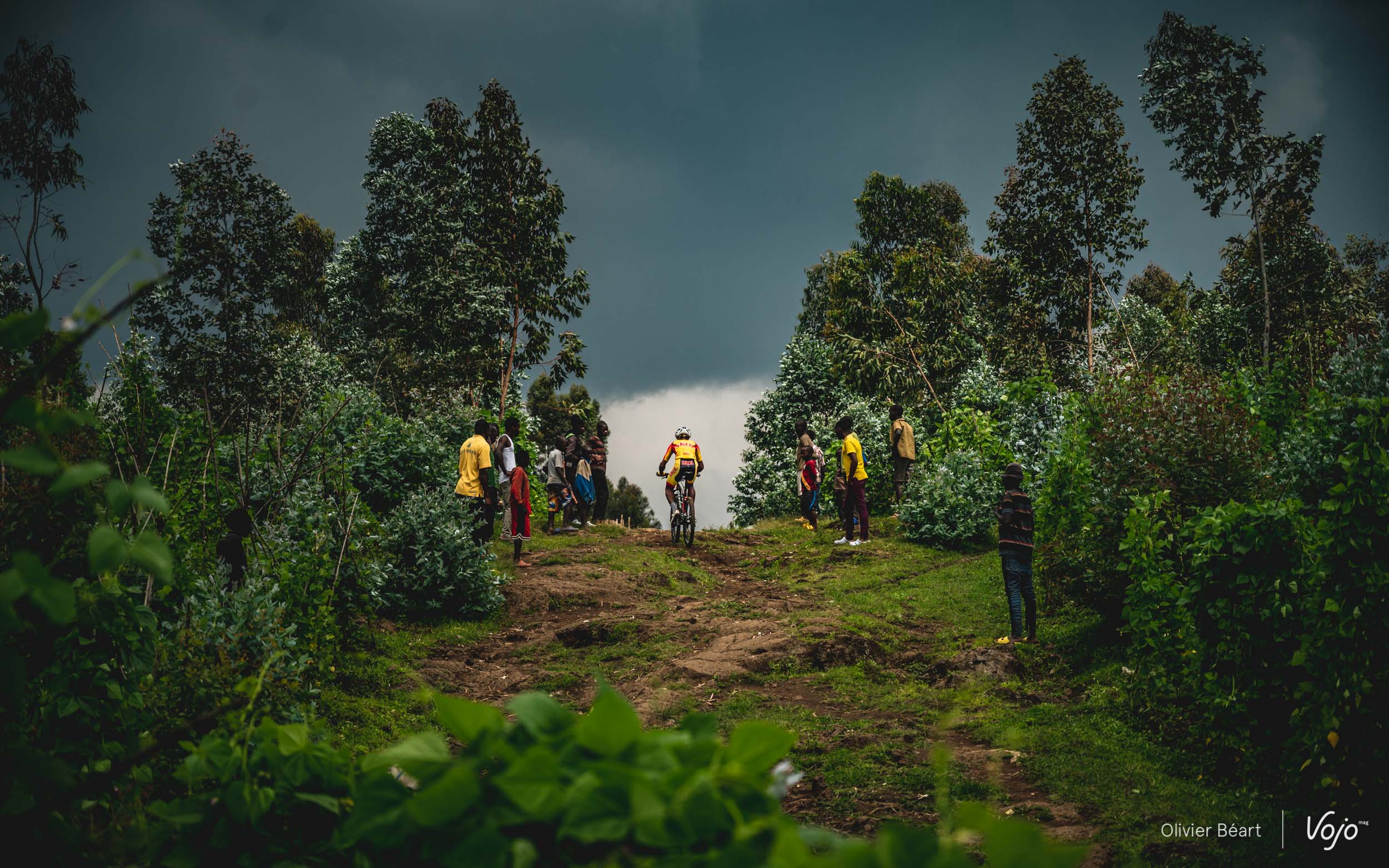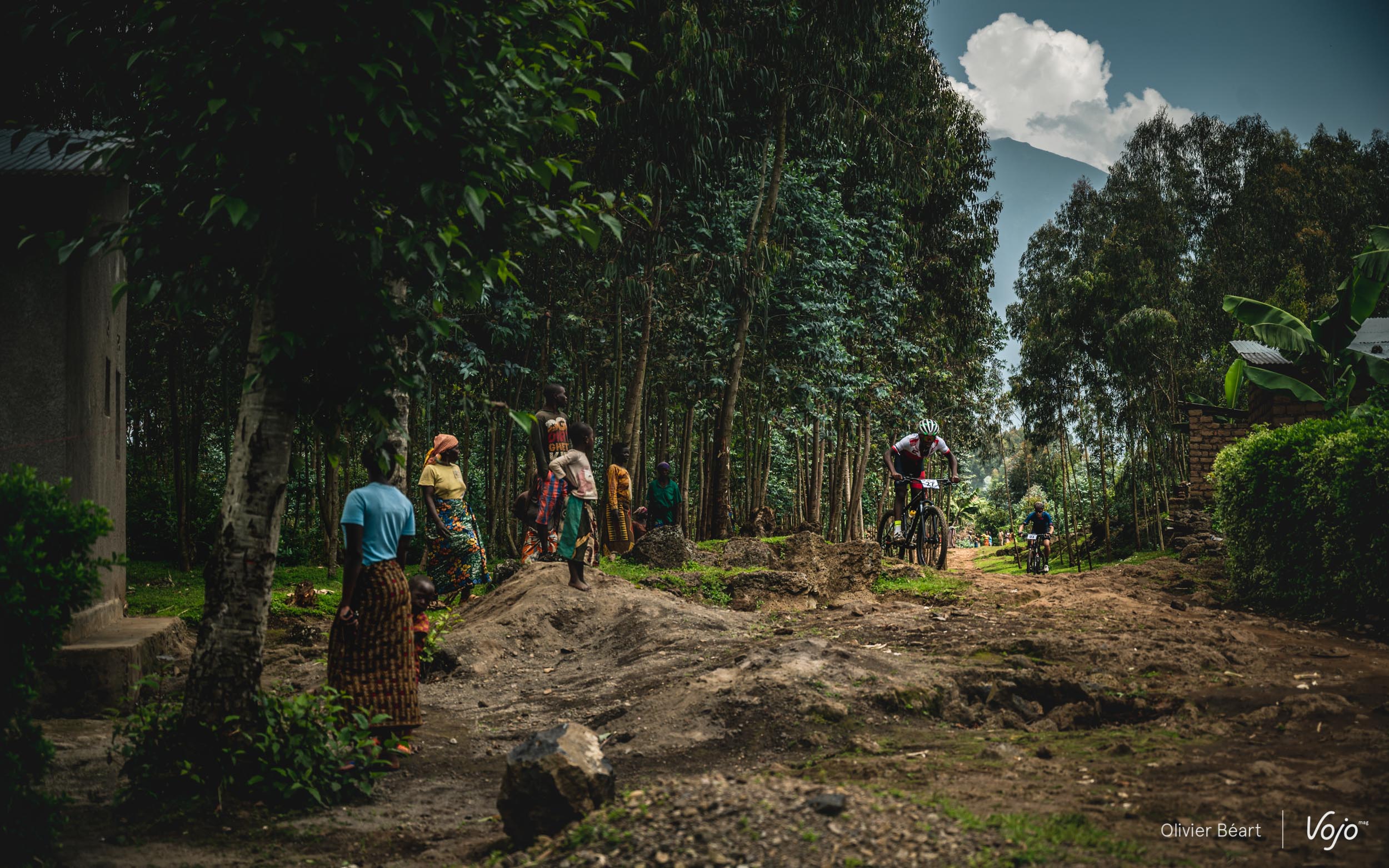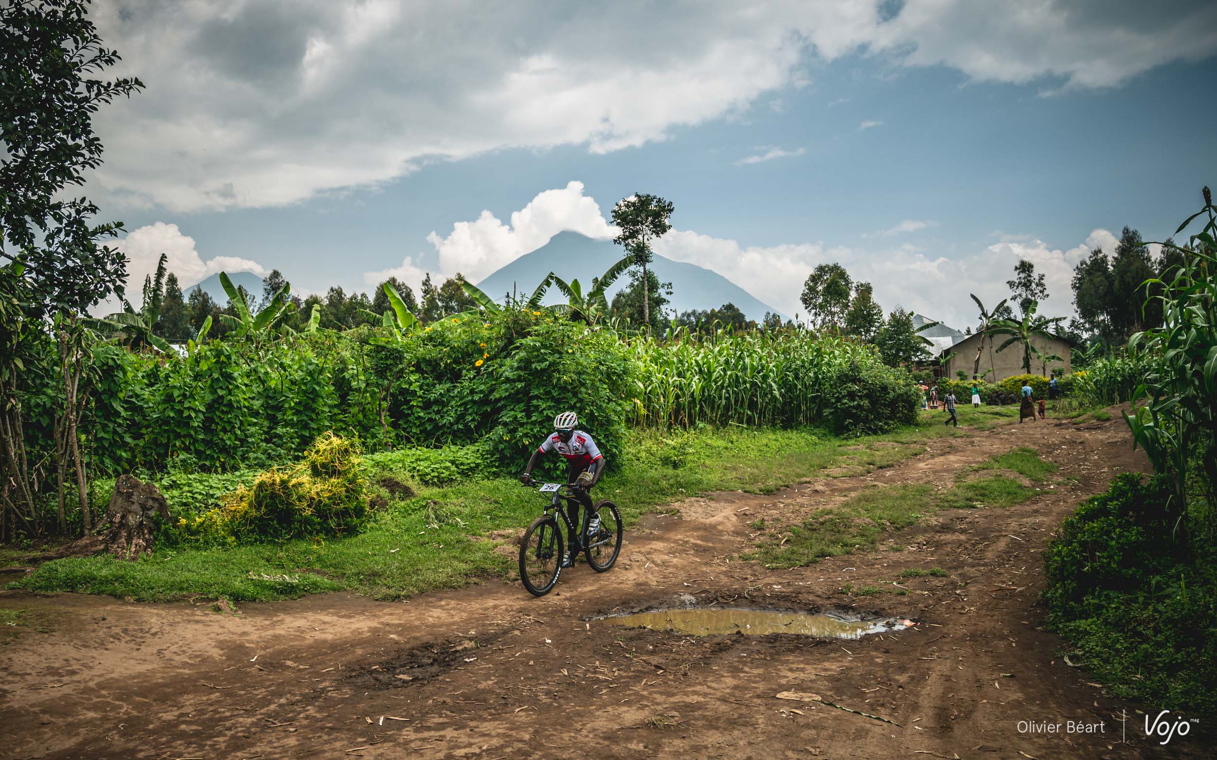 On l’a dit, le parcours a été tracé sous forme d’une longue boucle de 13km au pied des volcans. Pas de dénivelé impressionnant au programme ici car on reste dans les plaines d’altitude, qu’on appelle aussi le potager du Rwanda, mais on a ici une succession de chemins cassants qui imposent d’être toujours actif sur le vélo et très attentif pour ne pas se faire surprendre.